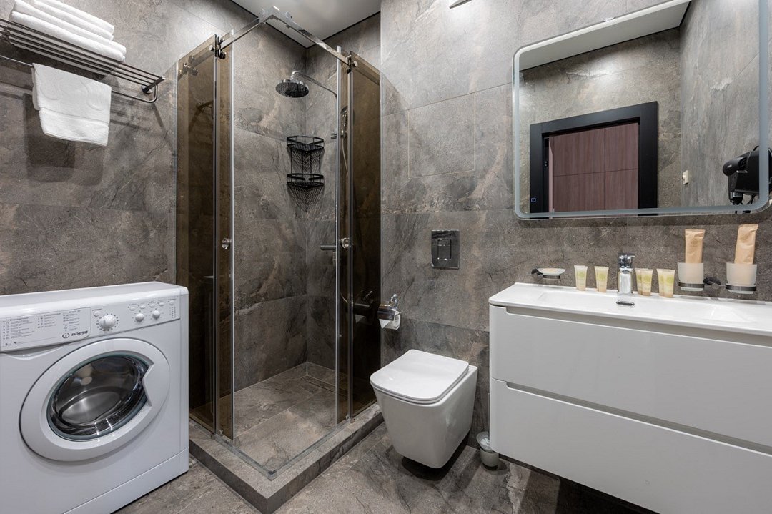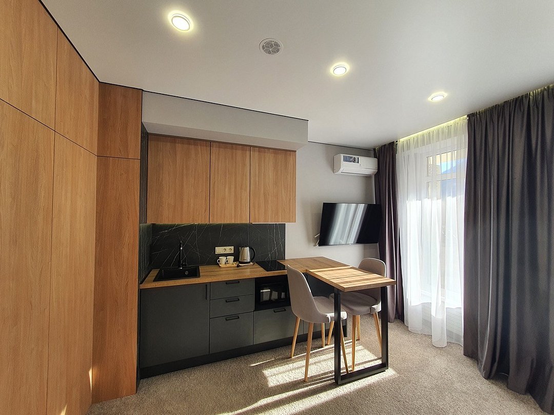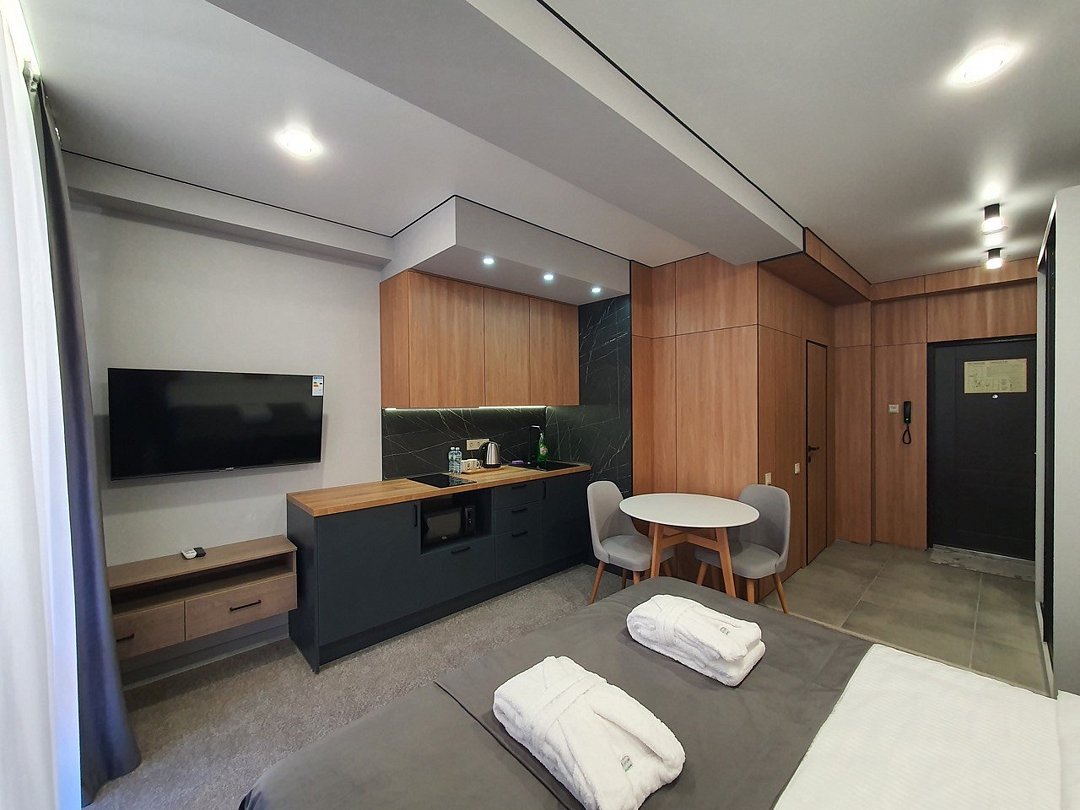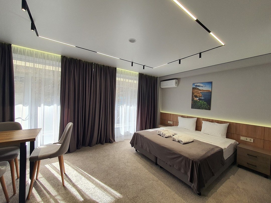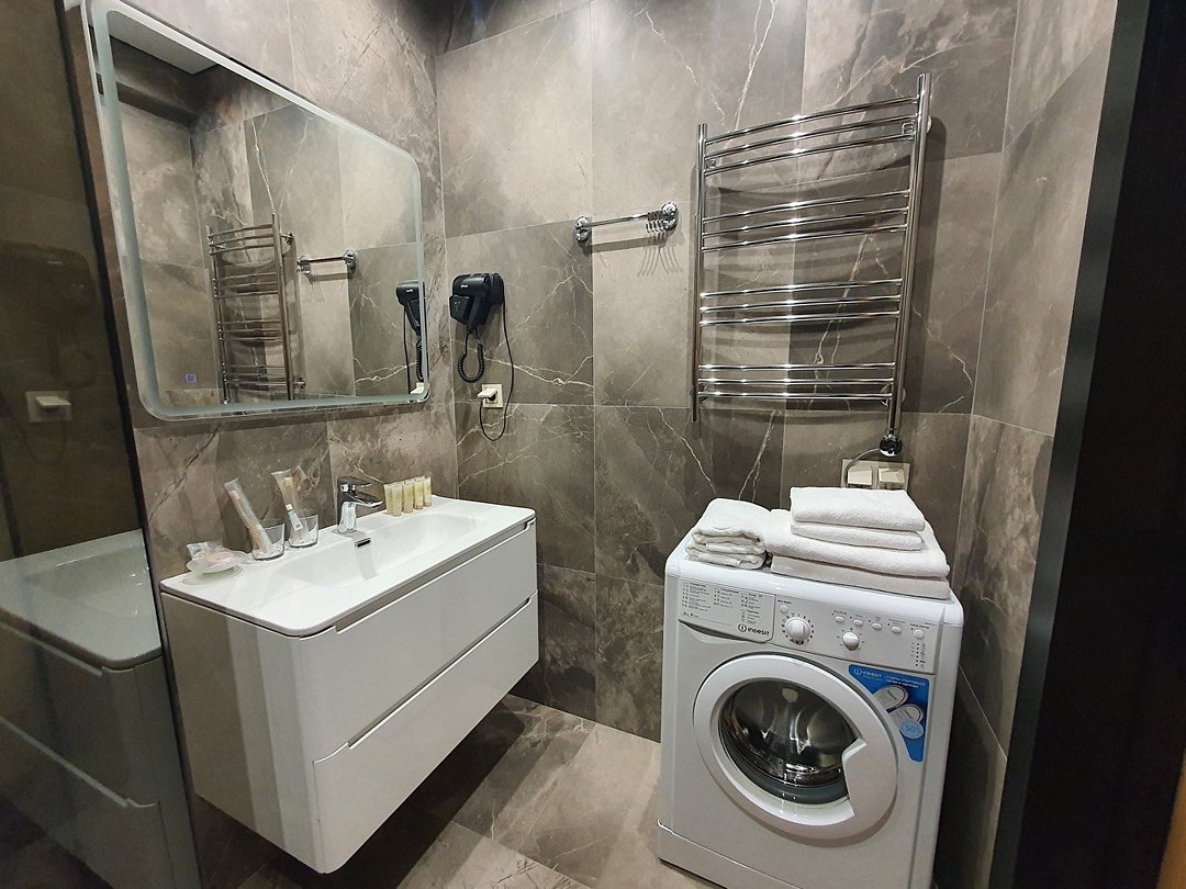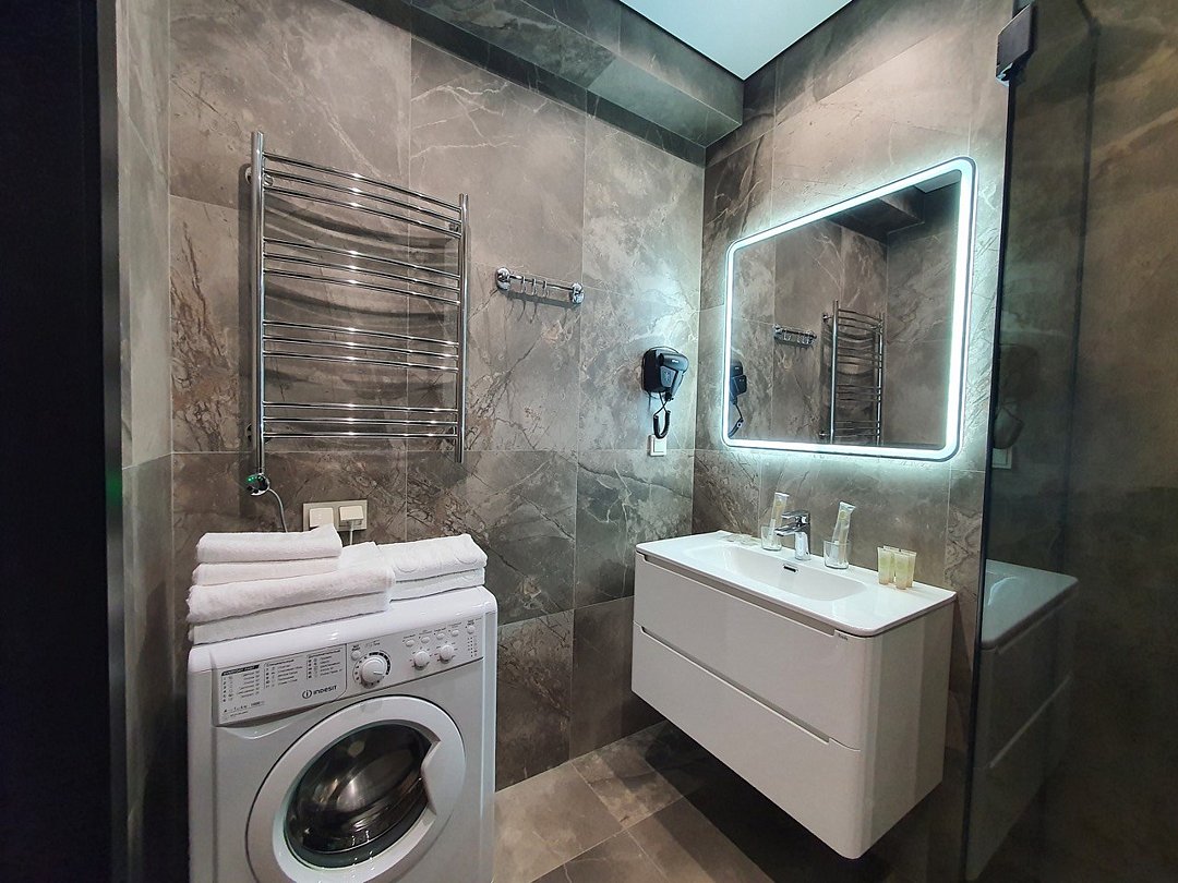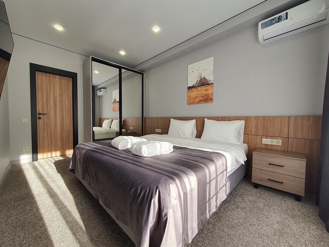 Апартаменты отеля идеально сочетают в себе современный дизайн и комфорт. В каждом номере вы найдете все необходимое для приятного отдыха. Это современный телевизор, просторный шкаф для вещей, сплит-система. Ванная комната в каждом номере предлагает полный набор удобств, включая душевую кабину и свежие полотенца, установлена стиральная машина, Дополнительно предоставляется утюг и гладильная доска.