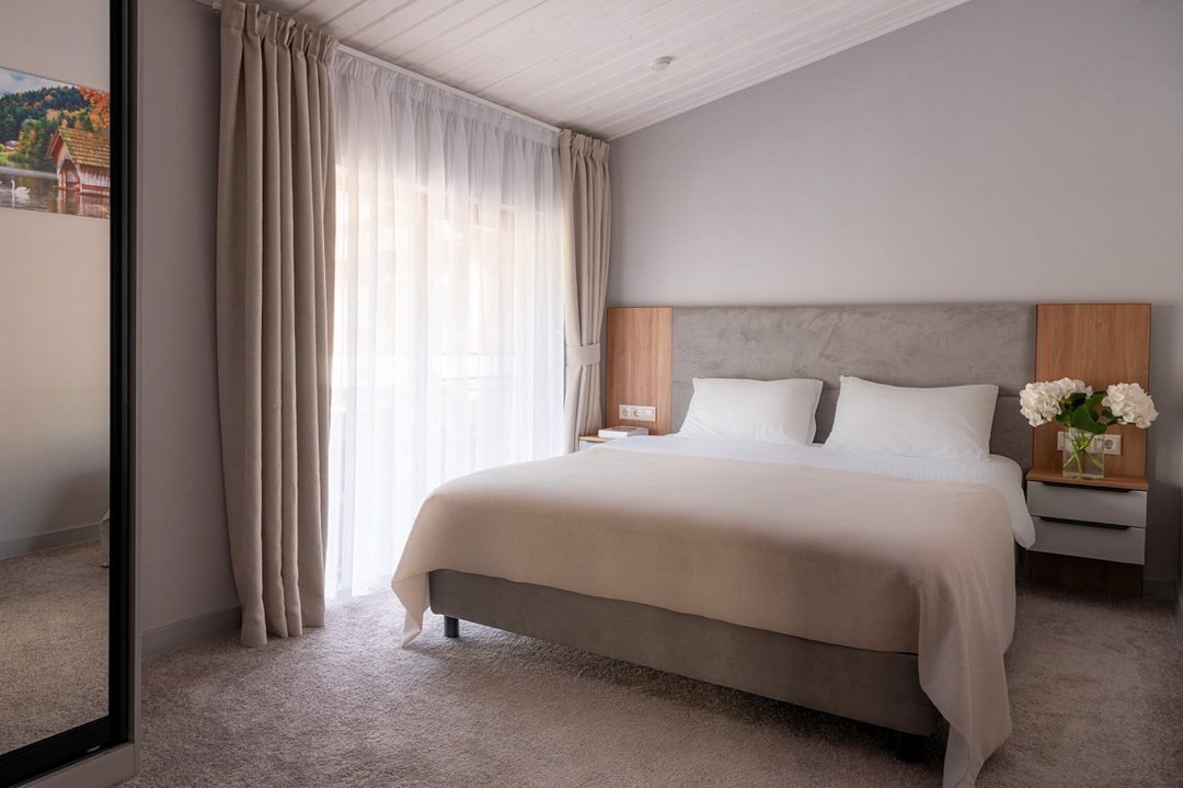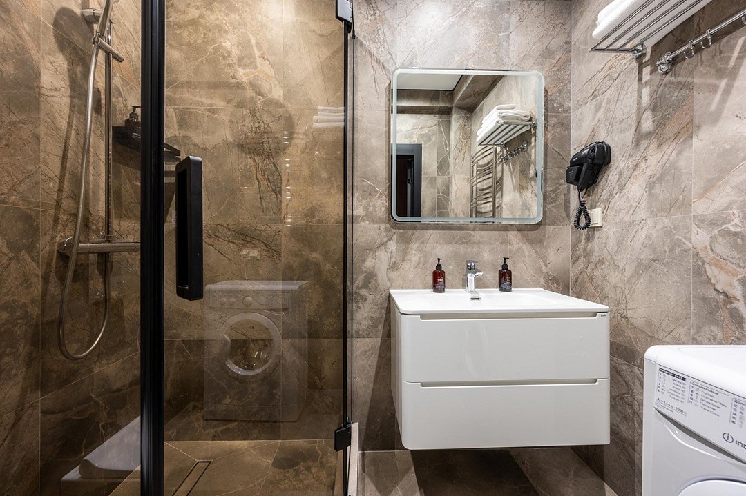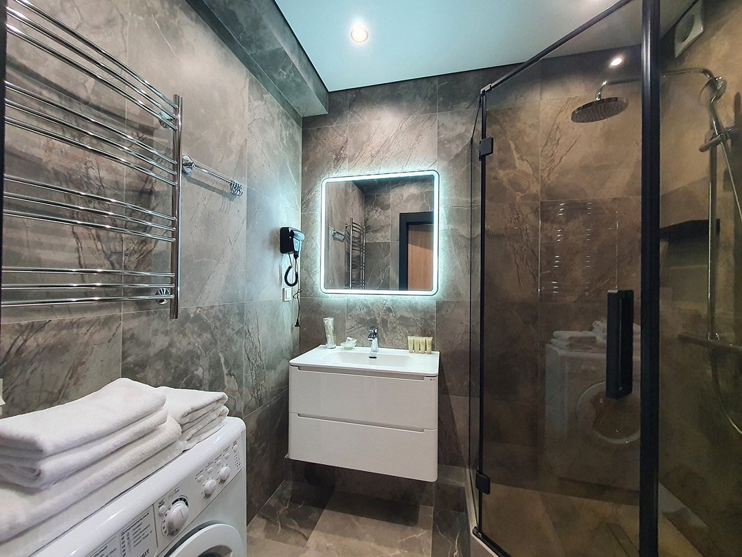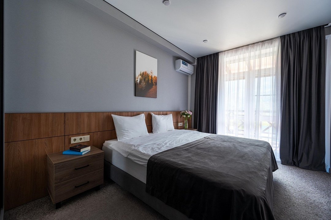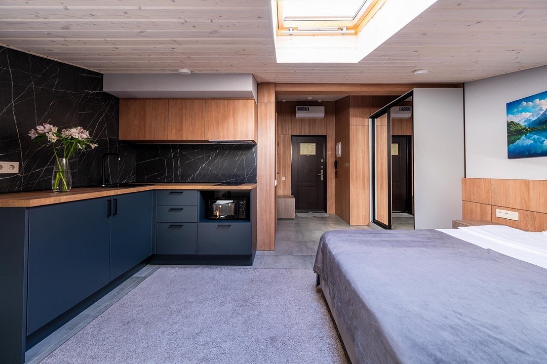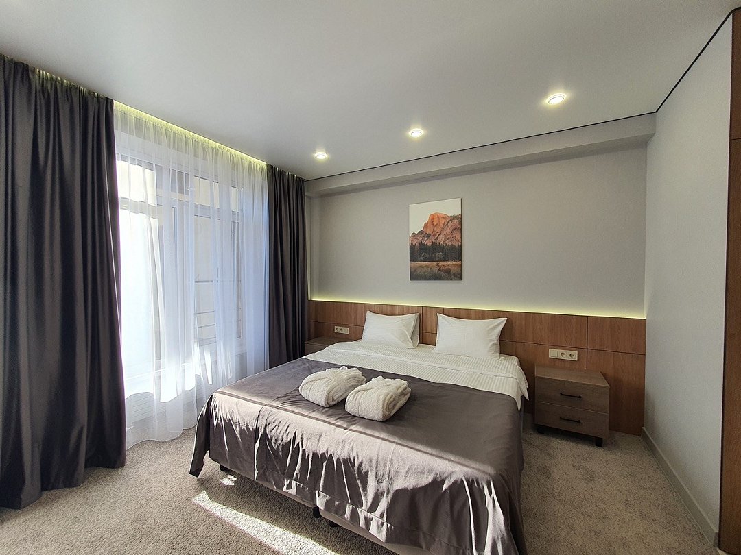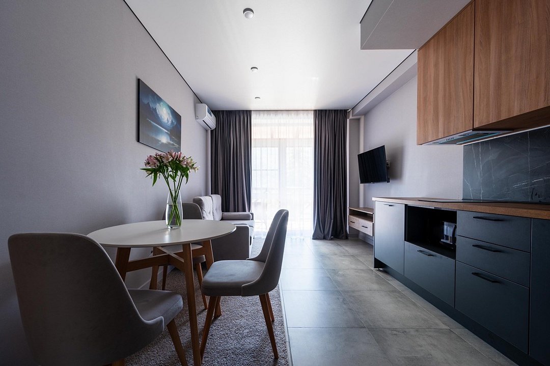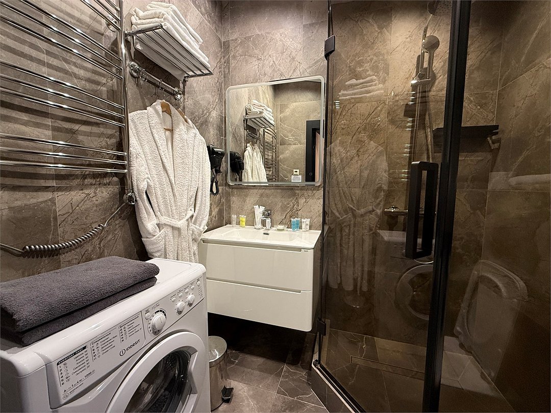 Апартаменты отеля идеально сочетают в себе современный дизайн и комфорт. В каждом номере вы найдете все необходимое для приятного отдыха. Это современный телевизор, просторный шкаф для вещей, сплит-система. Ванная комната в каждом номере предлагает полный набор удобств, включая душевую кабину и свежие полотенца, установлена стиральная машина, Дополнительно предоставляется утюг и гладильная доска.