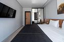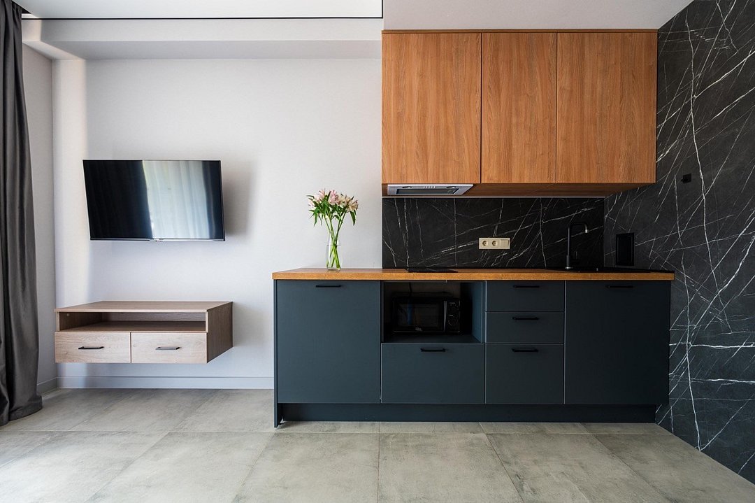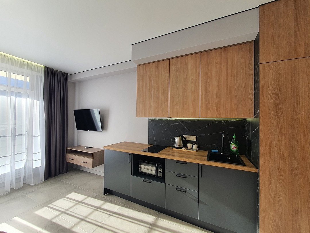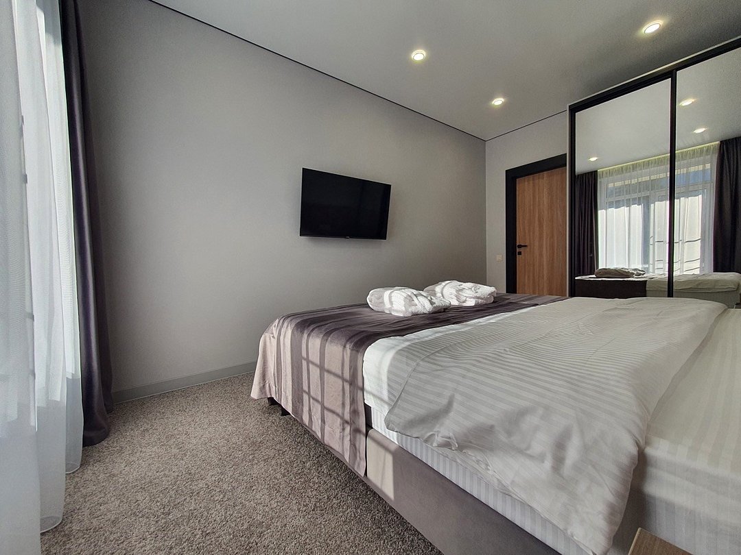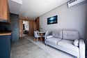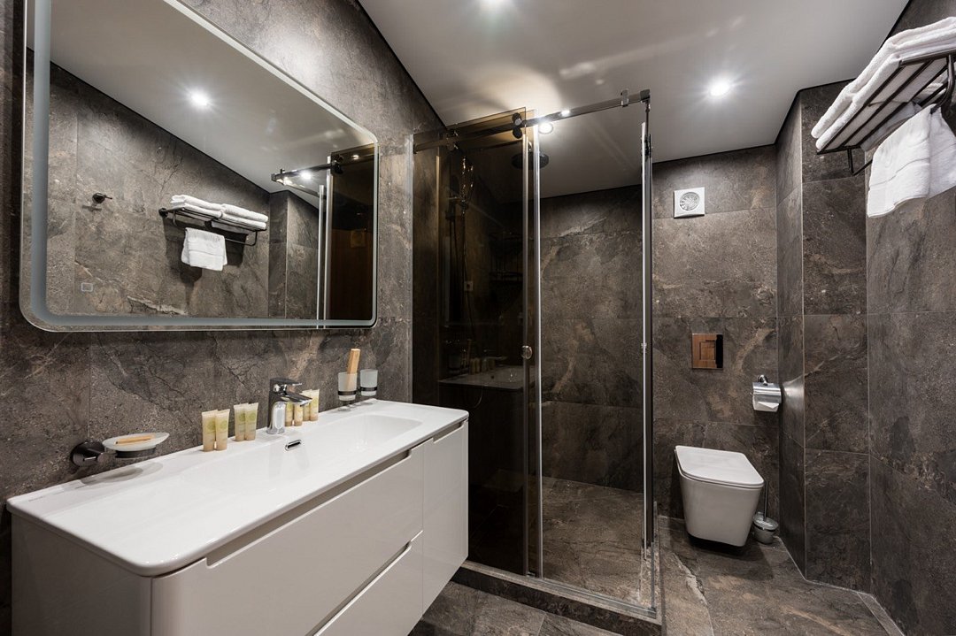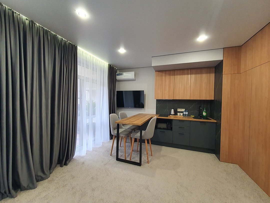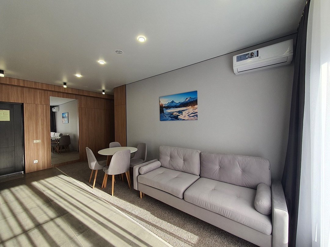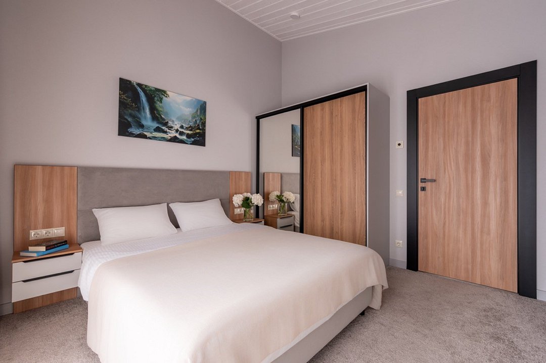 Апартаменты отеля идеально сочетают в себе современный дизайн и комфорт. В каждом номере вы найдете все необходимое для приятного отдыха. Это современный телевизор, просторный шкаф для вещей, сплит-система. Ванная комната в каждом номере предлагает полный набор удобств, включая душевую кабину и свежие полотенца, установлена стиральная машина, Дополнительно предоставляется утюг и гладильная доска.
