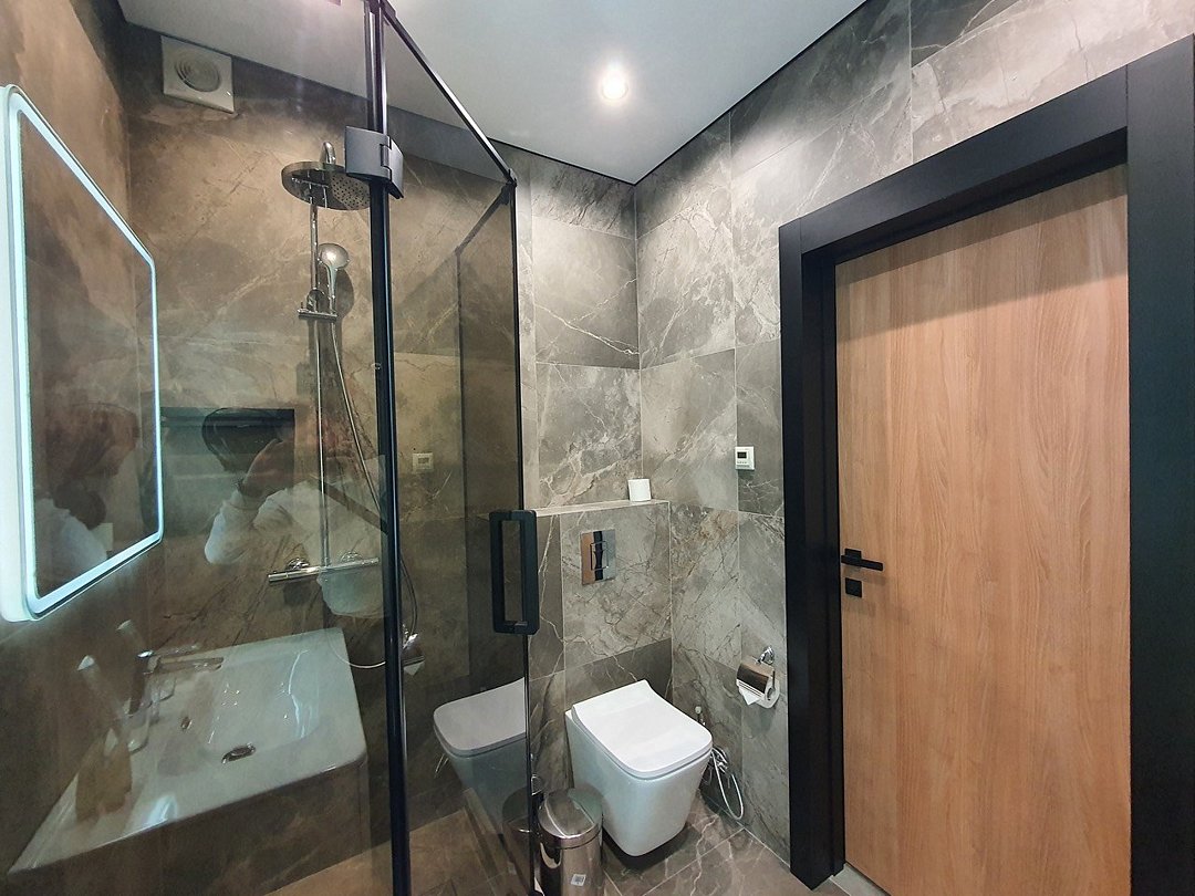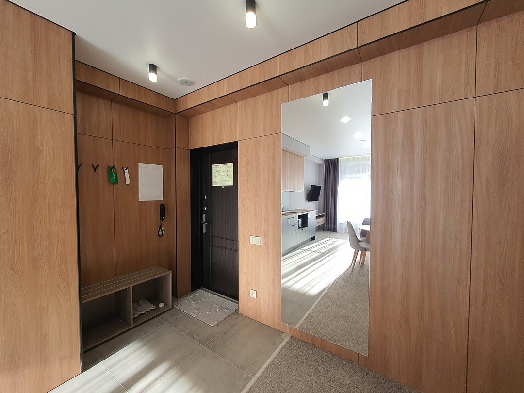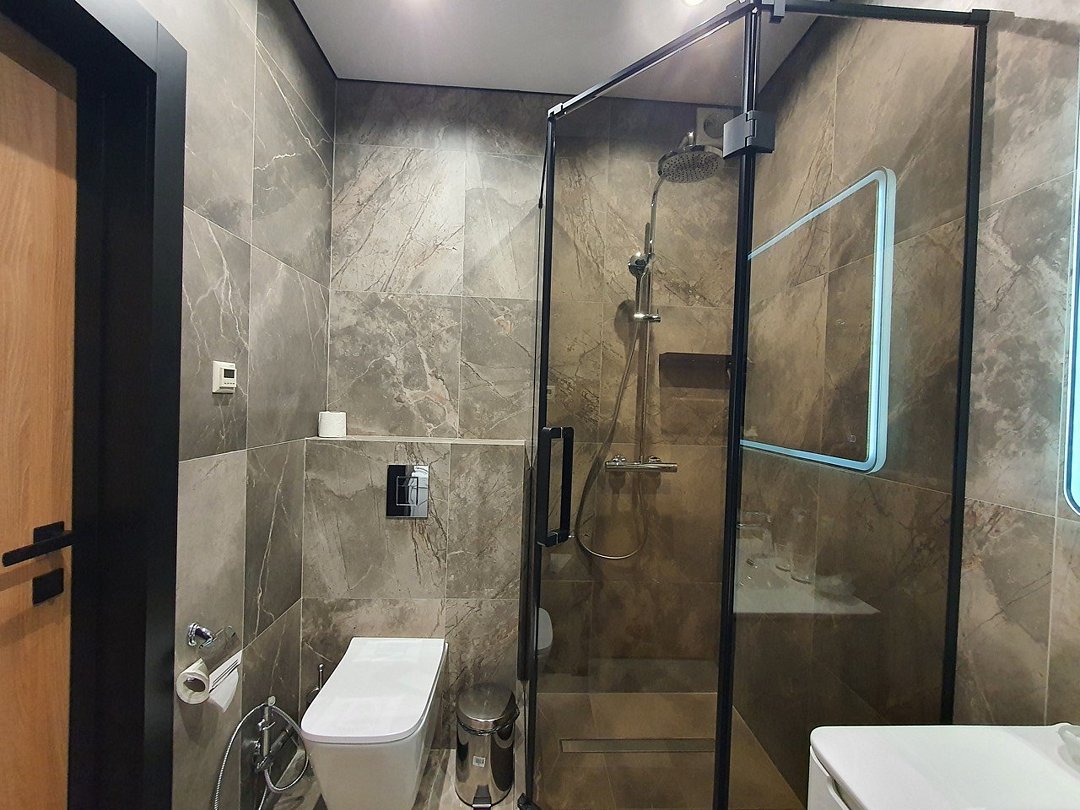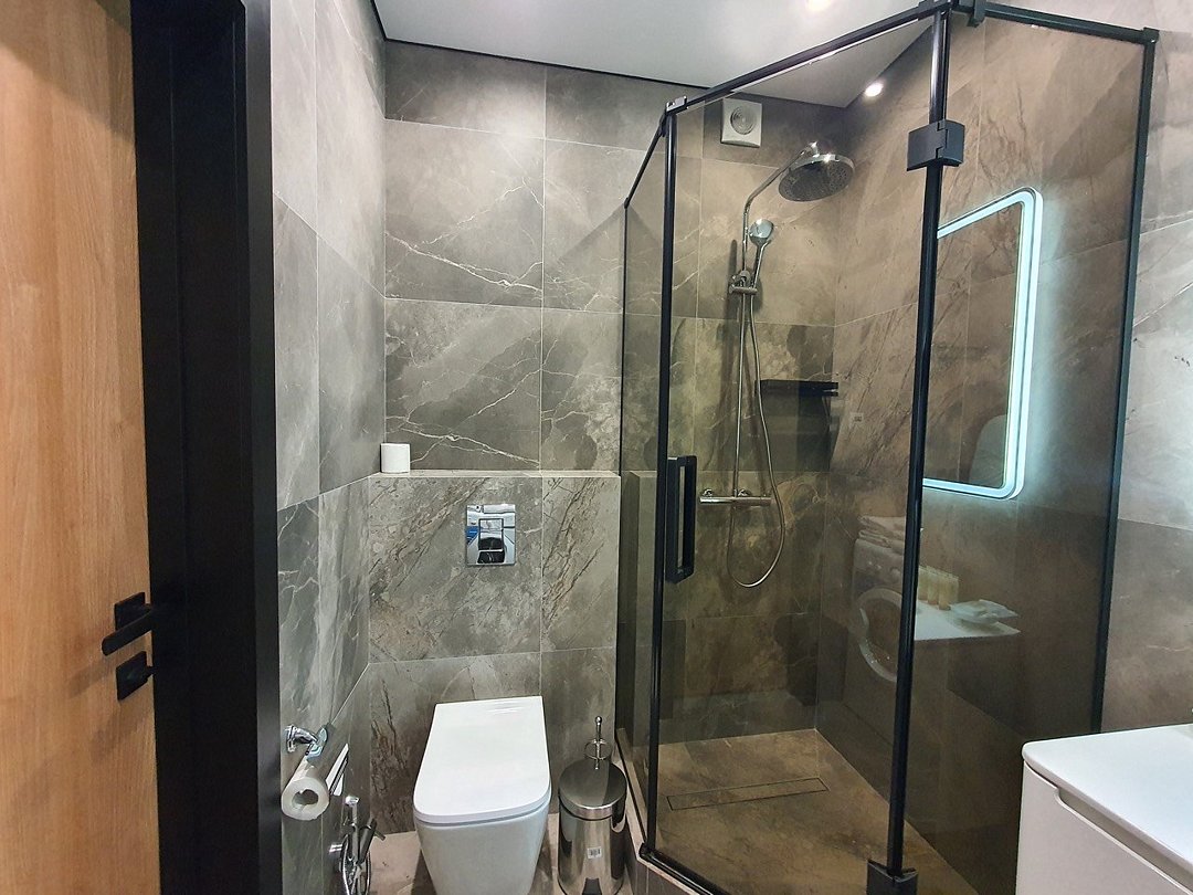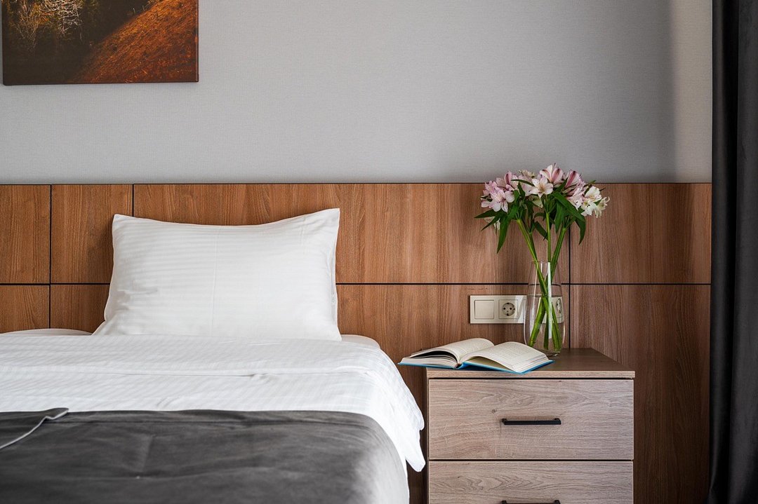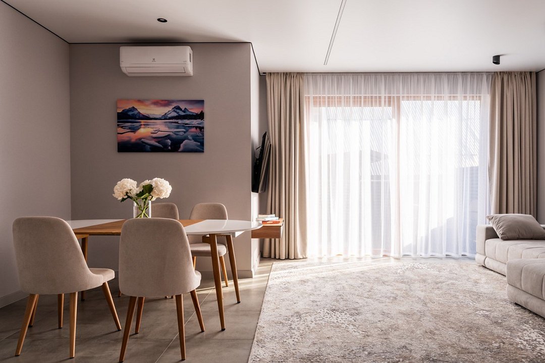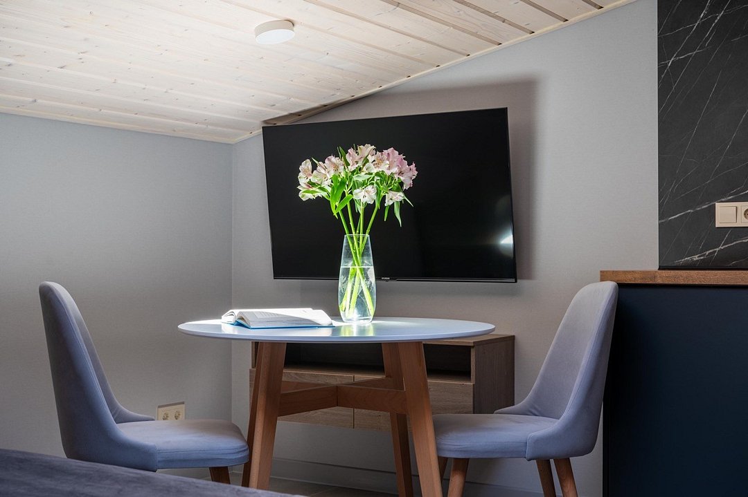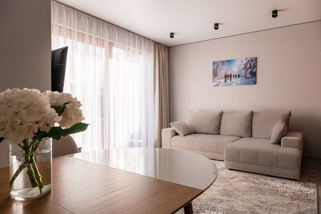 Апартаменты отеля идеально сочетают в себе современный дизайн и комфорт. В каждом номере вы найдете все необходимое для приятного отдыха. Это современный телевизор, просторный шкаф для вещей, сплит-система. Ванная комната в каждом номере предлагает полный набор удобств, включая душевую кабину и свежие полотенца, установлена стиральная машина, Дополнительно предоставляется утюг и гладильная доска.