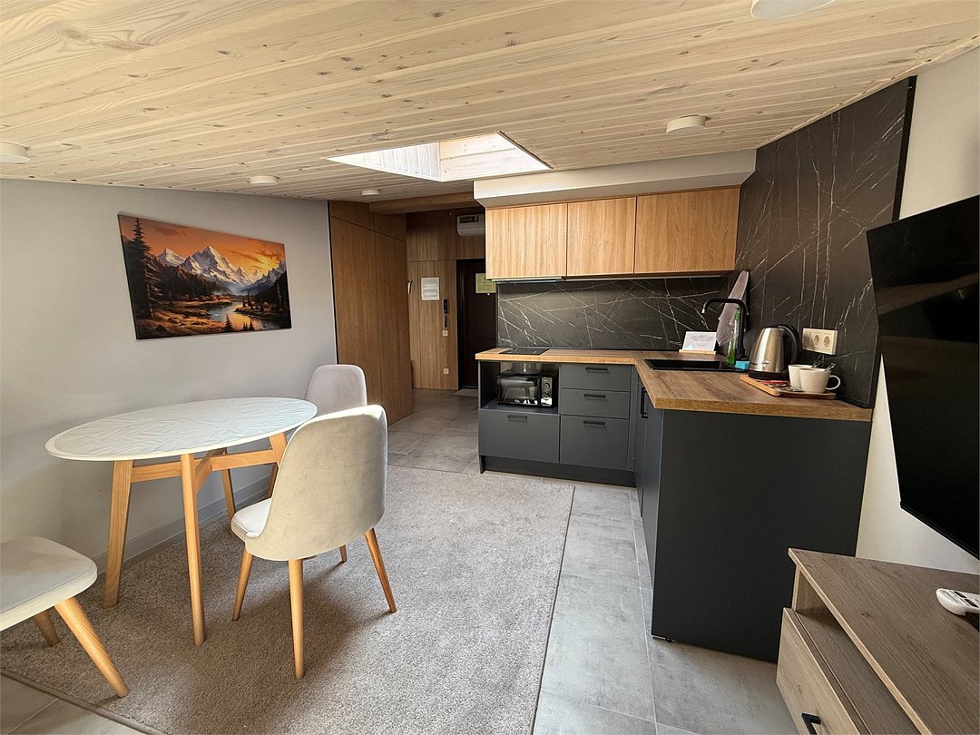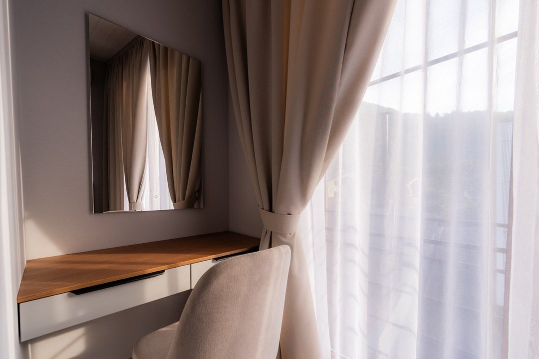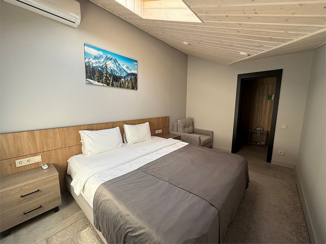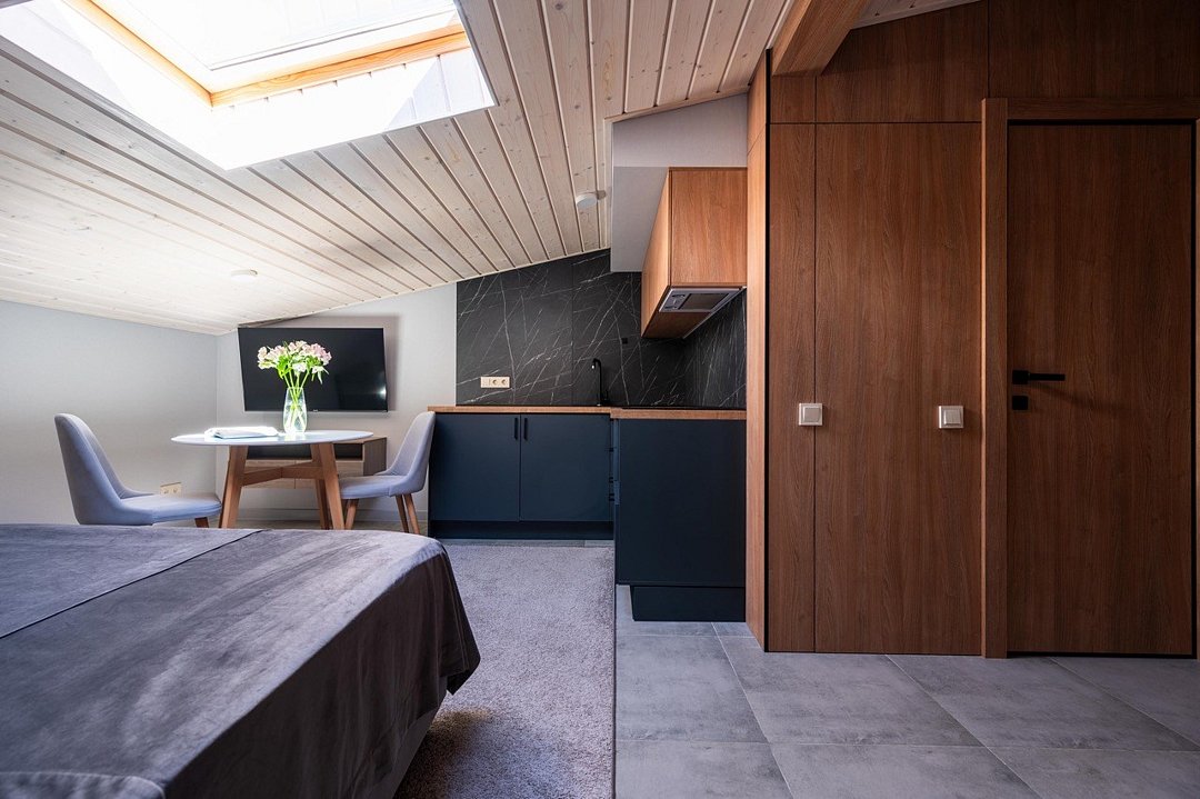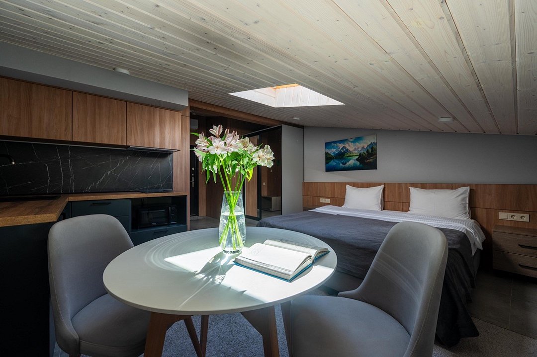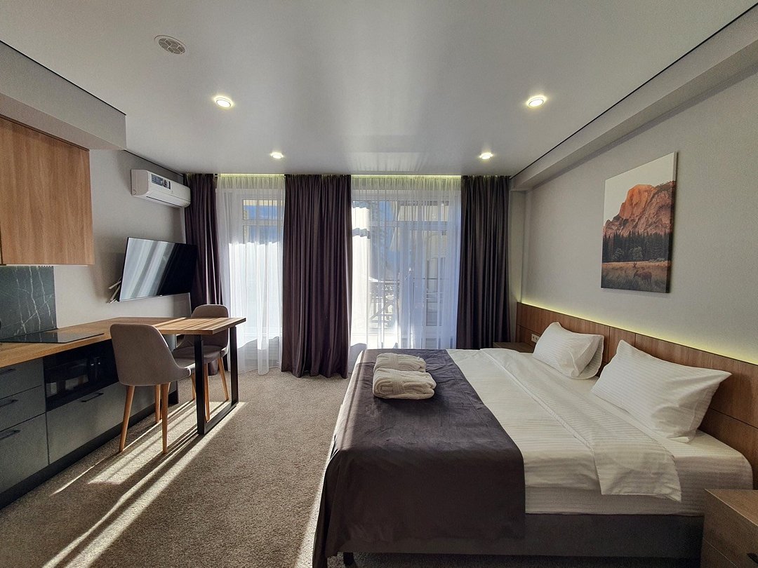Студия станет безупречным выбором для тех, кто ценит комфорт, продуманную функциональность и желает в полной мере ощутить незабываемую атмосферу Красной Поляны. Номера расположены на четвёртом этаже нашего отеля. Изюминкой номеров является наличие мансардного окна.Услуги и удобства