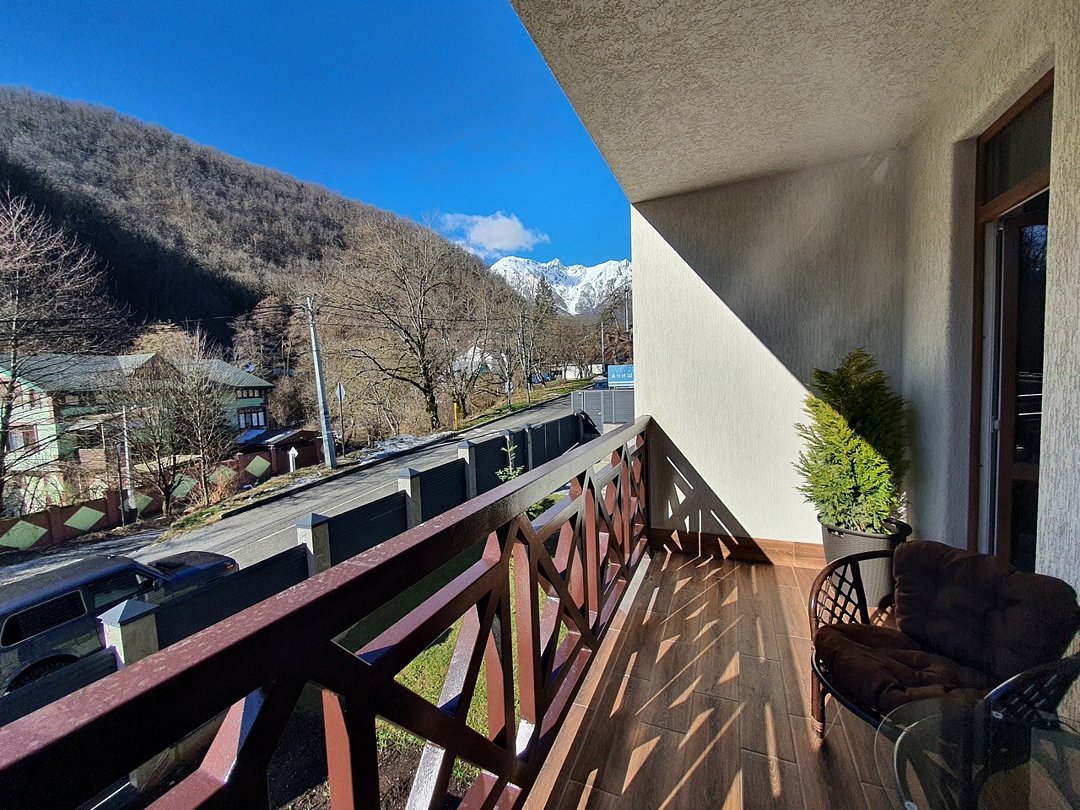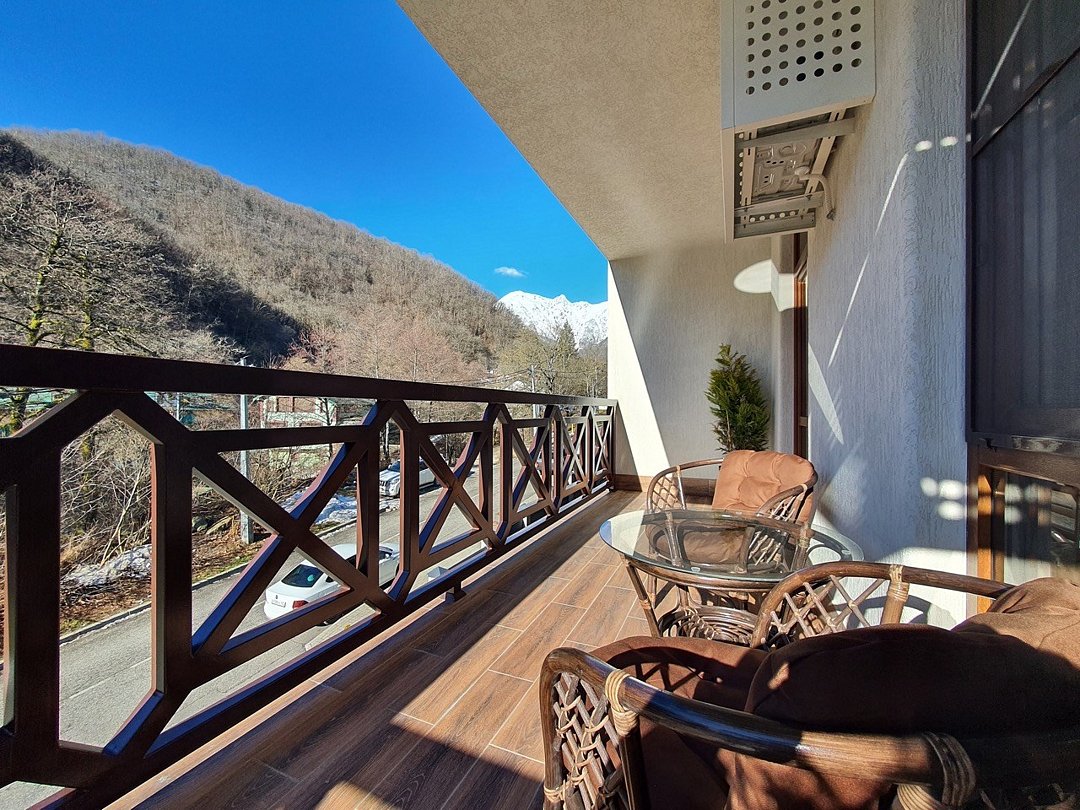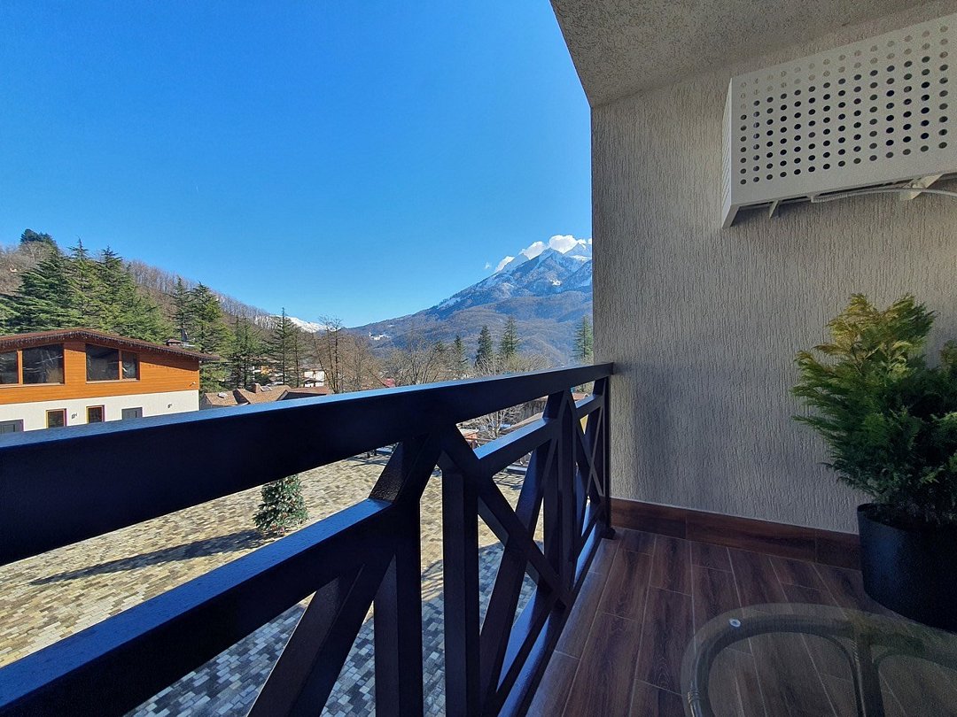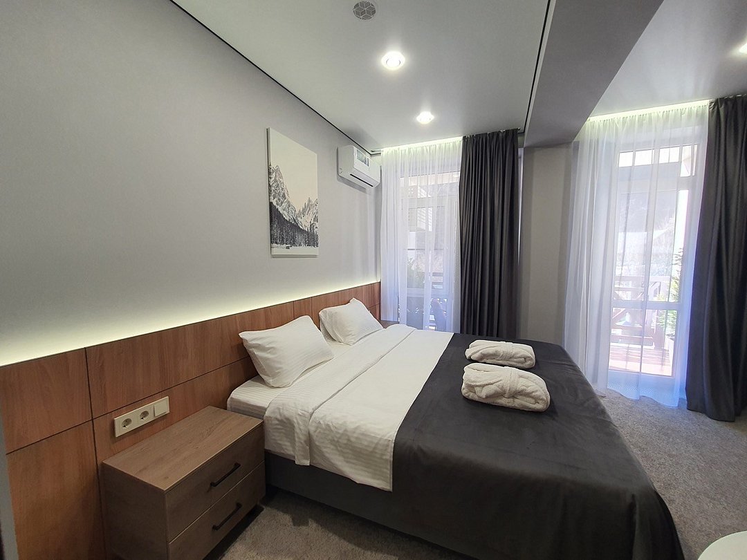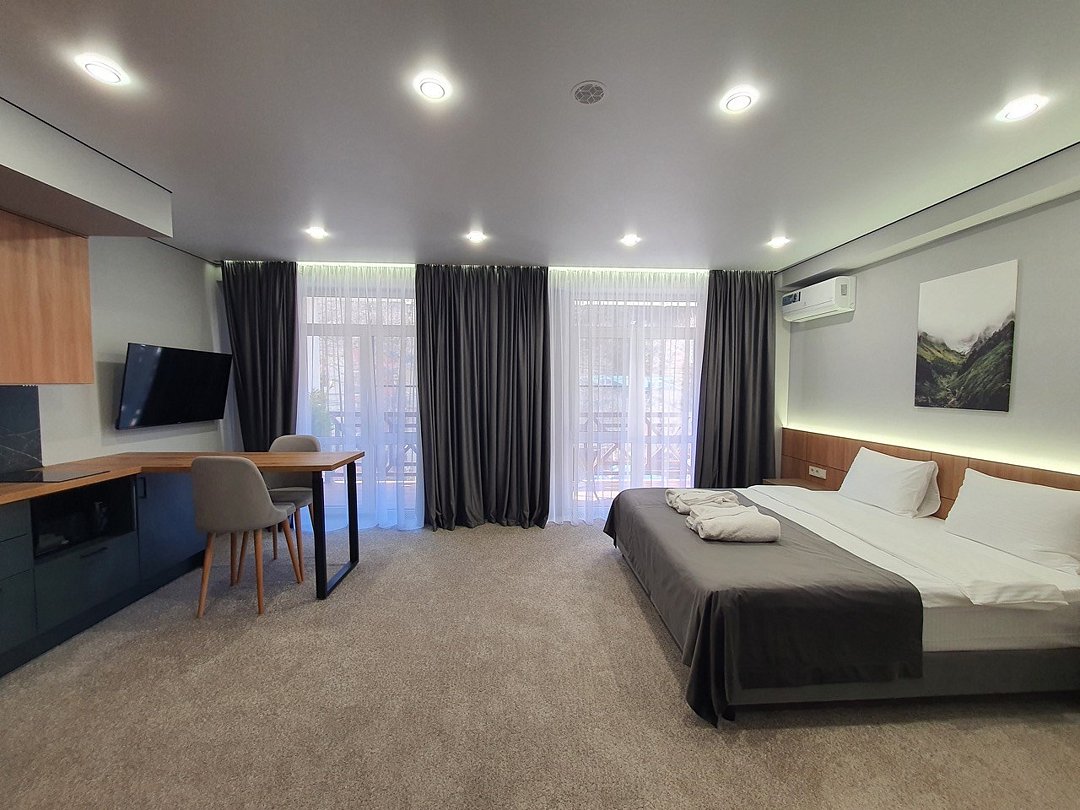 Просторная студия с балконом идеально подходит как для романтического уединения пары, так и для комфортного семейного отдыха. Для вашего максимального удобства кровати в каждом номере легко трансформируются: по желанию их можно объединить в уютное двуспальное ложе или раздвинуть для создания двух отдельных спальных мест. Настоящая жемчужина студии — собственный балкон, откуда открываются захватывающие дух панорамы величественных Кавказских гор, чья непередаваемая красота одинаково впечатляет как летом, так и зимой.Услуги и удобства