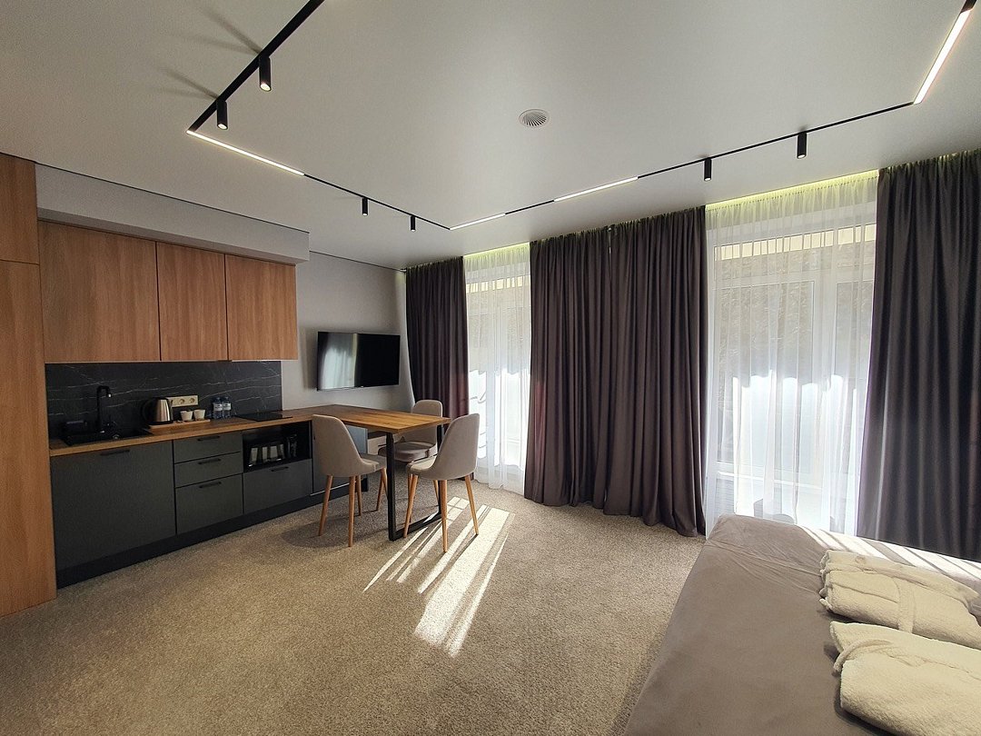 Улучшенная студия обеспечивает расширенное пространство и повышенный уровень комфорта для каждого гостя. Из панорамных окон открывается потрясающий вид, становясь главной изюминкой номера. Ваш уют гарантирован полным оснащением: от стиральной машины до оборудованной кухни со всей необходимой посудой. В качестве дополнительного места используется раскладной диван. Номера данной категории расположены на 1 этаже нашего отеля.Услуги и удобства