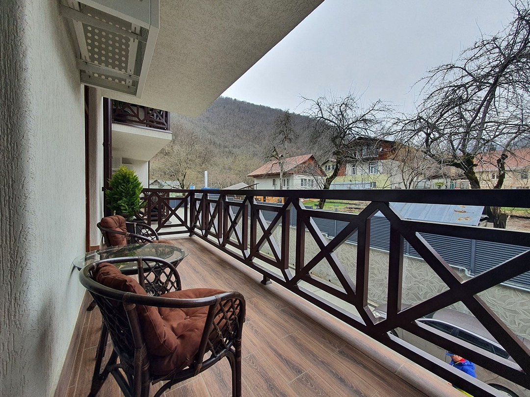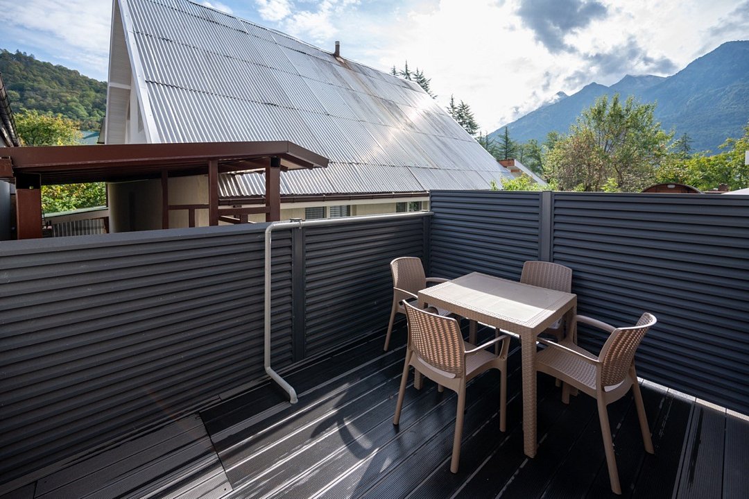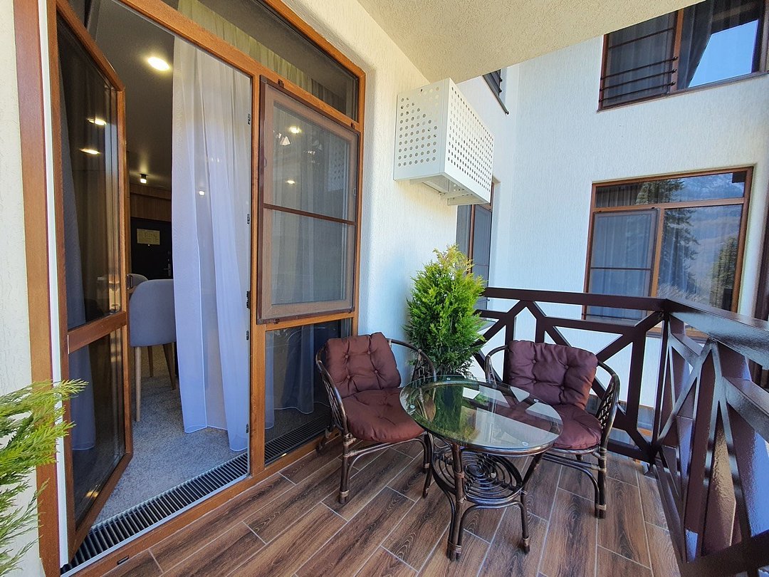 Видовой номер с отдельной спальней и полноценной кухней-гостиной, приспособленной для проживания как летом, так и зимой. На балконе, оборудованном плетеной мебелью и кофейным столиком, можно уютно провести время, любуясь пейзажами. В номере есть все для комфортного проживания: оборудованная кухня, стиральная машина.Услуги и удобства