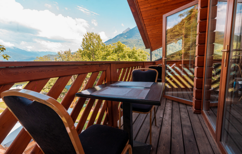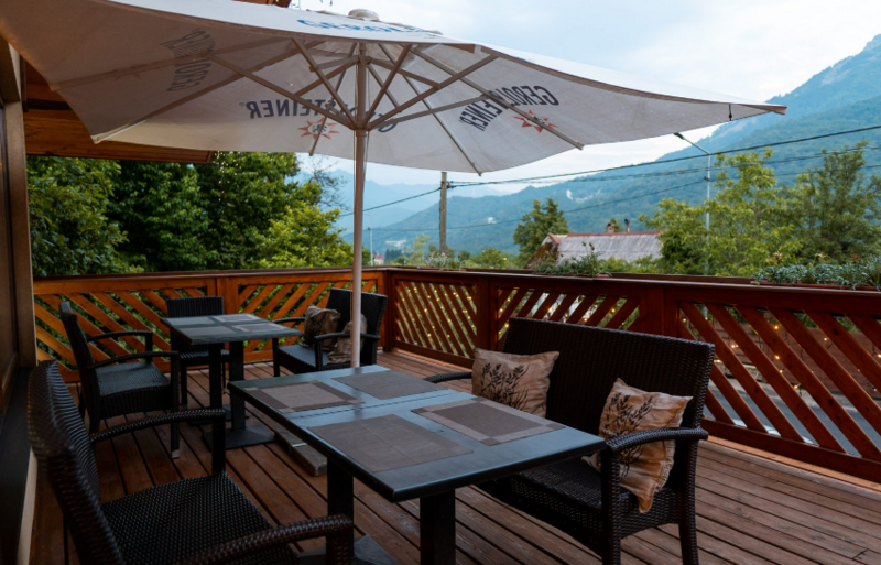 У отеля потрясающая лужайка, где можно позагорать, полежать и по настоящему расслабиться. Тишина и спокойствие, и журчание горной речки , проходящей по соседству с участком. Отдельное вау это завтрак! Завтрак включен, проходил в столовой, там также есть балкончик и можно прекрасно покушать на свежем воздухе с видом на горы. Объедались на пол дня)