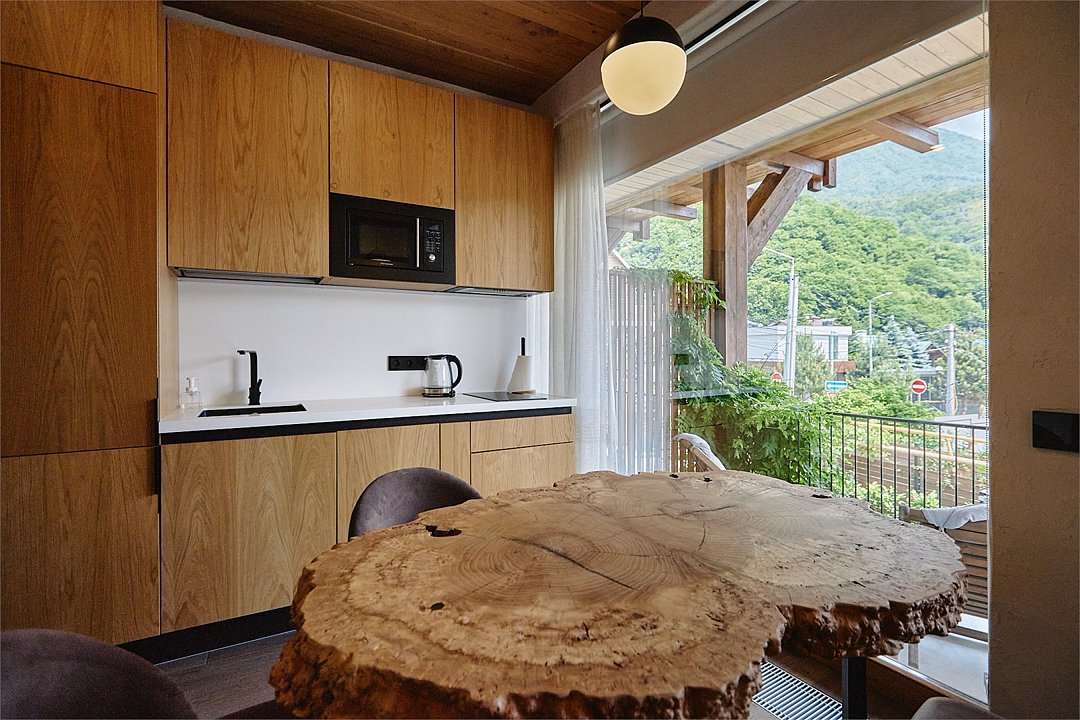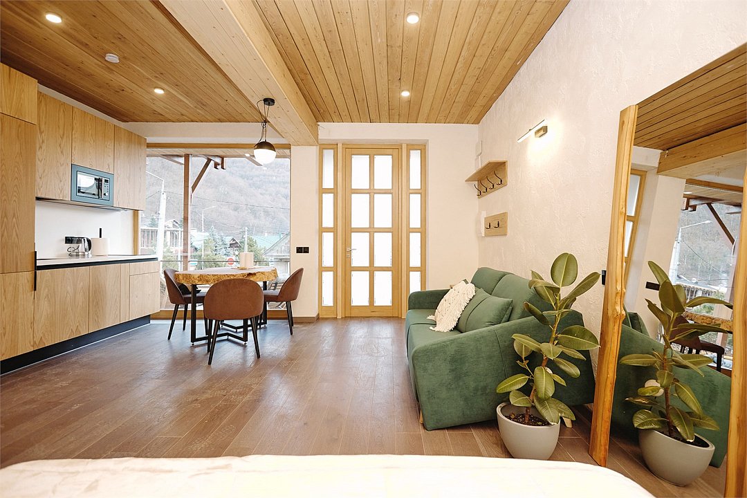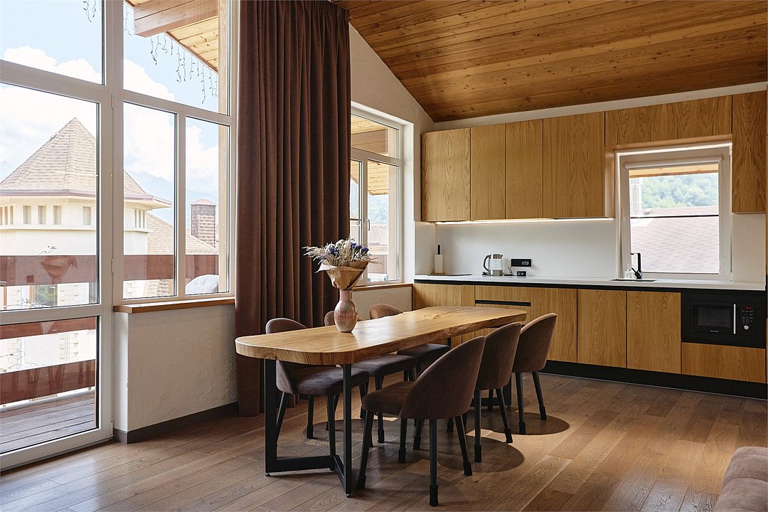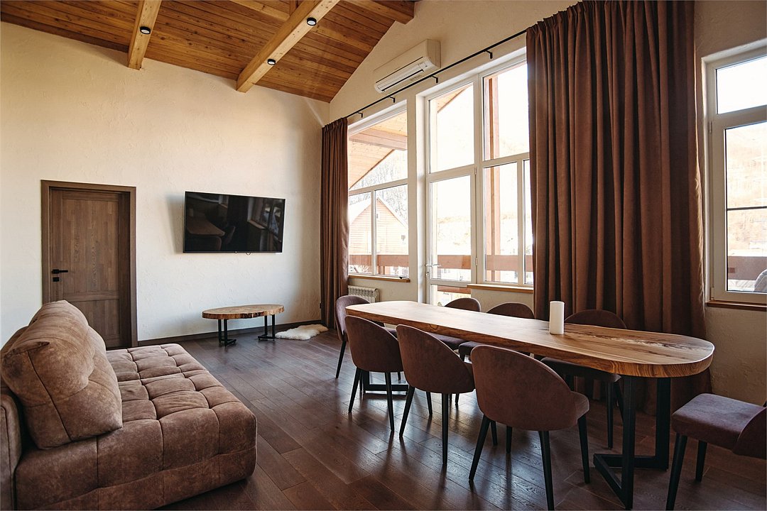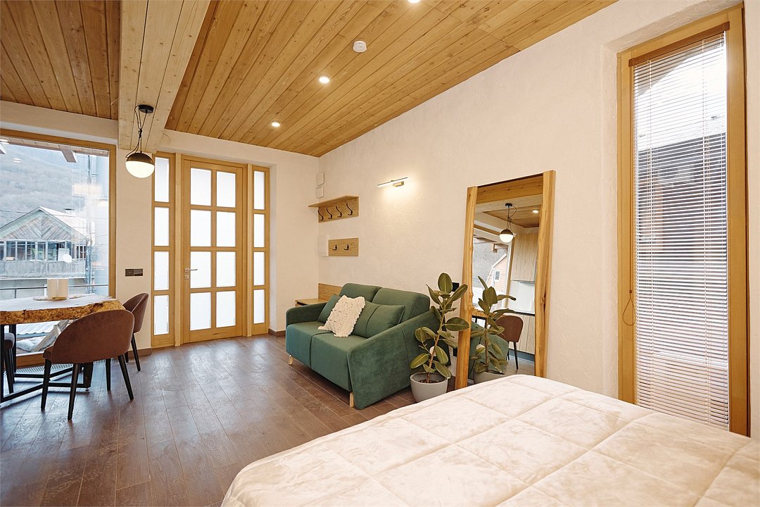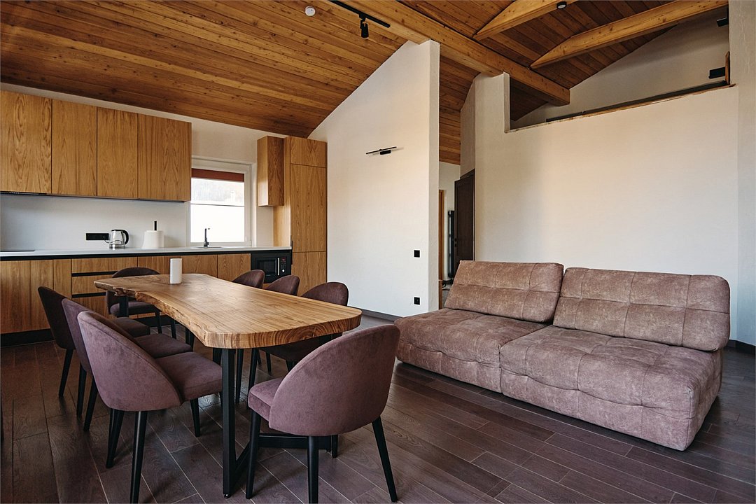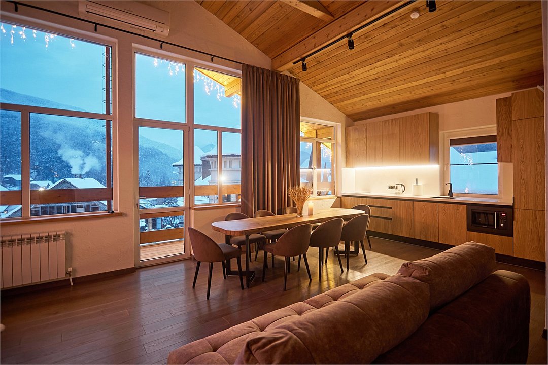 Просторные апартаменты для большой компании на 3 этаже 80 кв. м, с мансардным высоким потолком, панорамными окнами и длинным балконом. В распоряжении Гостей роскошная гостиная-кухня и две изолированные спальни, 2 санузла с душевыми кабинами и стиральной машиной. В каждой спальне двуспальная кровать, в гостиной раскладывающийся диван. Есть также секретное спальное место для "Карлсона". Кухня оборудована варочной панелью, микроволновой печью и посудомоечной машиной, есть чайник и вся необходимая посуда. ДУХ возвышается над окрестностями, в номере много света, открывается прекрасный вид на горы и лесУслуги и удобства