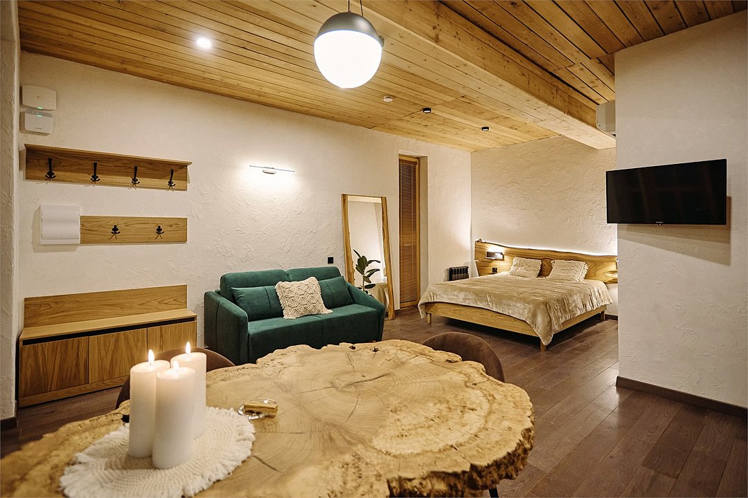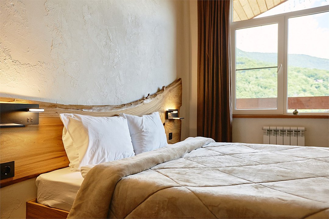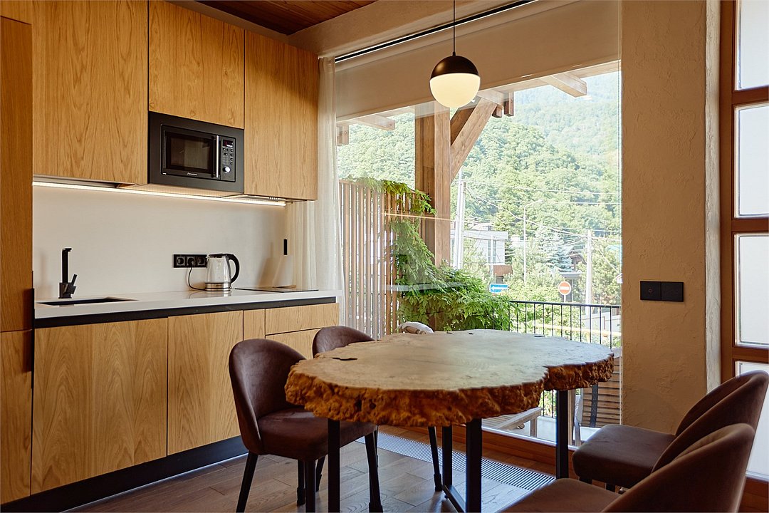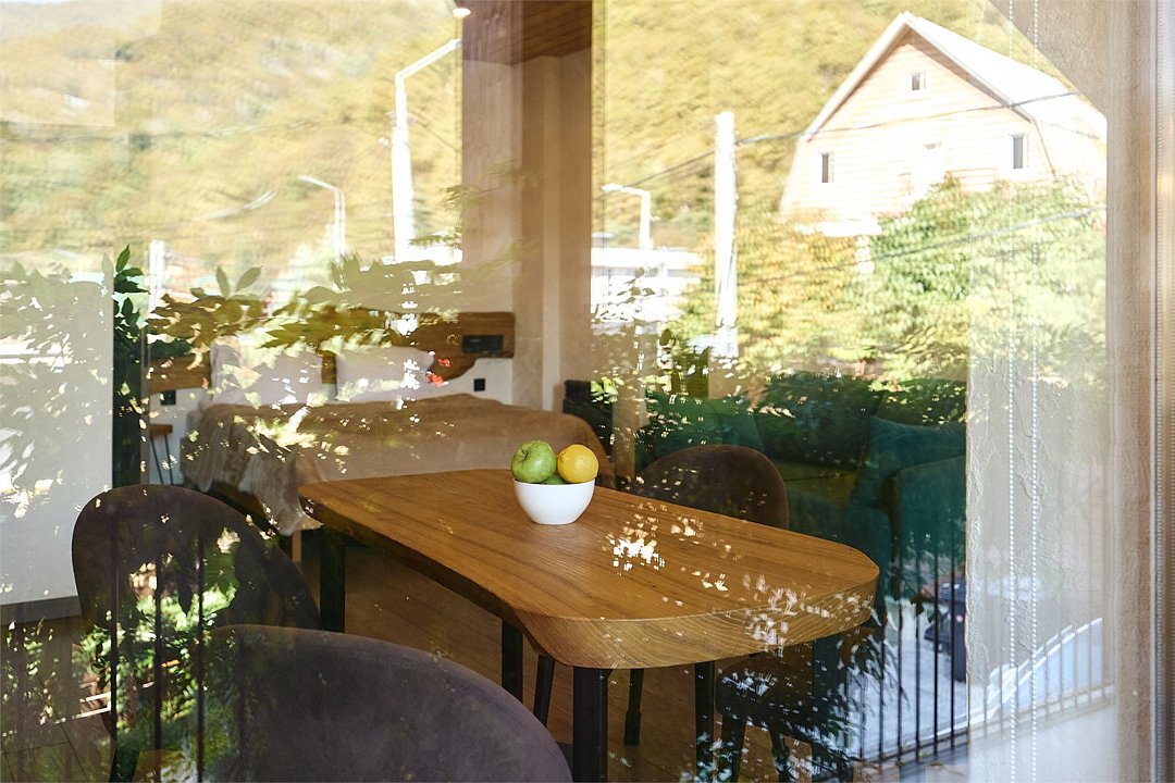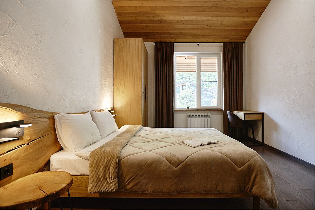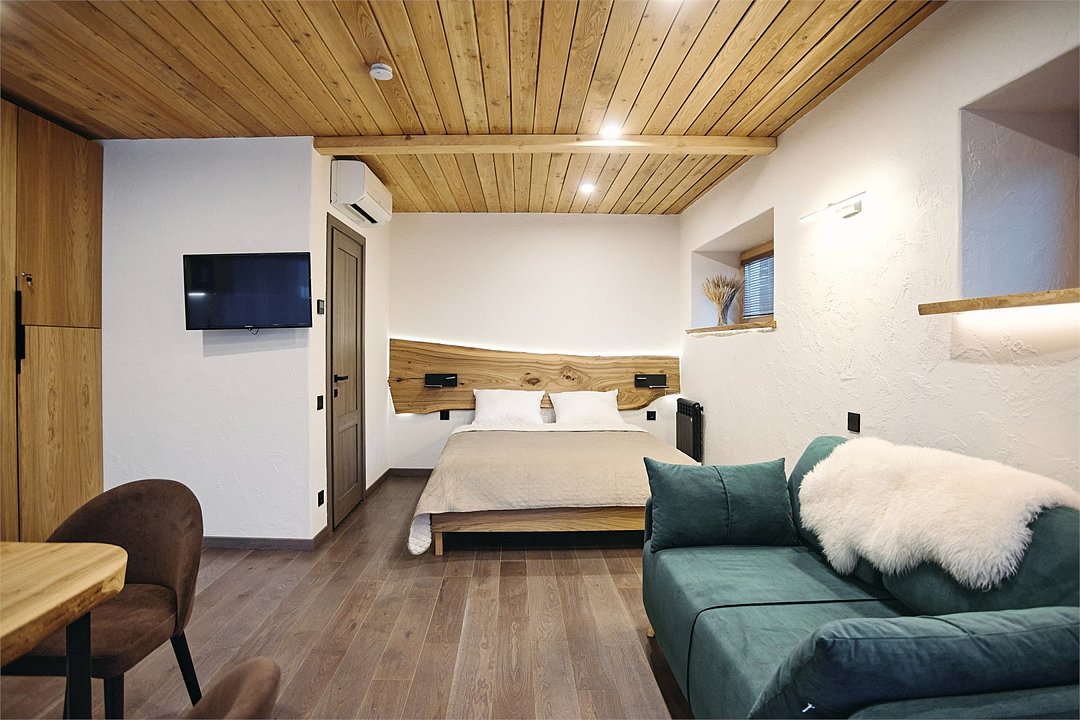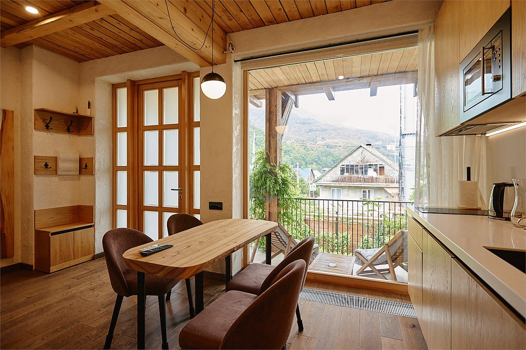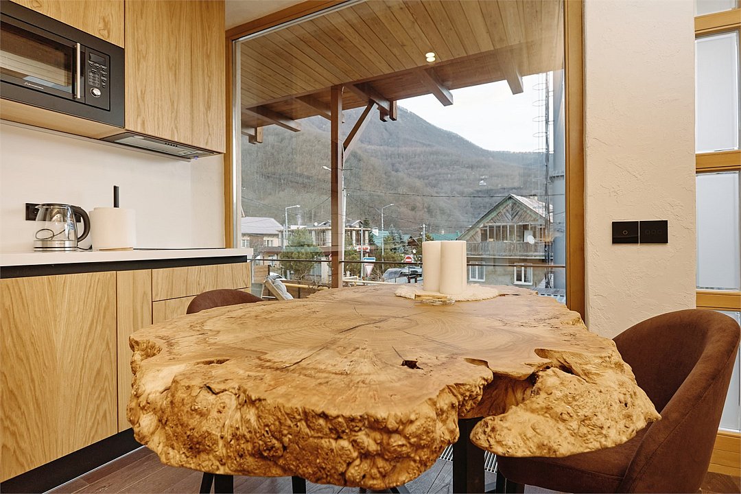 Просторные апартаменты для большой компании на 3 этаже 80 кв. м, с мансардным высоким потолком, панорамными окнами и длинным балконом. В распоряжении Гостей роскошная гостиная-кухня и две изолированные спальни, 2 санузла с душевыми кабинами и стиральной машиной. В каждой спальне двуспальная кровать, в гостиной раскладывающийся диван. Есть также секретное спальное место для "Карлсона". Кухня оборудована варочной панелью, микроволновой печью и посудомоечной машиной, есть чайник и вся необходимая посуда. ДУХ возвышается над окрестностями, в номере много света, открывается прекрасный вид на горы и лесУслуги и удобства