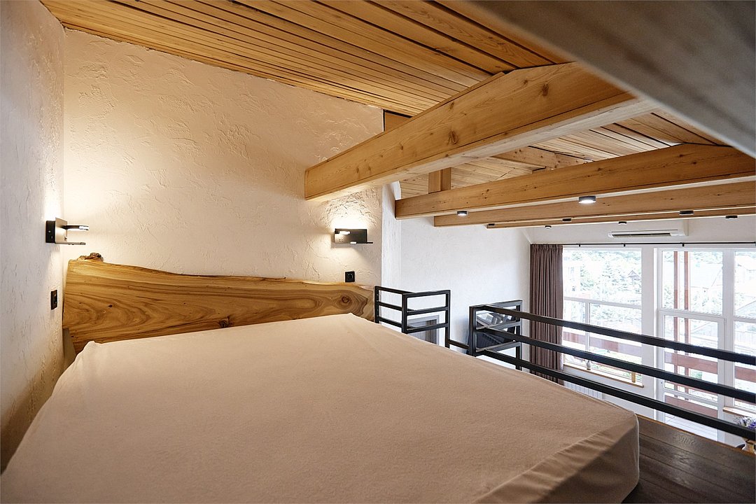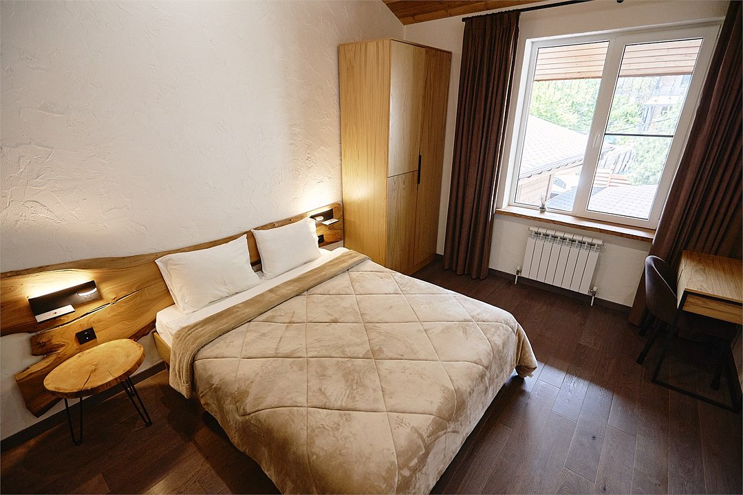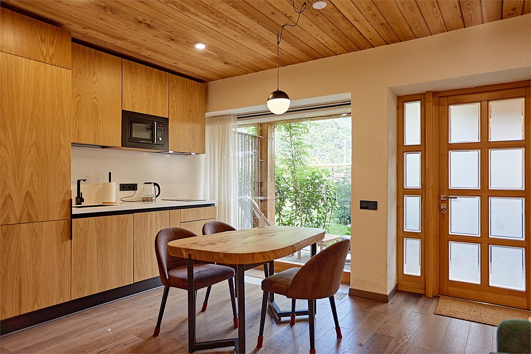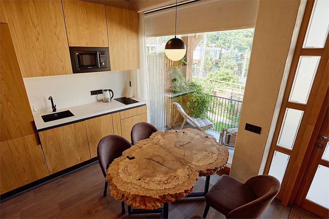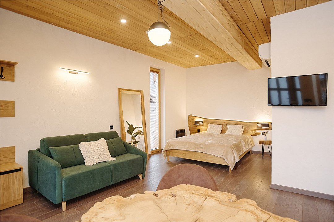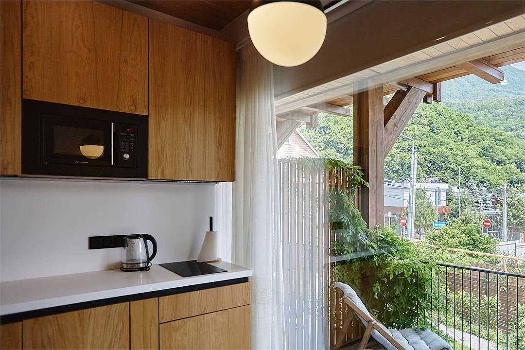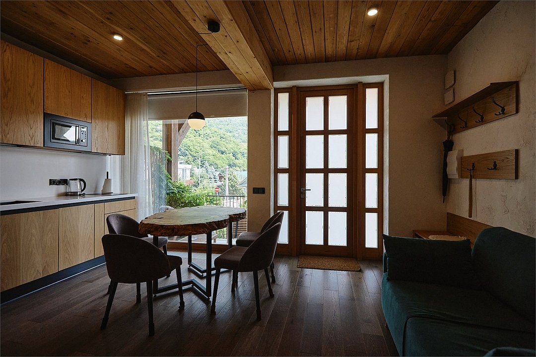 Просторные апартаменты для большой компании на 3 этаже 80 кв. м, с мансардным высоким потолком, панорамными окнами и длинным балконом. В распоряжении Гостей роскошная гостиная-кухня и две изолированные спальни, 2 санузла с душевыми кабинами и стиральной машиной. В каждой спальне двуспальная кровать, в гостиной раскладывающийся диван. Есть также секретное спальное место для "Карлсона". Кухня оборудована варочной панелью, микроволновой печью и посудомоечной машиной, есть чайник и вся необходимая посуда. ДУХ возвышается над окрестностями, в номере много света, открывается прекрасный вид на горы и лесУслуги и удобства