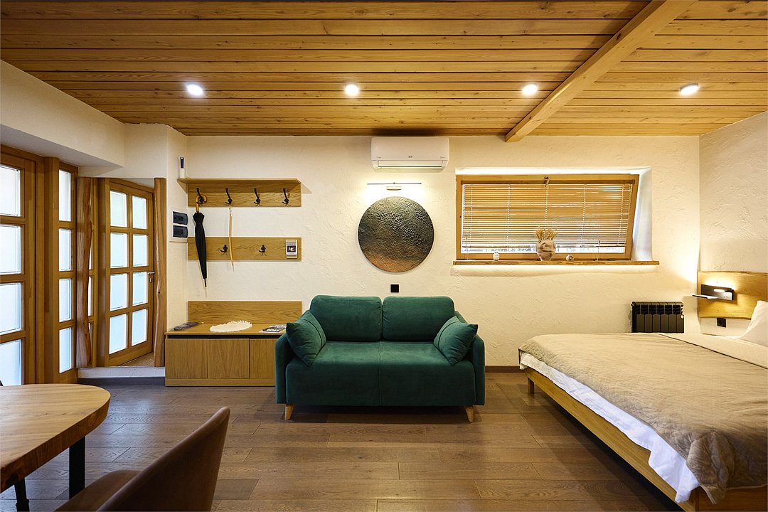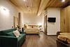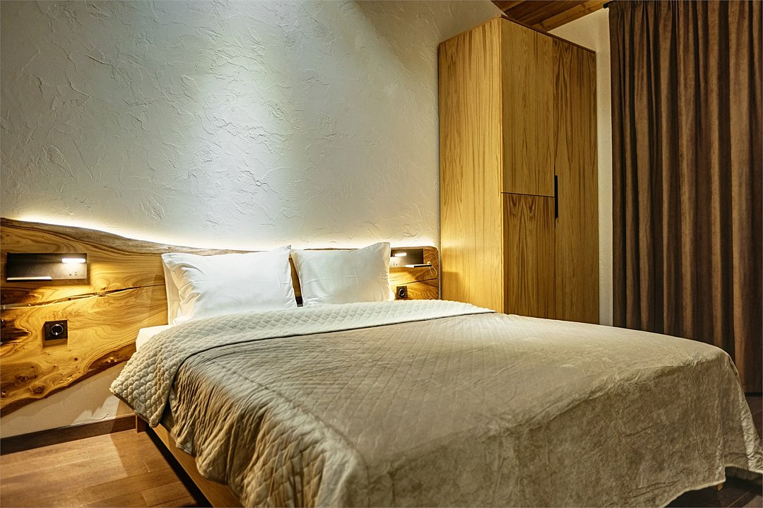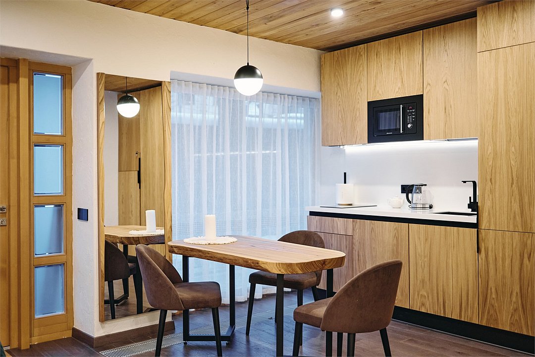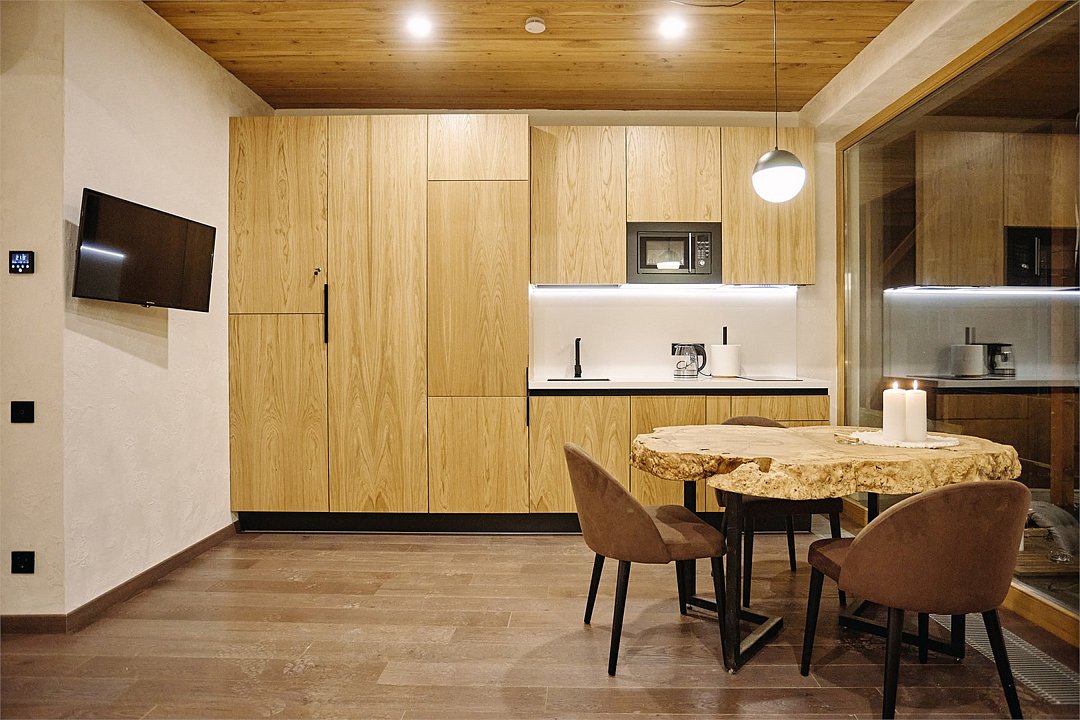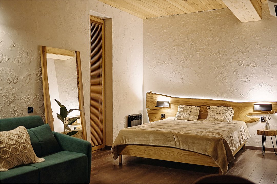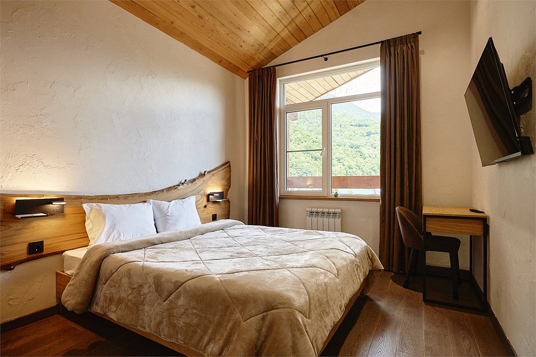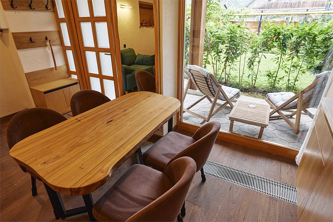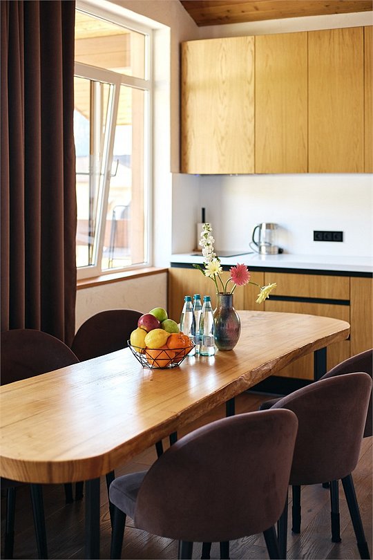Просторные апартаменты для большой компании на 3 этаже 80 кв. м, с мансардным высоким потолком, панорамными окнами и длинным балконом. В распоряжении Гостей роскошная гостиная-кухня и две изолированные спальни, 2 санузла с душевыми кабинами и стиральной машиной. В каждой спальне двуспальная кровать, в гостиной раскладывающийся диван. Есть также секретное спальное место для "Карлсона". Кухня оборудована варочной панелью, микроволновой печью и посудомоечной машиной, есть чайник и вся необходимая посуда. ДУХ возвышается над окрестностями, в номере много света, открывается прекрасный вид на горы и лесУслуги и удобства