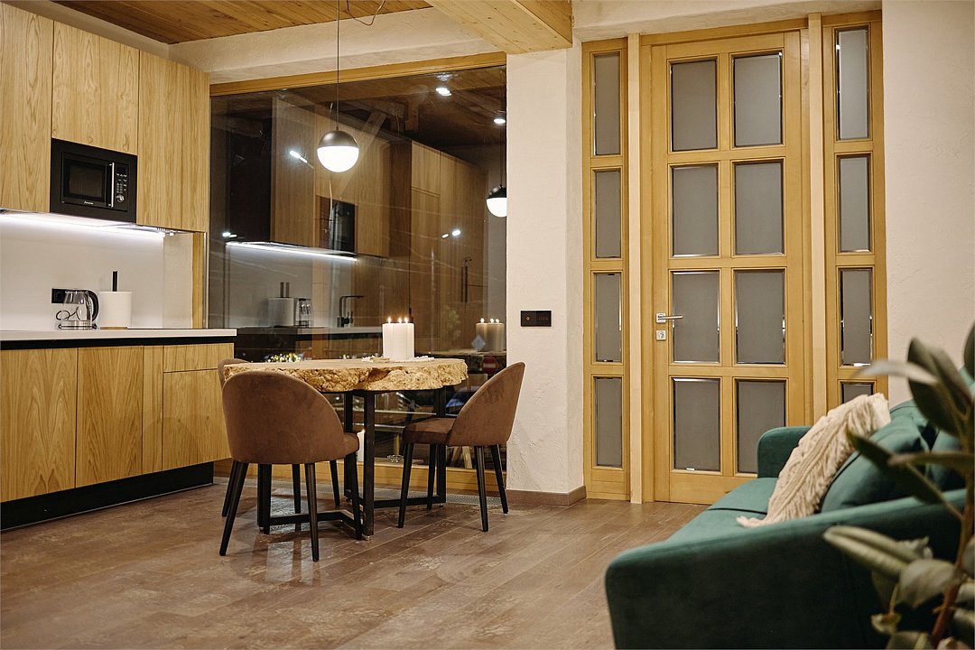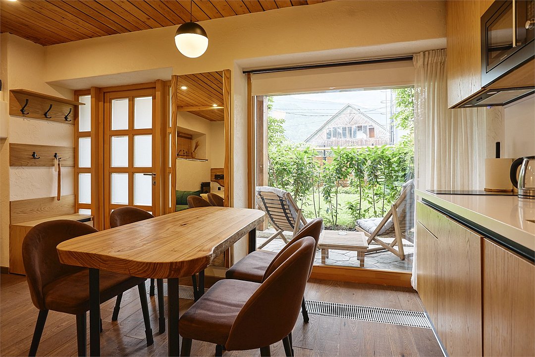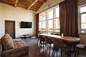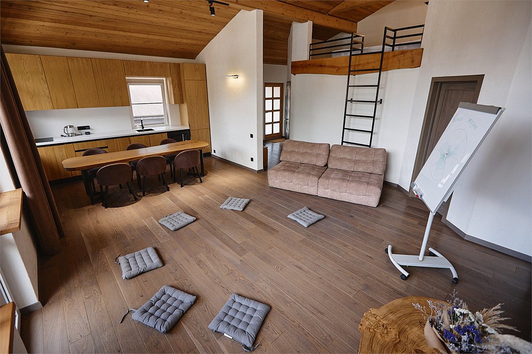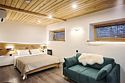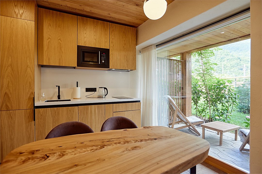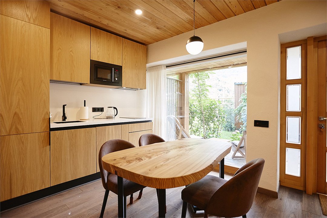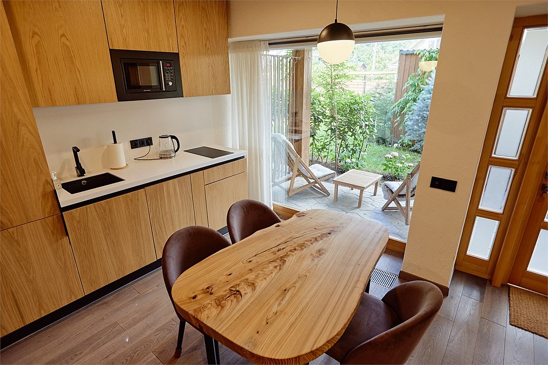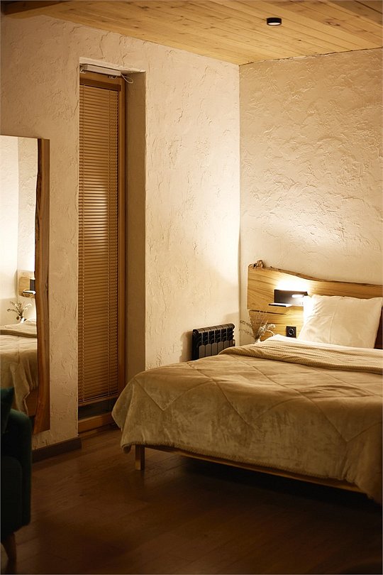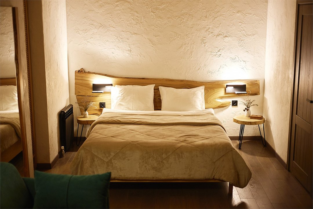 Просторные апартаменты для большой компании на 3 этаже 80 кв. м, с мансардным высоким потолком, панорамными окнами и длинным балконом. В распоряжении Гостей роскошная гостиная-кухня и две изолированные спальни, 2 санузла с душевыми кабинами и стиральной машиной. В каждой спальне двуспальная кровать, в гостиной раскладывающийся диван. Есть также секретное спальное место для "Карлсона". Кухня оборудована варочной панелью, микроволновой печью и посудомоечной машиной, есть чайник и вся необходимая посуда. ДУХ возвышается над окрестностями, в номере много света, открывается прекрасный вид на горы и лесУслуги и удобства