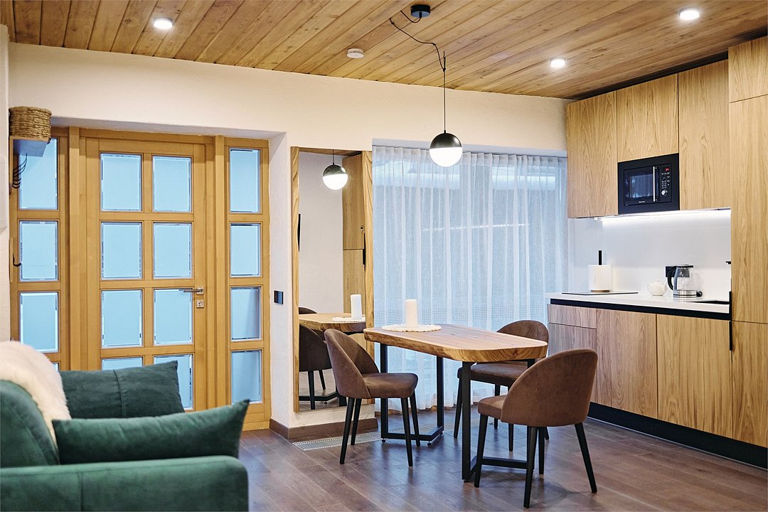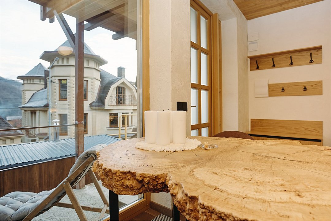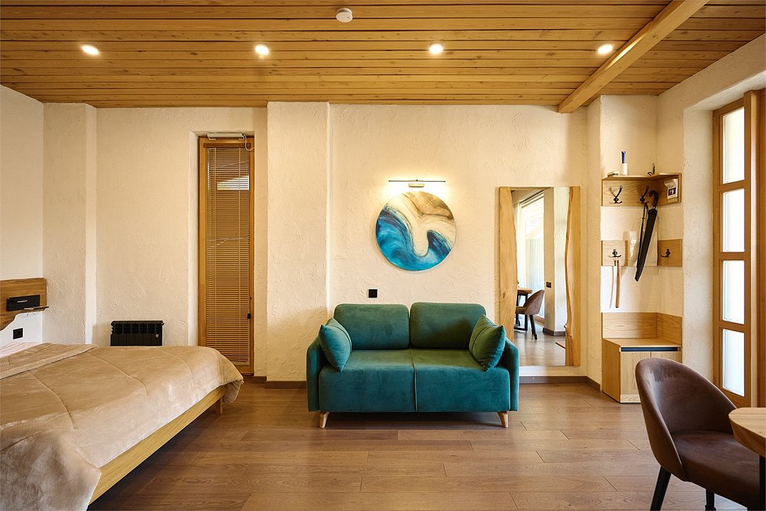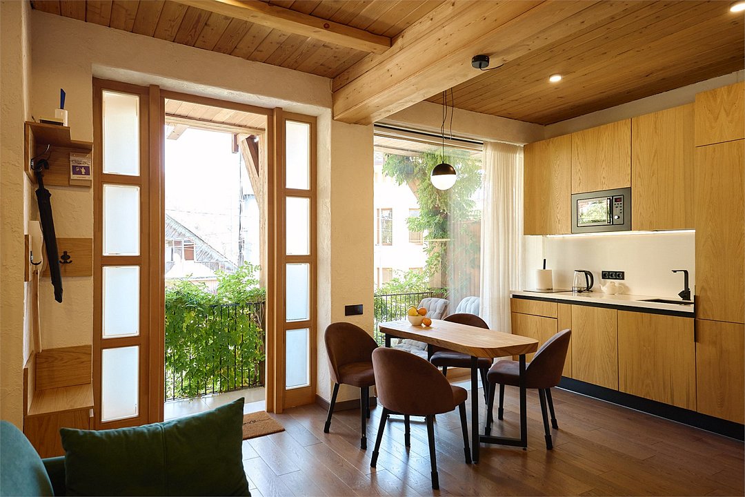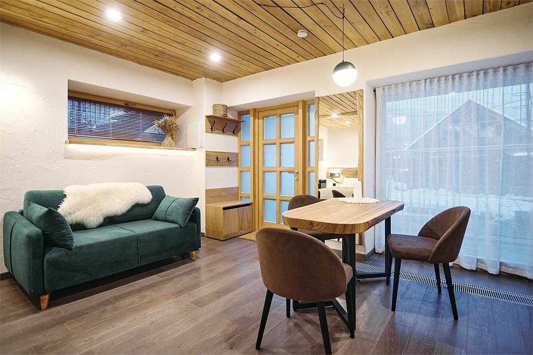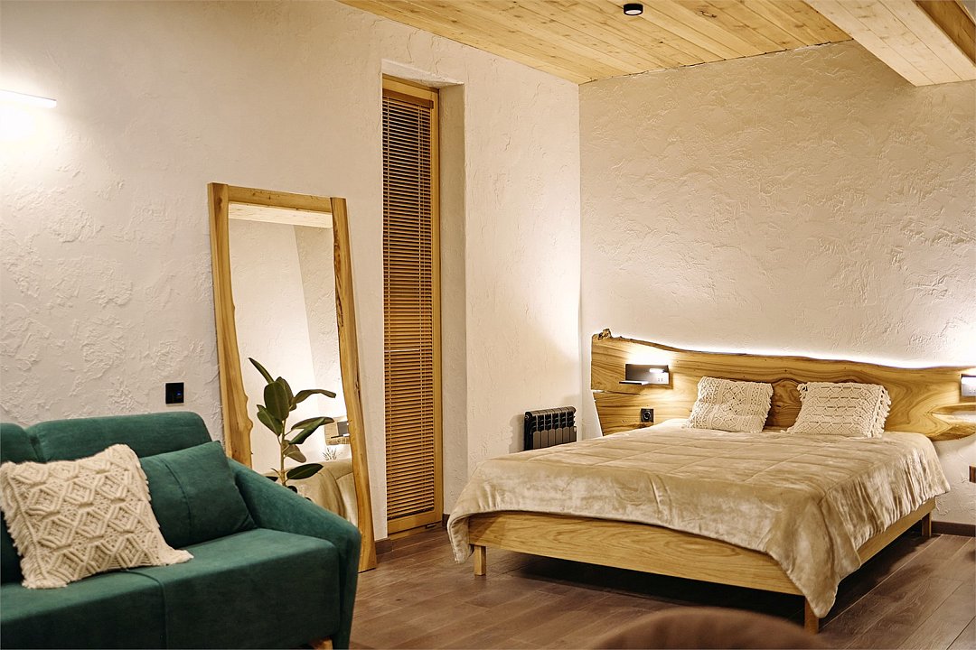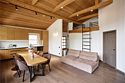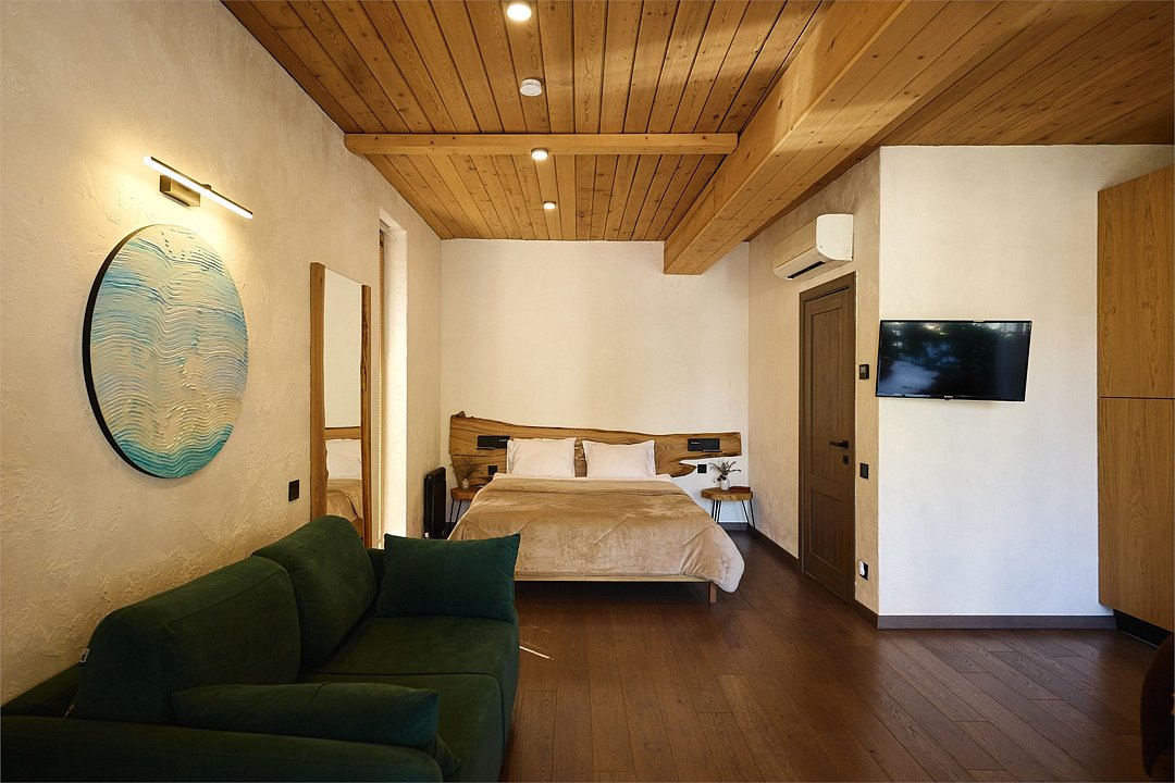 Просторные апартаменты для большой компании на 3 этаже 80 кв. м, с мансардным высоким потолком, панорамными окнами и длинным балконом. В распоряжении Гостей роскошная гостиная-кухня и две изолированные спальни, 2 санузла с душевыми кабинами и стиральной машиной. В каждой спальне двуспальная кровать, в гостиной раскладывающийся диван. Есть также секретное спальное место для "Карлсона". Кухня оборудована варочной панелью, микроволновой печью и посудомоечной машиной, есть чайник и вся необходимая посуда. ДУХ возвышается над окрестностями, в номере много света, открывается прекрасный вид на горы и лесУслуги и удобства