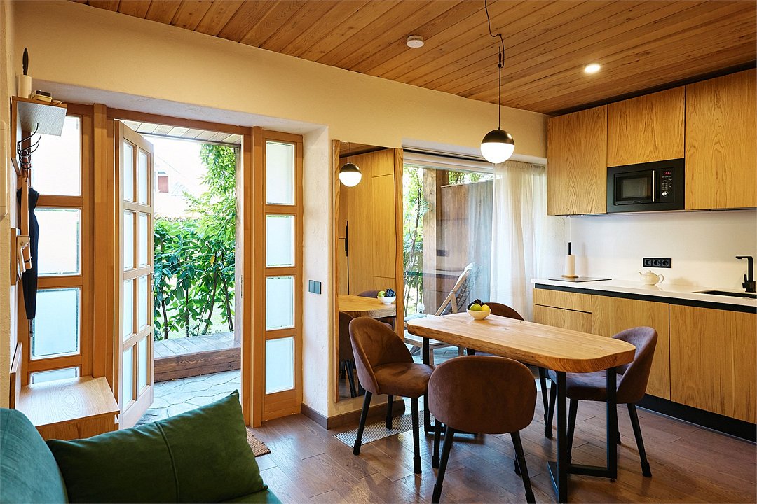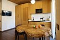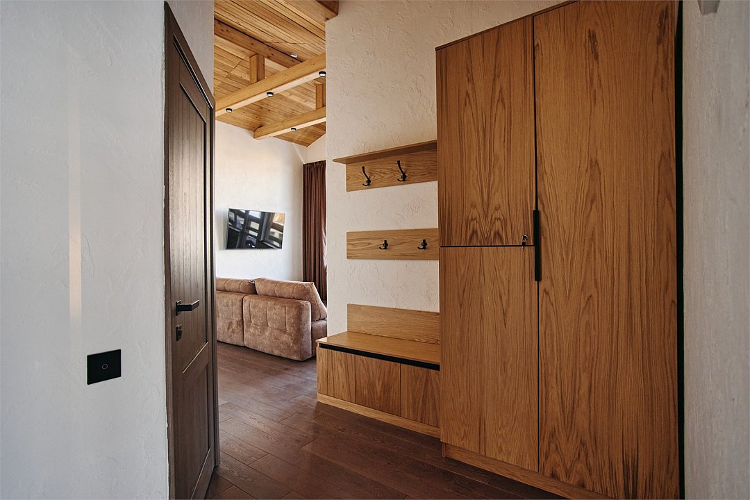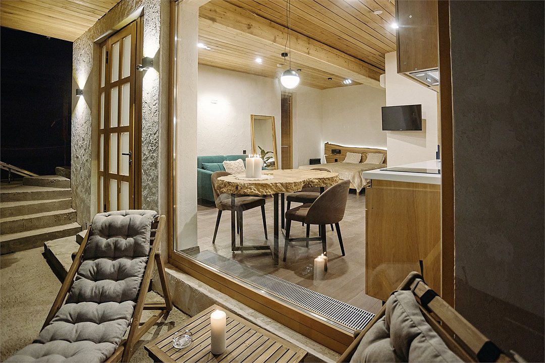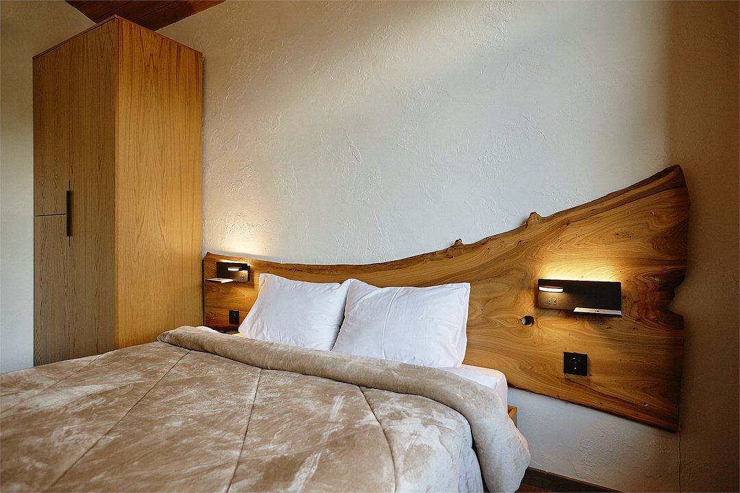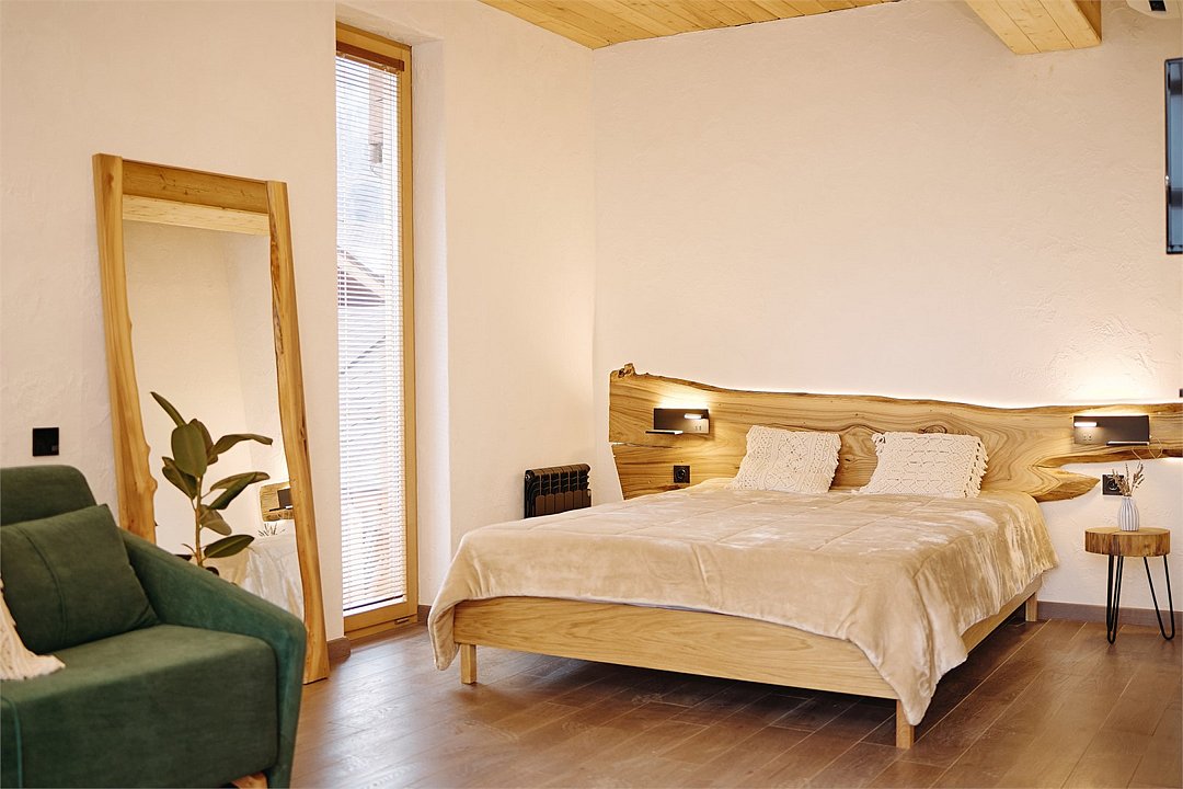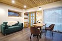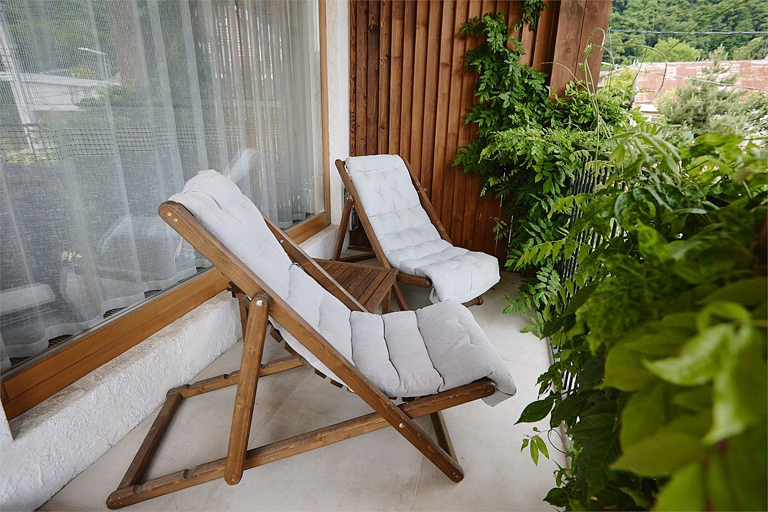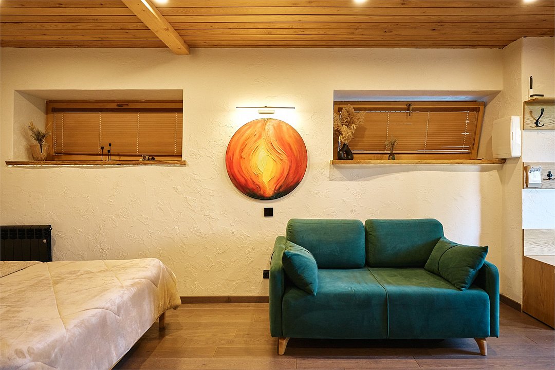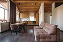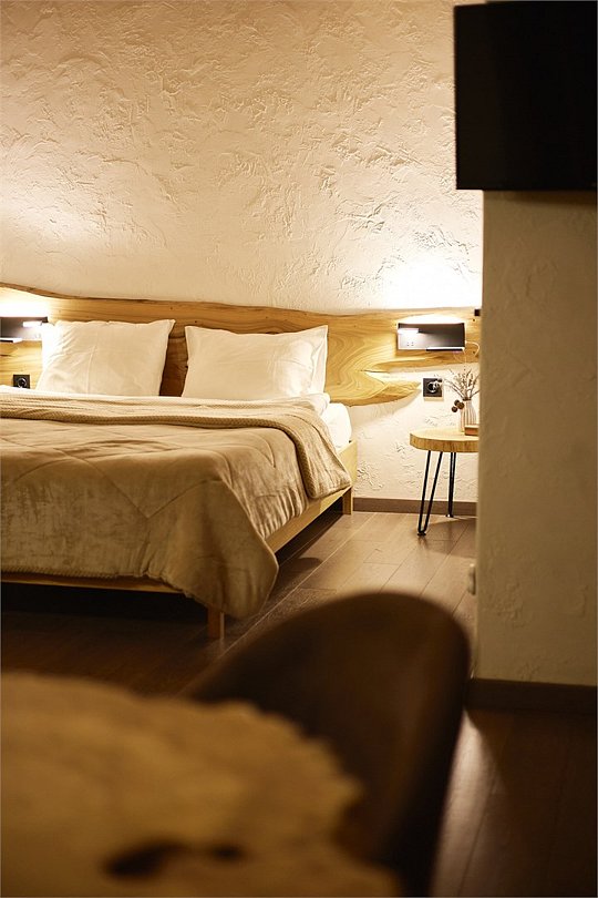 Просторные апартаменты для большой компании на 3 этаже 80 кв. м, с мансардным высоким потолком, панорамными окнами и длинным балконом. В распоряжении Гостей роскошная гостиная-кухня и две изолированные спальни, 2 санузла с душевыми кабинами и стиральной машиной. В каждой спальне двуспальная кровать, в гостиной раскладывающийся диван. Есть также секретное спальное место для "Карлсона". Кухня оборудована варочной панелью, микроволновой печью и посудомоечной машиной, есть чайник и вся необходимая посуда. ДУХ возвышается над окрестностями, в номере много света, открывается прекрасный вид на горы и лесУслуги и удобства