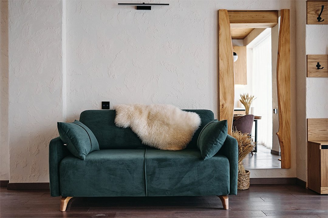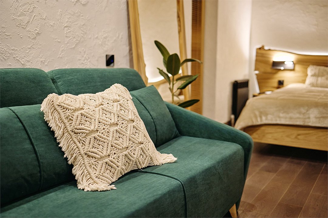 Апартамент на 2 этаже с удобной кроватью и раскладывающимся диваном, а также с современной оборудованной кухней. В ванной комнате душевая кабина и стиральная машина. Номер наполнен качественной мебелью. Здание построено с использованием современных отделочных материаловУслуги и удобства