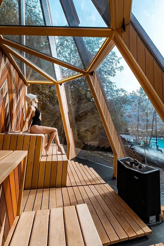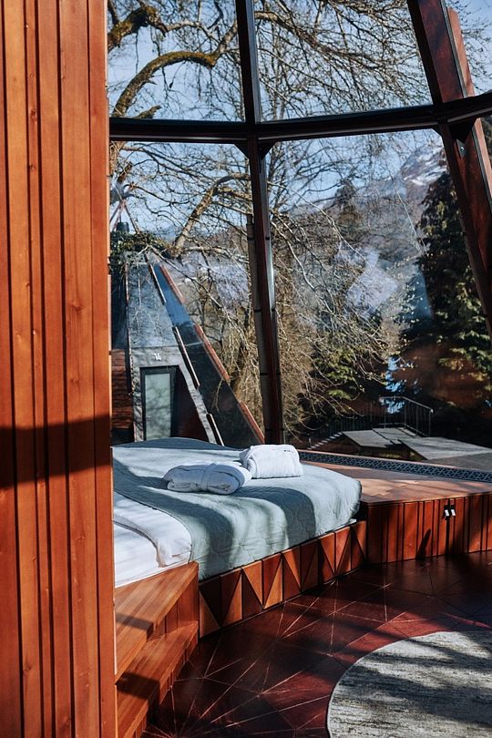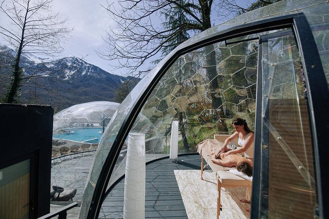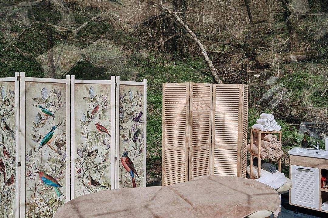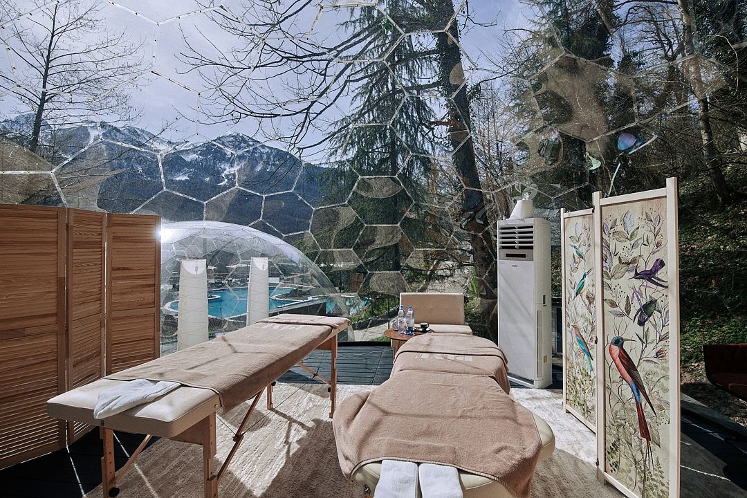 Панорамный кабинет в виде купола открывает вид на зеленый лес и величественные горы. Он расположен в уединенном месте — вы будете защищены от посторонних глаз и сможете спокойно наслаждаться массажем и пейзажами.