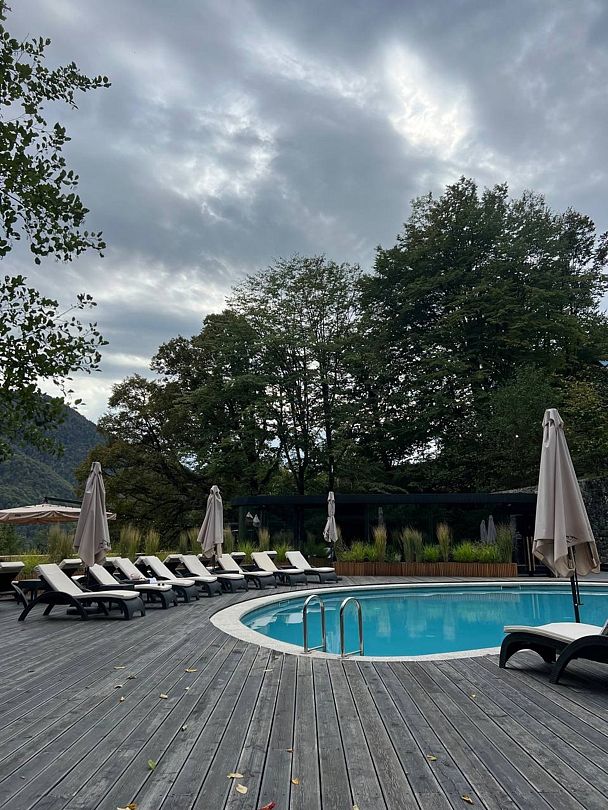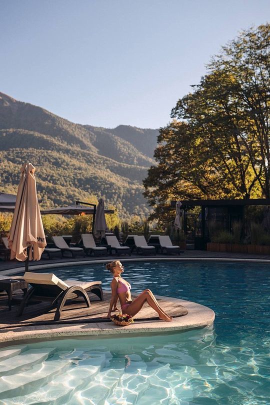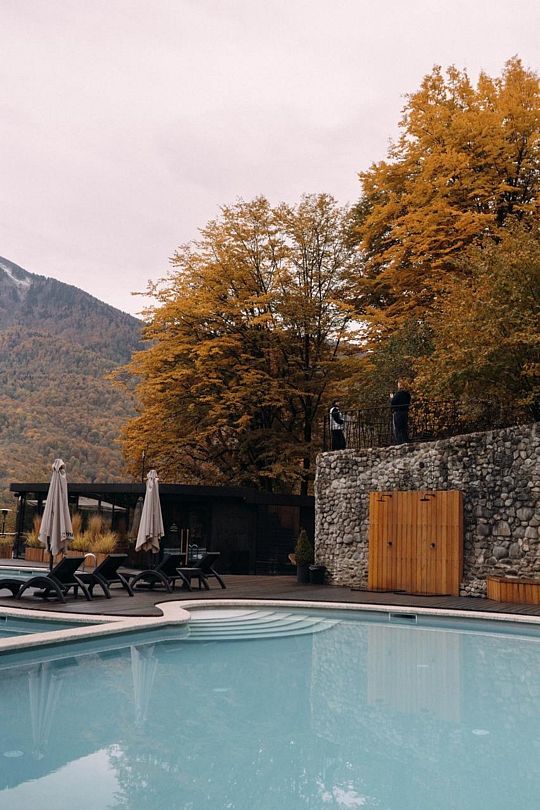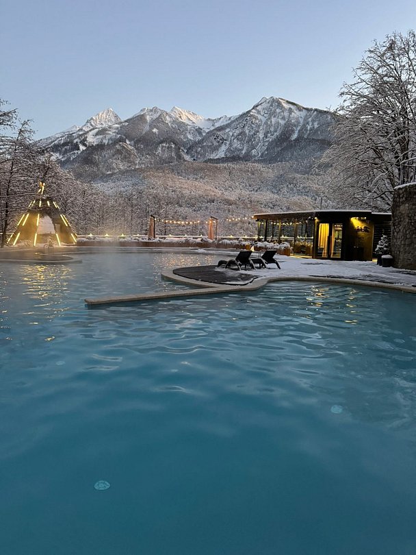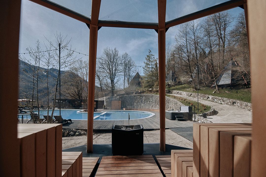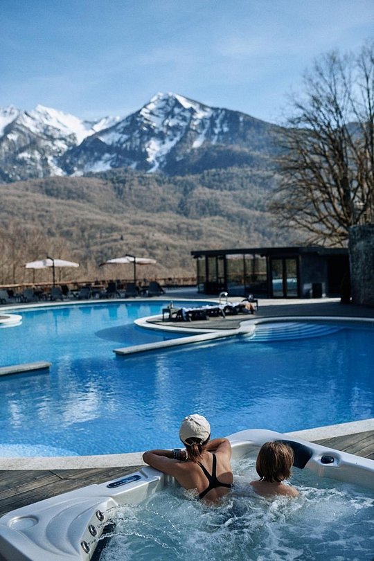 К услугам гостей панорамная сауна с потрясающим видом на горы. Снаружи — открытая веранда с теплым открытым бассейном и джакузи.