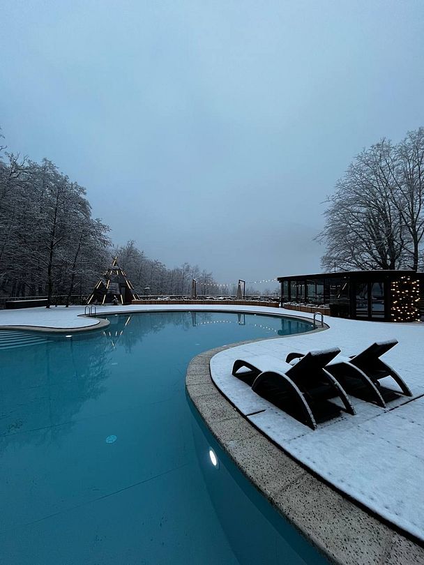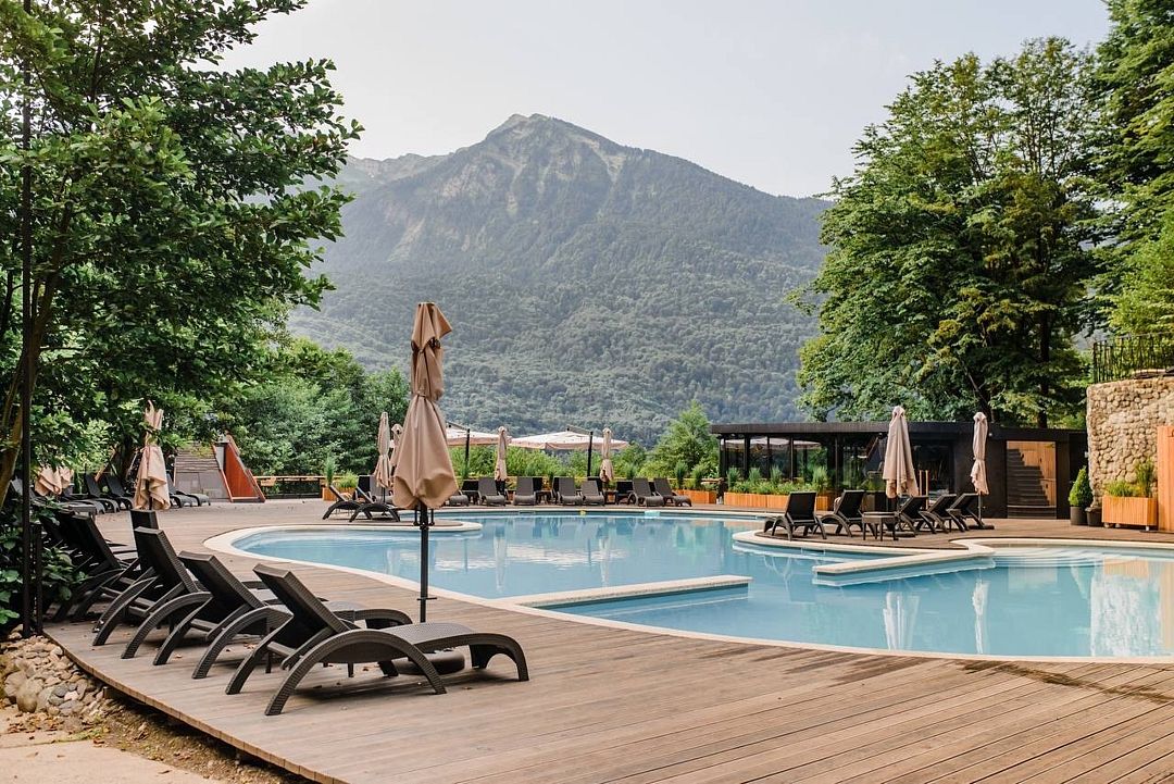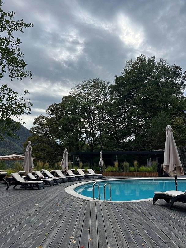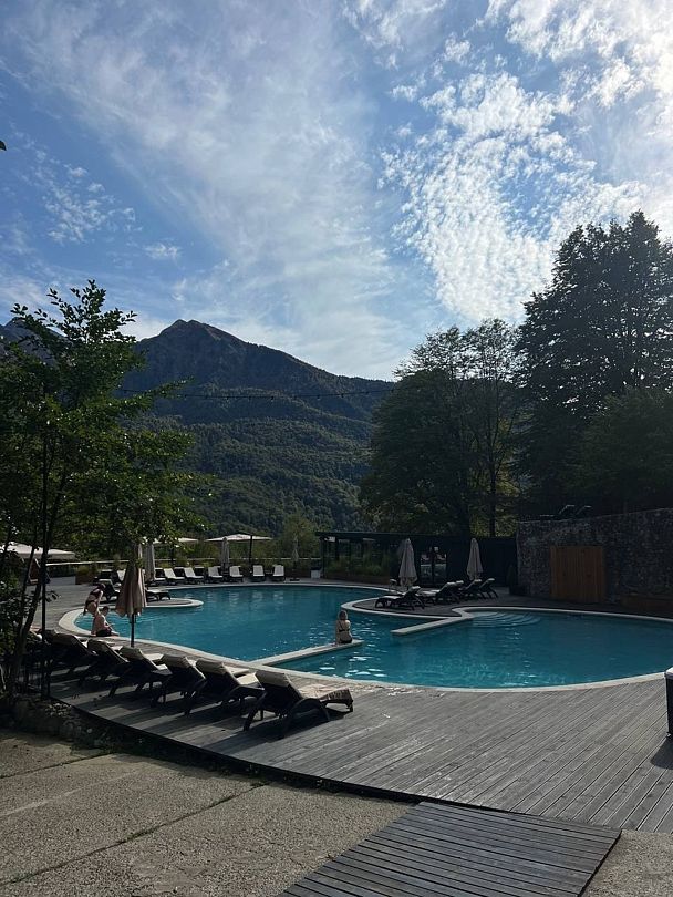 На территории оборудован бассейн с шезлонгами, массажный кабинет, панорманая сауна, зона отдыха и ресторан.