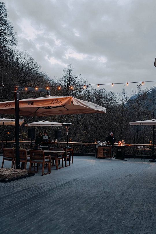 Тип меню: европейская кухня, кавказская кухняМесто с захватывающим видом на горный хребет Аибга и авторским меню, где переплетается европейская кухня и блюда с кавказским акцентом, а фирменные напитки дарят прохладу в жару и согревают прохладными вечерами.