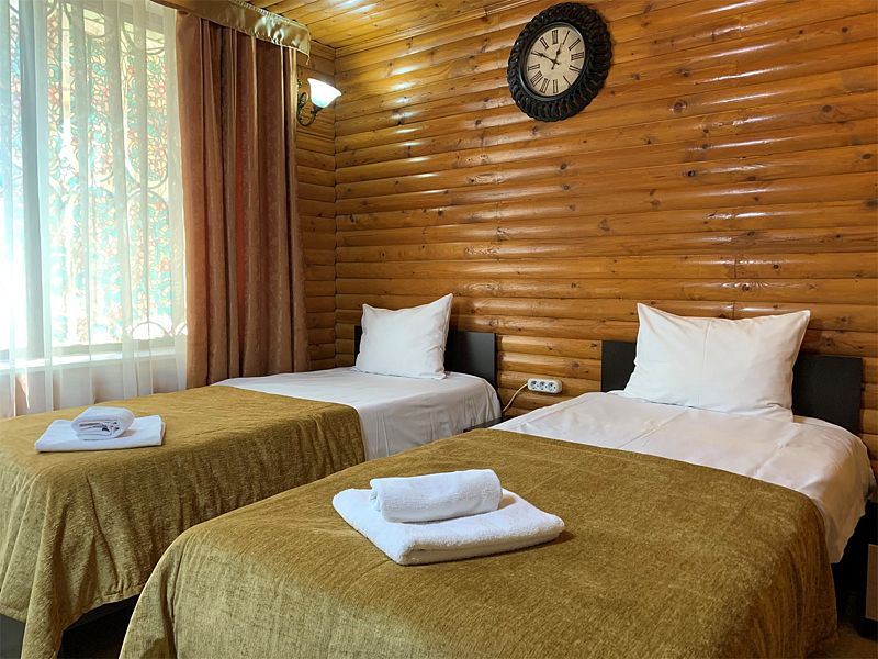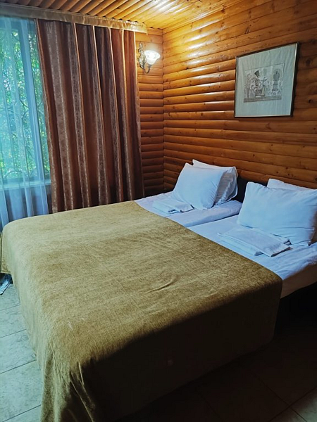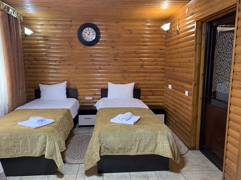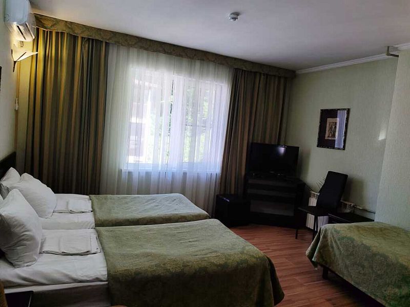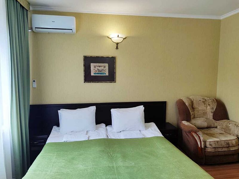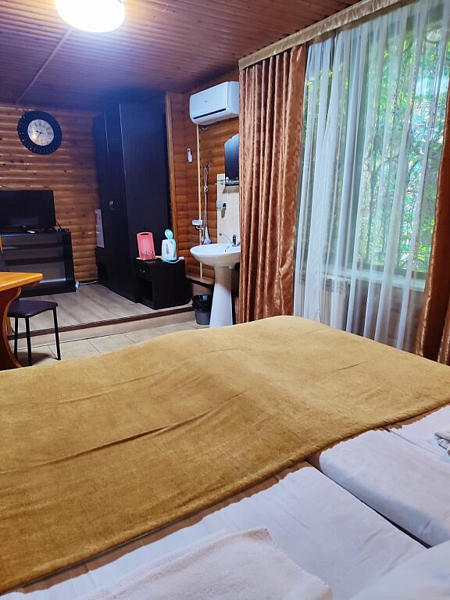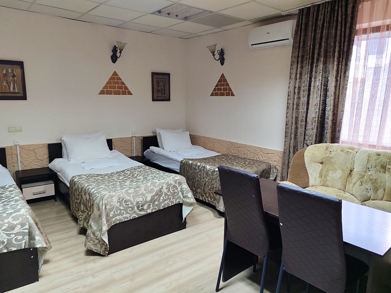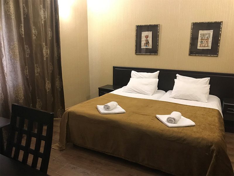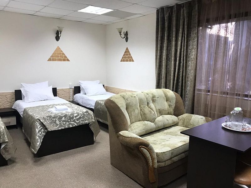 Номера в гостевом доме комфортные и разнообразные, с необходимыми удобствами. На территории расположены бювет с родниковой водой и небольшой пруд с рыбками. Особая достопримечательность — оздоровительная Пирамида, построенная по принципу золотого сечения, которую можно посетить бесплатно для улучшения здоровья. В пешей доступности находятся аквапарк «Галактика», круглосуточные магазины, крупные супермаркеты, казино и открытая ярмарка.