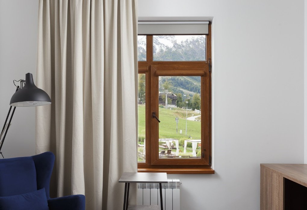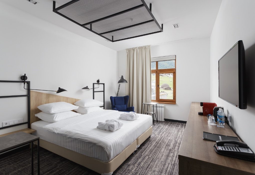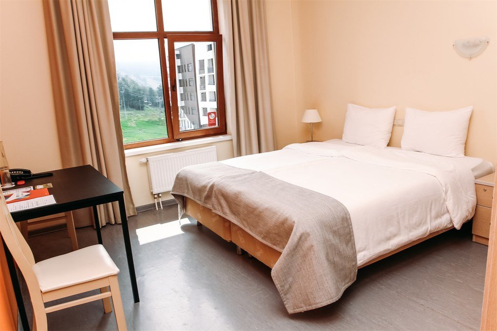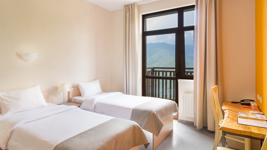 Номер с двуспальной кроватью, которая трансформируются в две односпальные. В зависимости от расположения, вид из окна может открываться на склоны горы Аибга или на живописное Плато Псехако