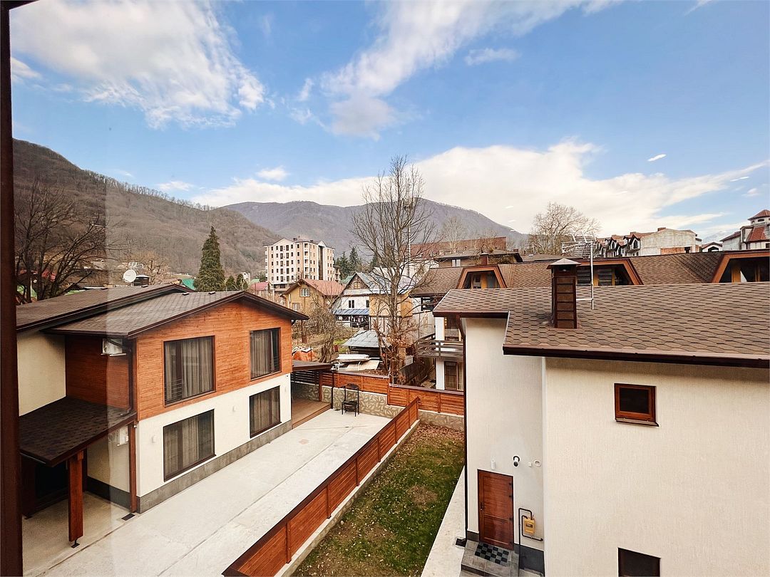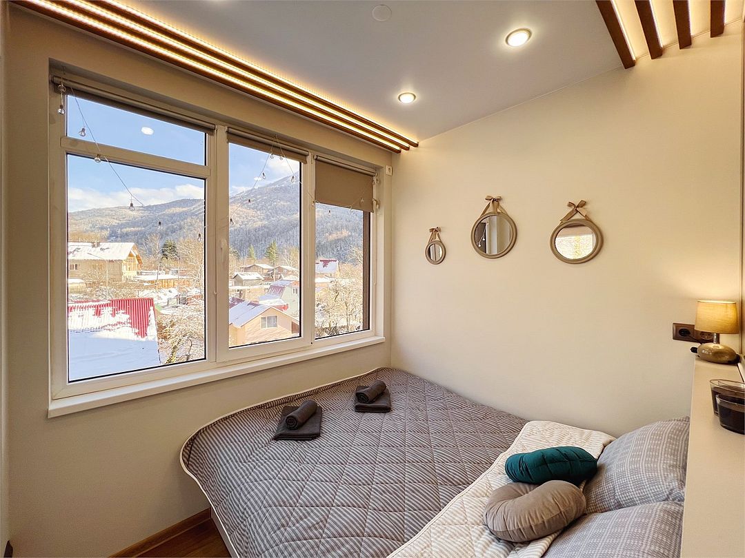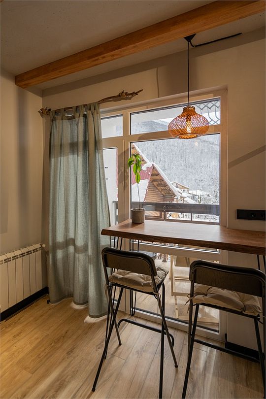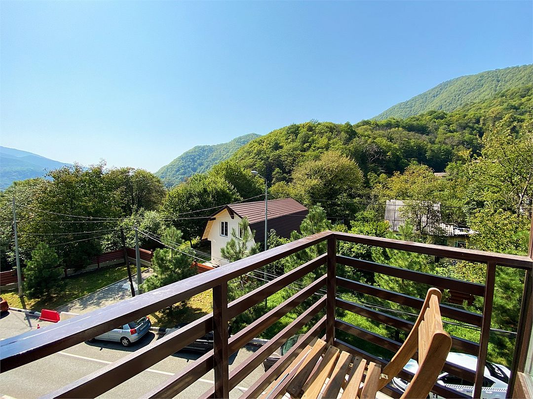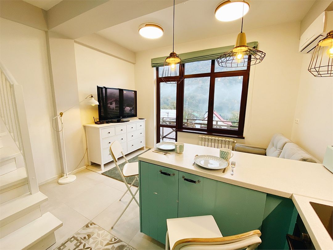 Новая двухэтажная уютная квартира-студия с кухней-гостиной на первом этаже и спальней на втором. Максимальный комфорт и все необходимые удобства. Очень крутой панорамный вид на горы! На первом этаже — раскладной двухместный диван. На втором — спальная с большой двухэтажной кроватью, уютным рабочим местом и санузлом. Вся необходимая техника. Отличное расположение в центре Красной Поляны: остановка ски-баса — 200 метров. На первом этаже отличная столовая и Сбербанк. Все остальное тоже рядом.Услуги и удобства