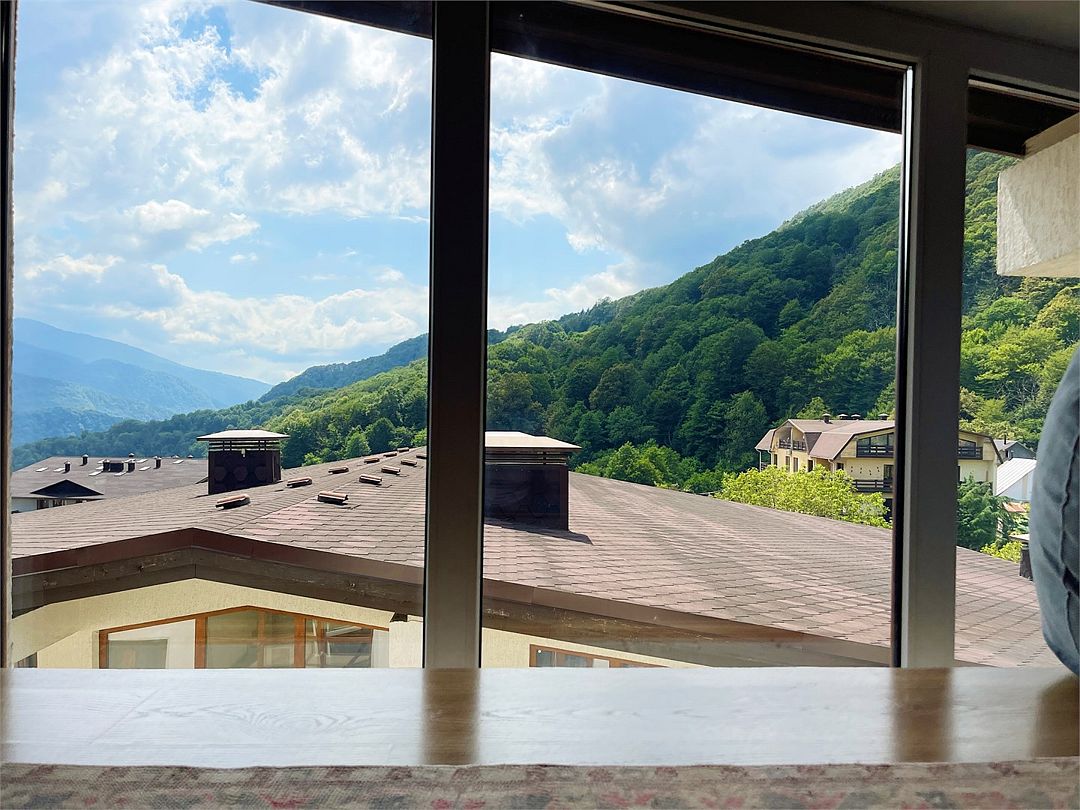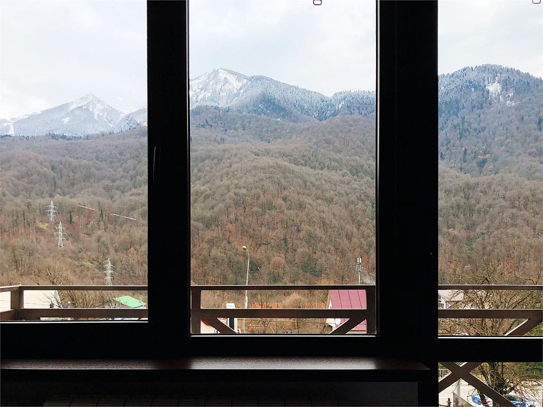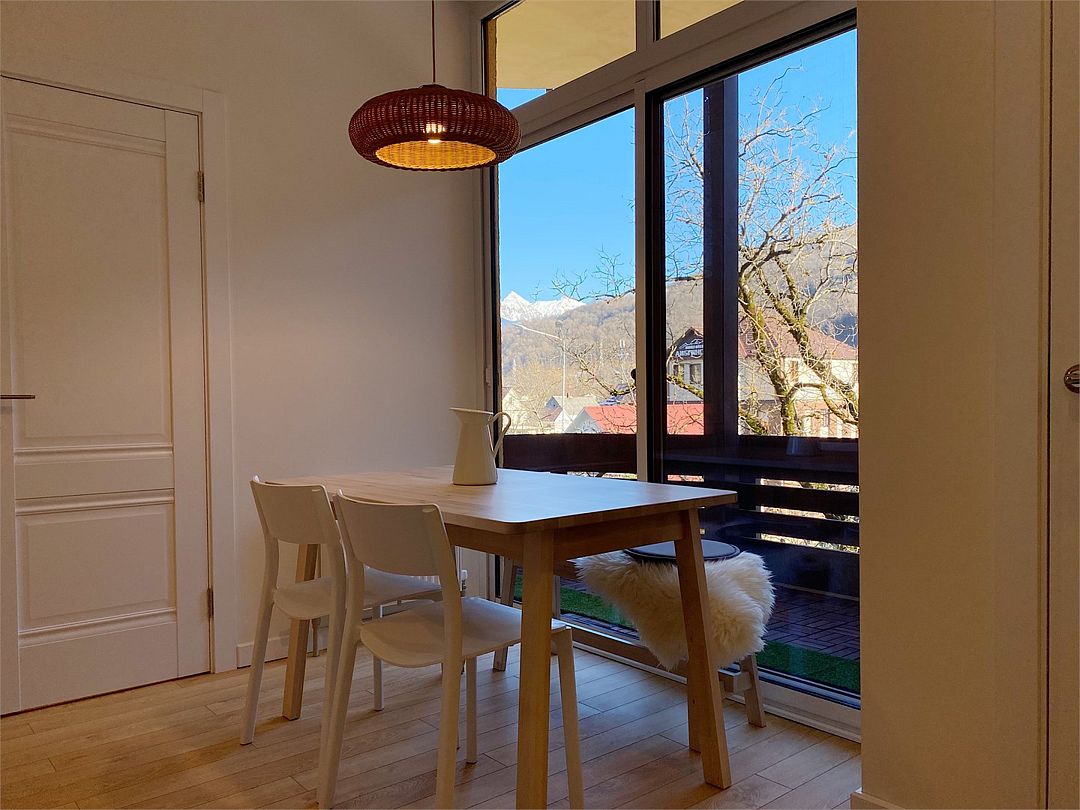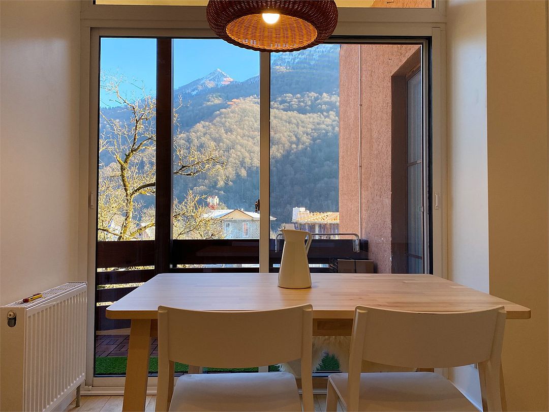 Новые очень светлые двухкомнатные апартаменты в классическом скандинавском стиле с панорамным видом на горы. Всё для полного визуального и эмоционального комфорта: минимализм, функциональность, внимание к деталям. Естественно, хорошая техника и мебель. Идеальный вид на хребет Аибга как из панорамных раздвижных окон, так и с большого, оборудованного и освещенного балкона. Центр поселка Красная Поляна: вся инфраструктура в пешей доступности. Супермаркеты, столовая и остановки в 5 минутах пешком.Услуги и удобства