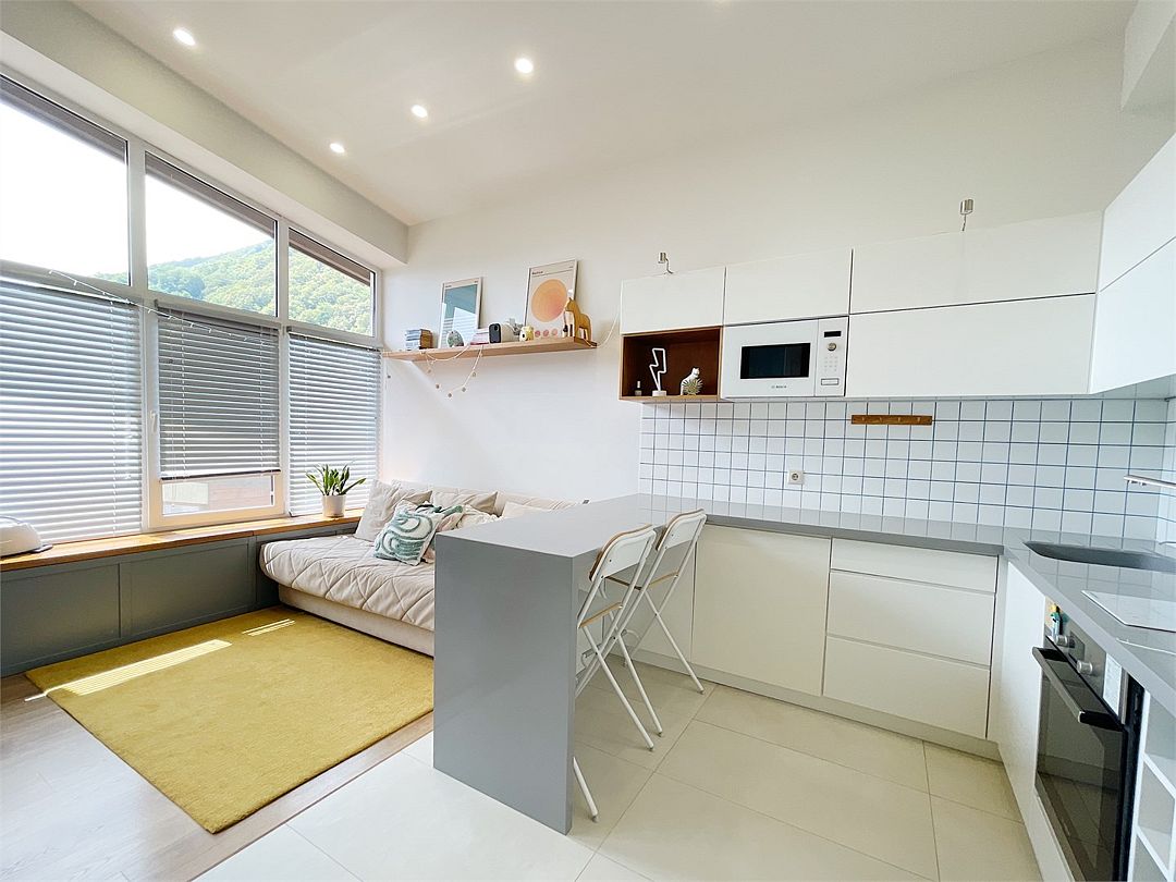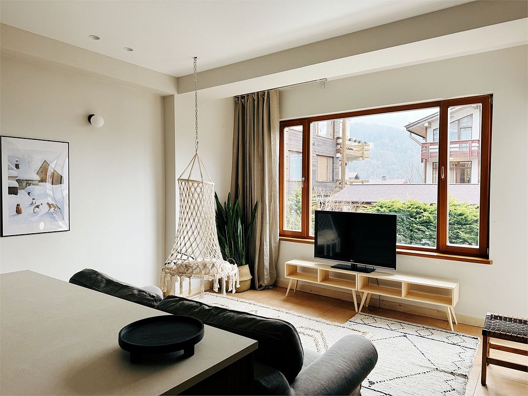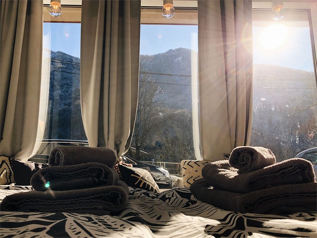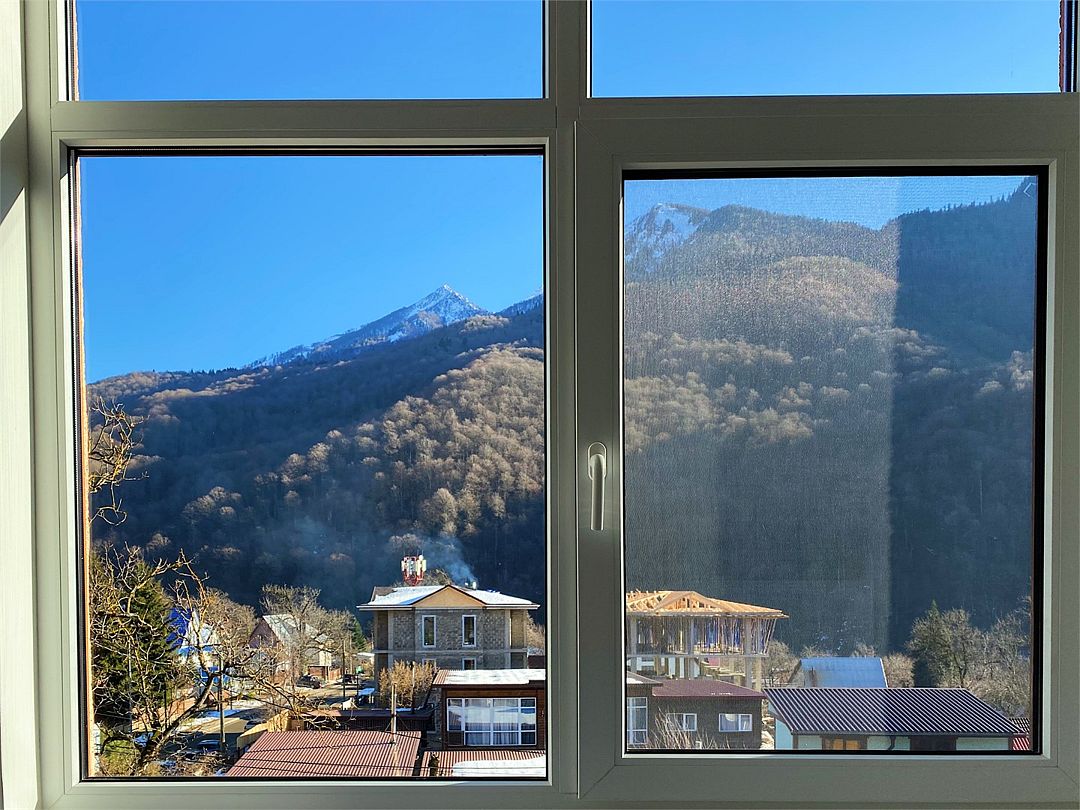 Новые очень светлые двухкомнатные апартаменты в классическом скандинавском стиле с панорамным видом на горы. Всё для полного визуального и эмоционального комфорта: минимализм, функциональность, внимание к деталям. Естественно, хорошая техника и мебель. Идеальный вид на хребет Аибга как из панорамных раздвижных окон, так и с большого, оборудованного и освещенного балкона. Центр поселка Красная Поляна: вся инфраструктура в пешей доступности. Супермаркеты, столовая и остановки в 5 минутах пешком.Услуги и удобства