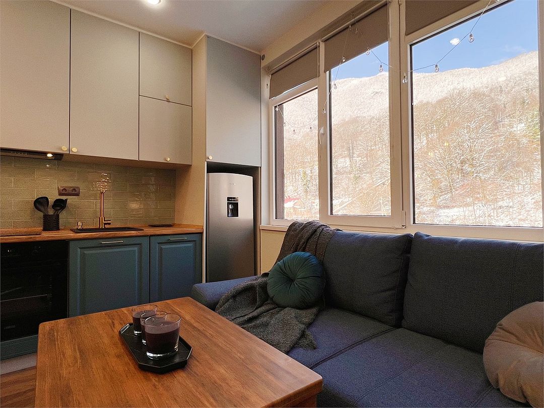 Яркая уютная квартира в самом центре Красной Поляны. Интерьер выполнен в Полянском стиле, много дерева и натуральных материалов. Большой балкон для завтраков с уютной мебелью и панорамным видом на горы. На кухне вся необходимая техника, от блендера до посудомоечной машины. В гостиной — раскладной диван 140 см, виниловый проигрыватель с большой коллекцией пластинок и подборка актуальных книг и журналов на разные темы. В спальне большая двуспальная кровать 180 см и кабинет, отделена от спальни стеной с интерьерной перегородкой, которую при необходимости можно закрыть. Отдельная гардеробная с системой хранения, где при необходимости удобно хранить багаж, вещи или горнолыжное оборудование. В паре минут пешком — вся инфраструктура посёлка Красная Поляна.Услуги и удобства