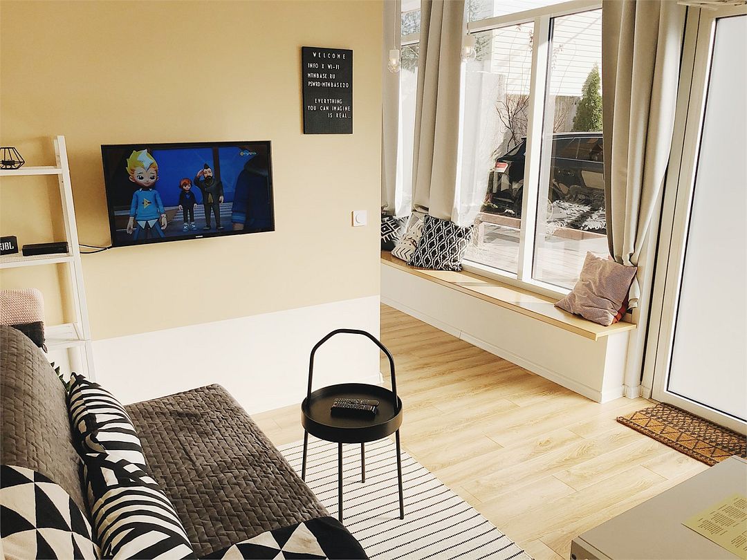 Новая светлая солнечная студия в ЖК «Зимняя сказка». Всё для визуального и эмоционального комфорта: минимализм и яркие визуальные детали сочетаются с удобством и функционализмом. Вся необходимая хорошая техника и мебель, камин. Большая двуспальная кровать-подиум и раскладной диван позволяют с комфортом разместиться 4 гостям. С небольшого балкончика открывается очень крутой вид на горы, в особенности на закате. До центра посёлка — 10 минут пешком; рядом супермаркеты, аптека, автобусная остановка.Услуги и удобства