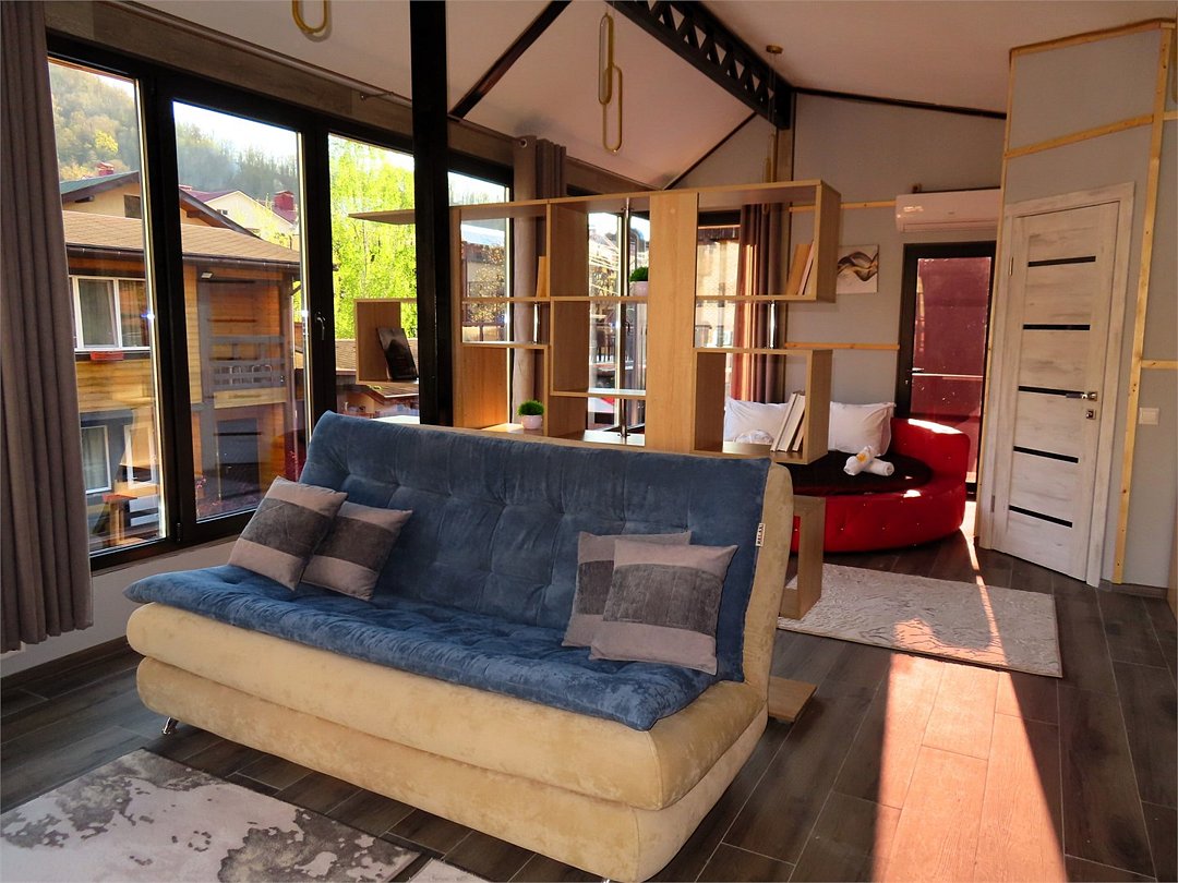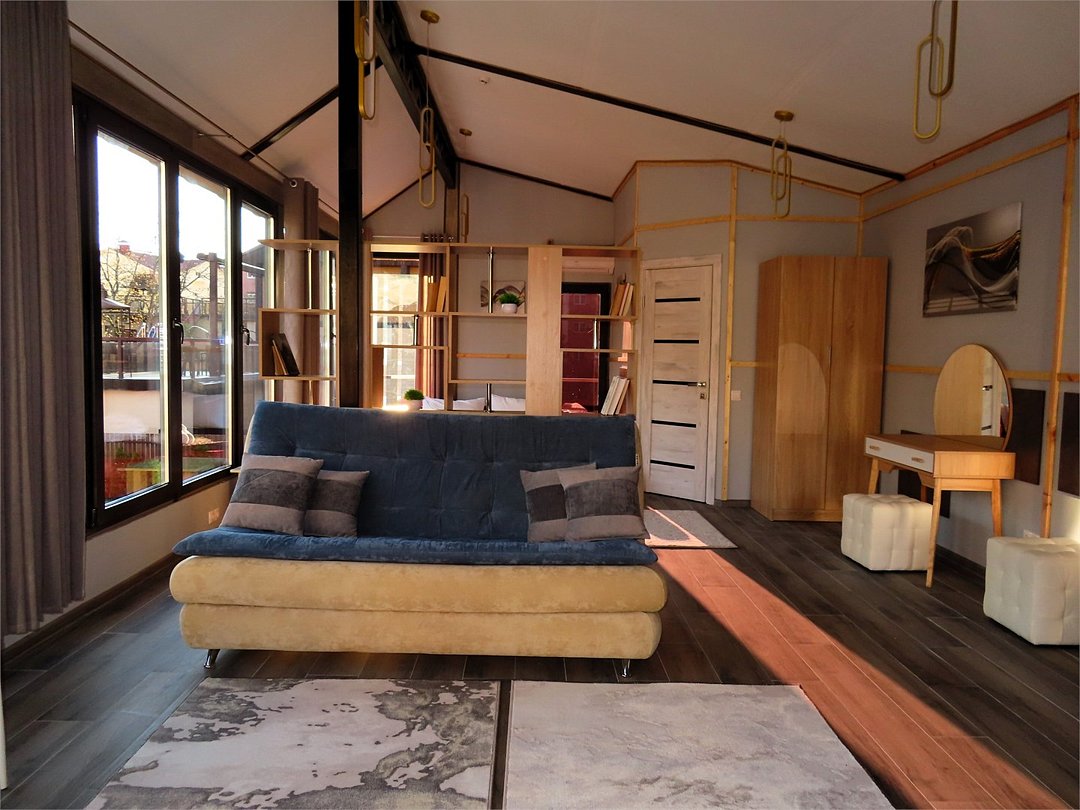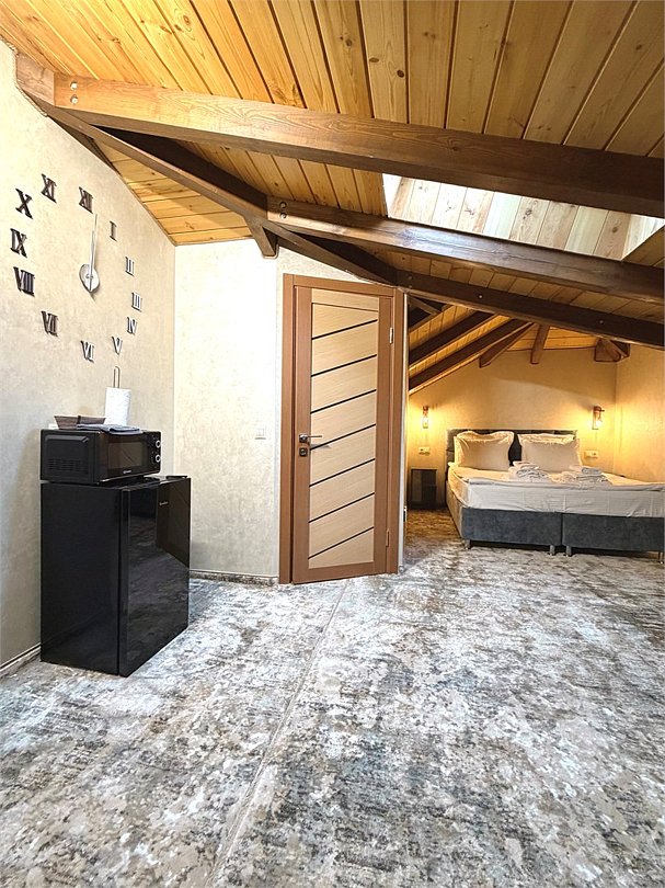 Двухкомнатный номер, в котором располагается двуспальная кровать и диван-кровать (160×200). Рассчитан до 4-х человек. В номере: мини-кухня, холодильник и микроволновая печь, кофемашина, посуда. Санузел с тропическим душем. Теплый пол, плитка. Телевизор, кондиционер, Wi-Fi.Услуги и удобства