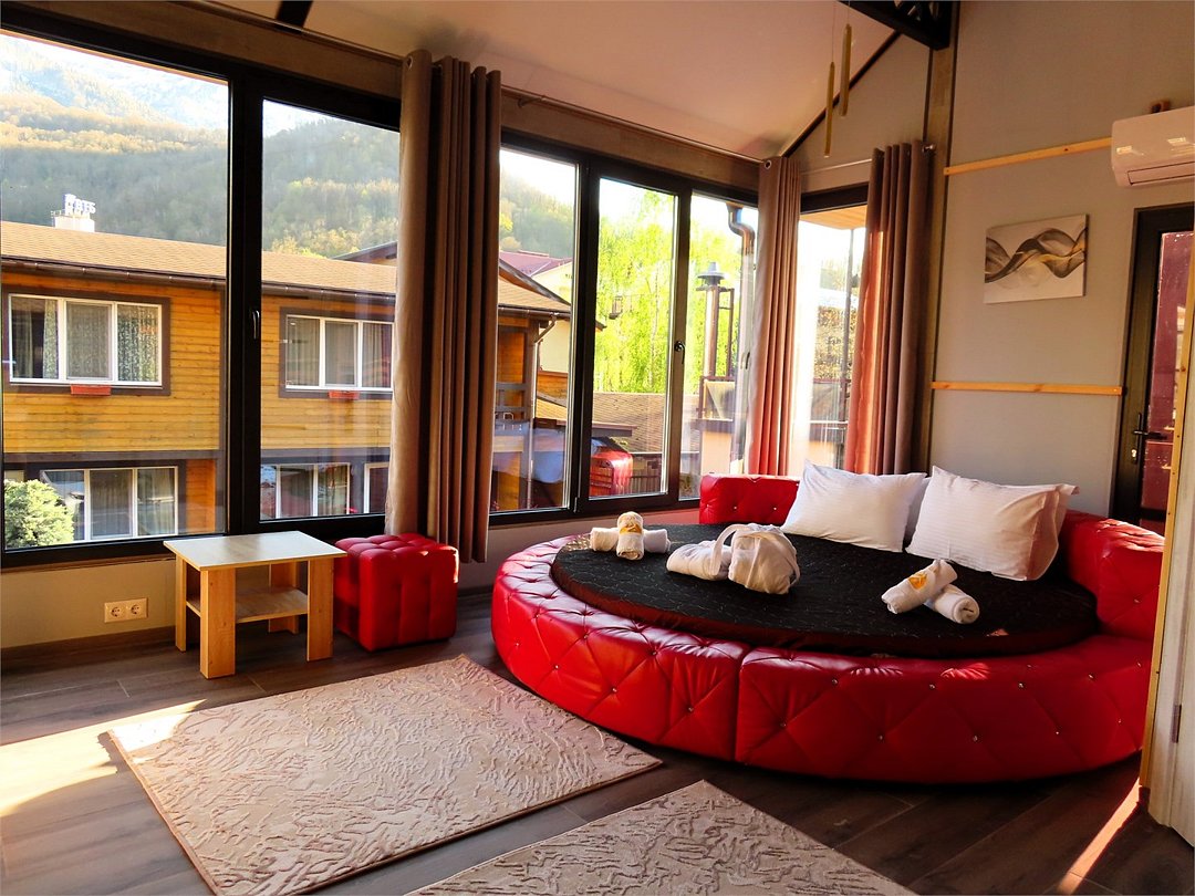 Новый просторный номер на 2м этаже с круглой двуспальной кроватью, панорамными окнами, кухонной зоной.Услуги и удобства