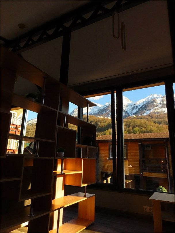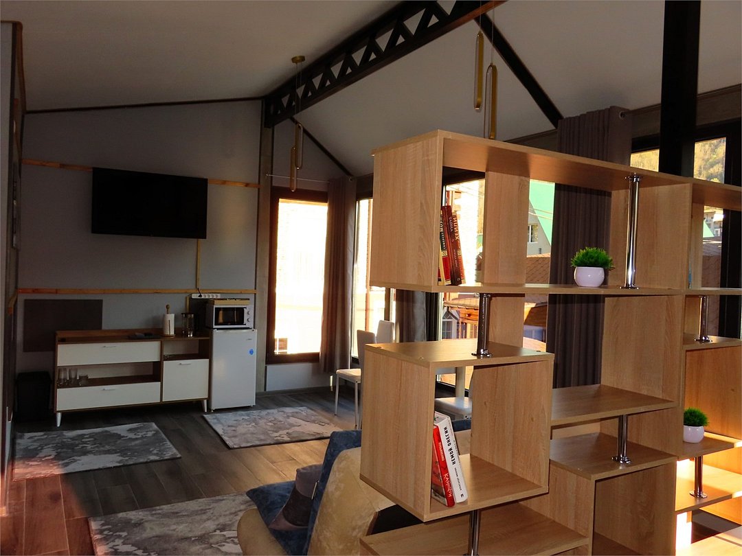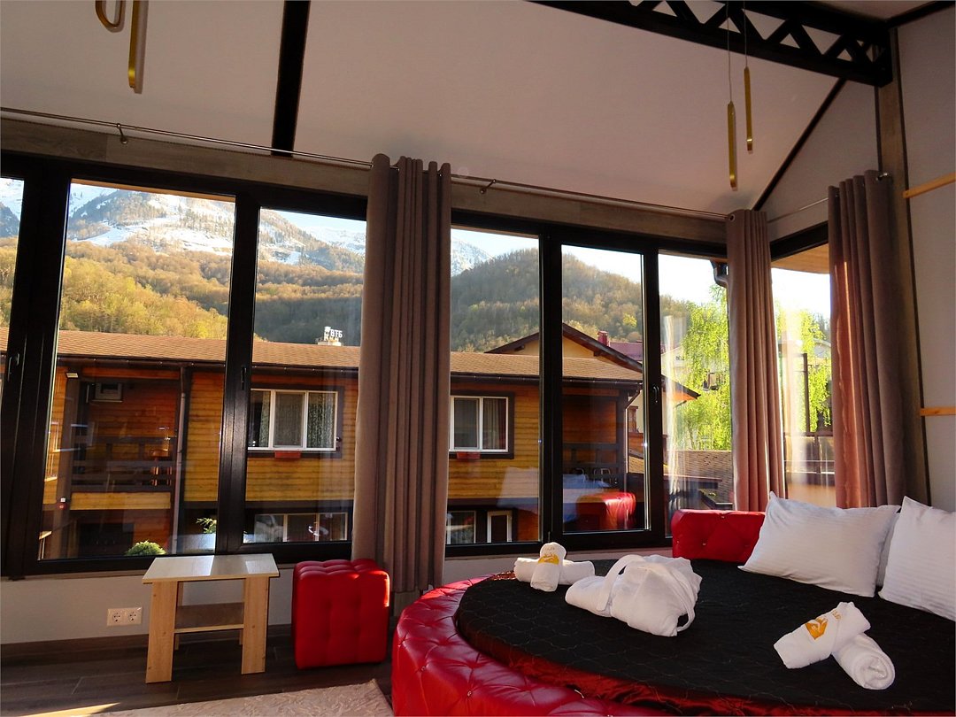 Wi-Fi, холодильник, кондиционер, микроволновая печь, банные полотенца, гигиенические средства, двуспальная кровать, тумбы, стулья, шкаф для одежды, вешалки, обеденный стол, зеркало, раковина, отдельный вход в номер, душ, вид во двор, туалет, панорамные окна, телевизор с плоским экраном, кухонный уголок, вид на горы, двуспальный раскладной диван-кровать, затемняющая штора, без питомцевВ гостиничном номере