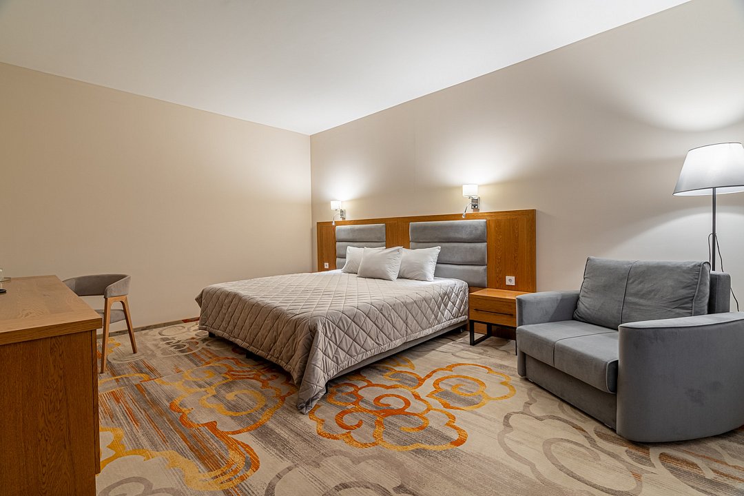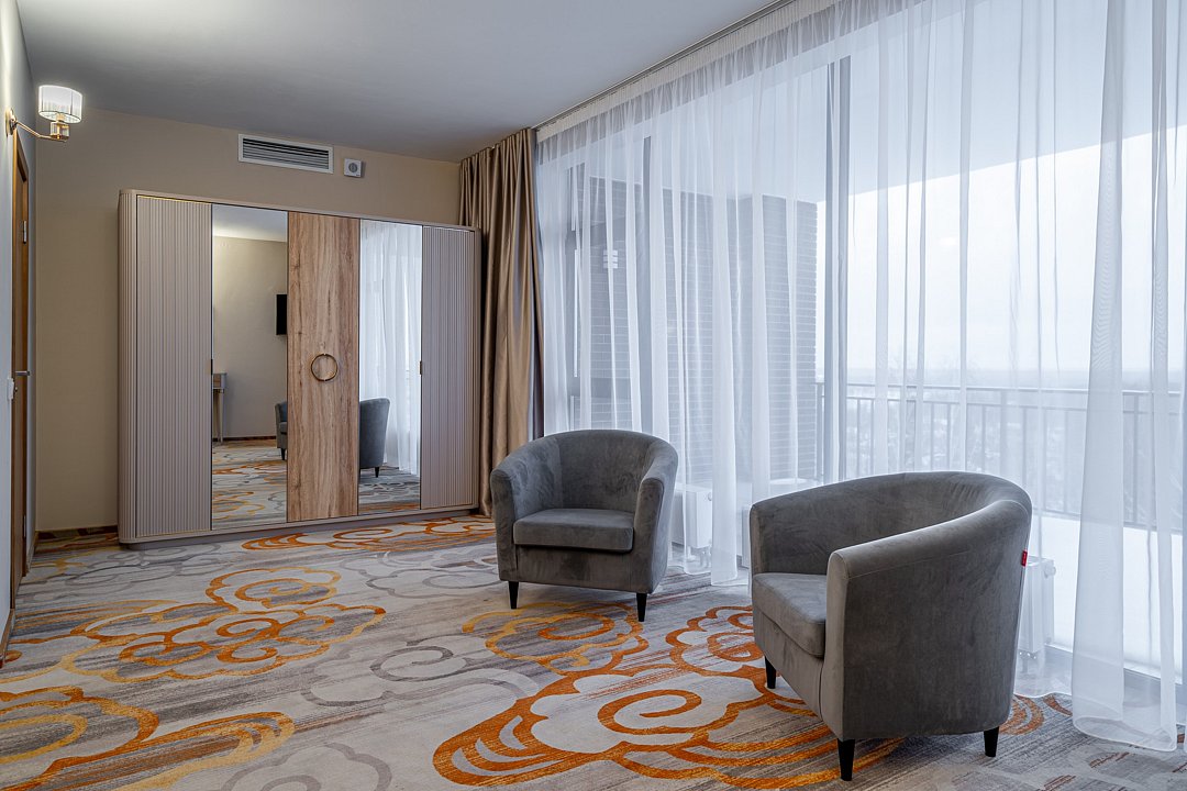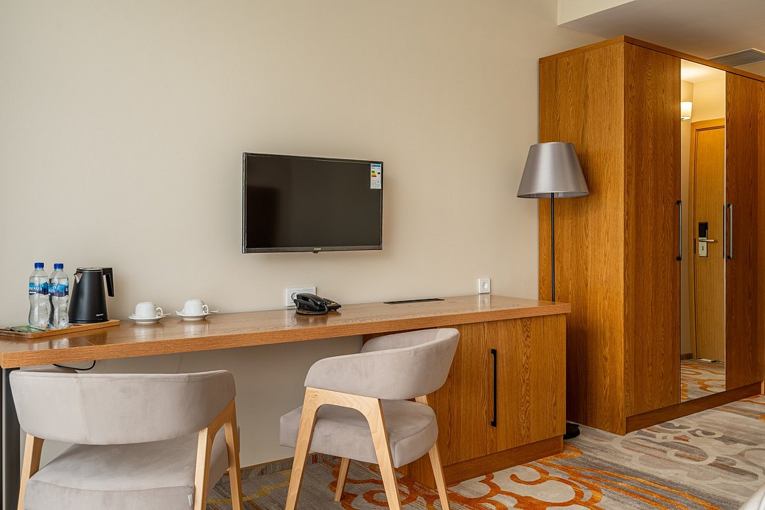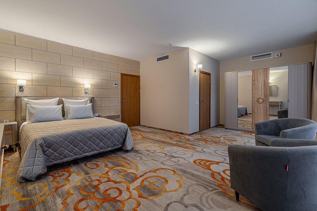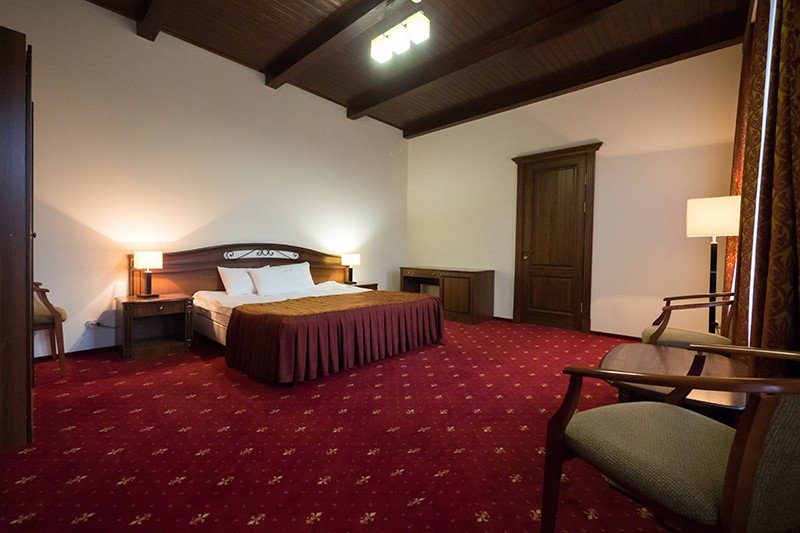 Тридцать пять квадратных метров, до четырех мест (два основных + два дополнительных): платяной шкаф, письменный стол, туалетный столик, мягкая мебель, телевизор, холодильник, санузел с душевой кабиной, халаты, тапочки, фен, средства гигиены, чайная станция, набор посуды.