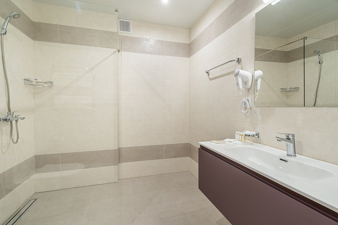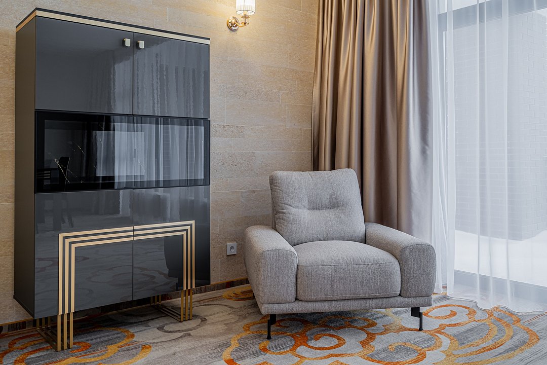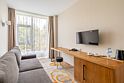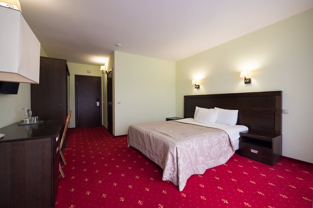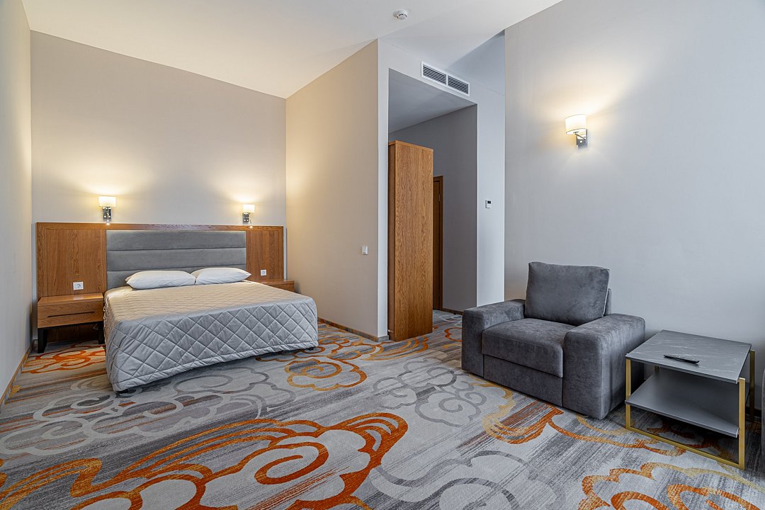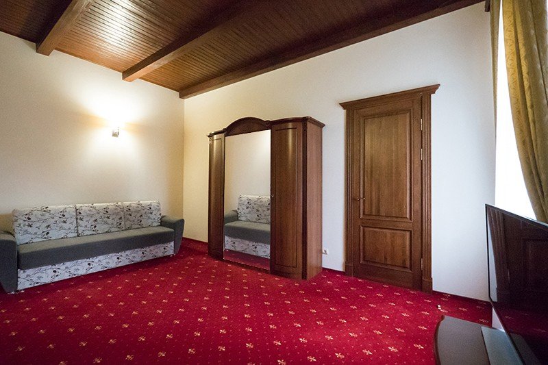 Тридцать пять квадратных метров, до четырех мест (два основных + два дополнительных): платяной шкаф, письменный стол, туалетный столик, мягкая мебель, телевизор, холодильник, санузел с душевой кабиной, халаты, тапочки, фен, средства гигиены, чайная станция, набор посуды.