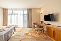 Номер площадью двадцать пять-тридцать два квадратных метра, до трех мест (два основных + одно дополнительное): балкон, панорамные окна, кондиционер, стол, два стула, торшер, платяной шкаф, чемоданница, сейф, холодильник, телевизор, телефон, чайная станция, набор посуды, санузел с душевой кабиной, фен, средства гигиены.