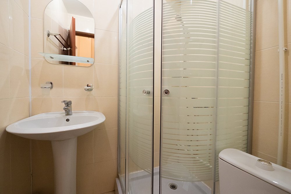 Одиннадцать квадратных метров, до двух мест: балкон, стол, стул, платяной шкаф, телевизор, холодильник, санузел с душевой кабиной, фен, средства гигиены.