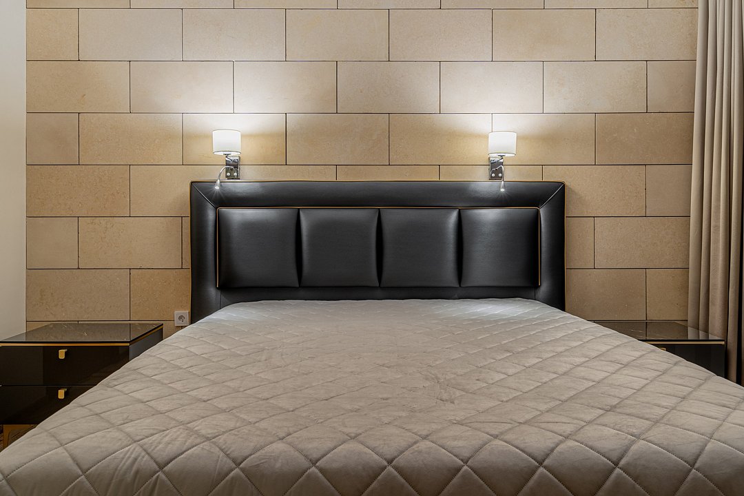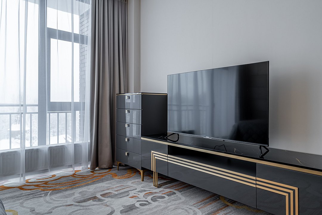 Восемьдесят пять квадратных метров, до четырех мест (два основных и два дополнительных): две комнаты, гостиная с эркерами, спальня, гостевой диван (не раскладной), туалетный столик, телевизор, мягкая мебель, холодильник, санузел с душевой кабиной и ванной, халаты, тапочки, фен, чайная станция, набор посуды, средства гигиены.
