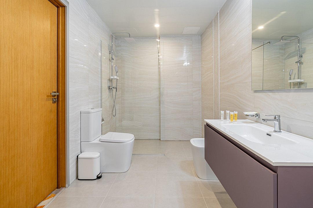 Девяносто квадратных метров, до четырех мест (два основных и два дополнительных): три комнаты, гостиная с террасой, спальня, два телевизора, мягкая мебель, мини-кухня, санузел с душевой кабиной и ванной, гостевой санузел, халаты, тапочки, фен, чайная станция, набор посуды, средства гигиены.