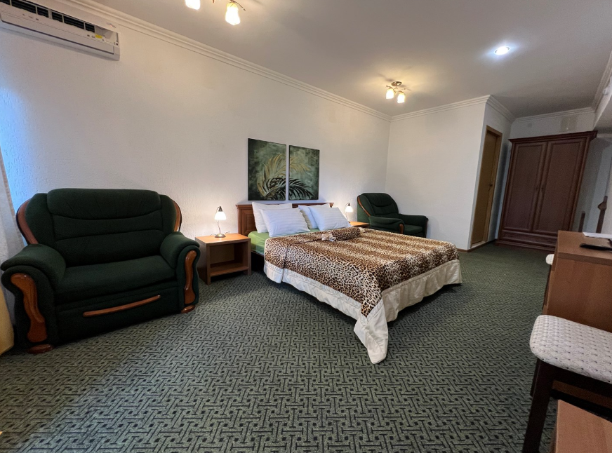 Номера оборудованы гардеробом или платяным шкафом, двуспальной кроватью, двумя прикроватными тумбочками, комодом, зеркалом, телевизором, кондиционером, необходимой осветительной арматурой.