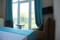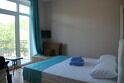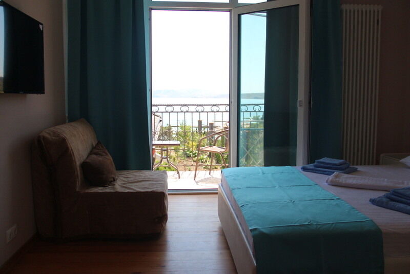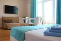 Номер с прямым видом на море, имеет двухспальную кровать с ортопедическим матрасом и раскладной диван.