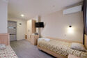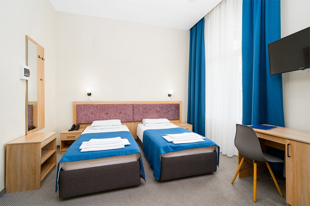 Wi-Fi, кондиционер, душевая кабина, балкон, две односпальные кровати, шкаф для одежды, вешалки, унитаз, раковина, кулер на этаже, внутренний телефон, телевизор с плоским экраном, мини-холодильник, можно с питомцамиВ номере