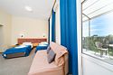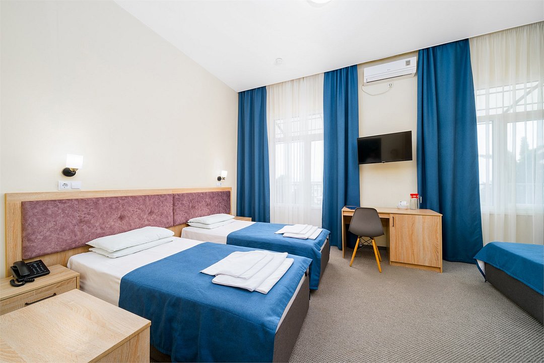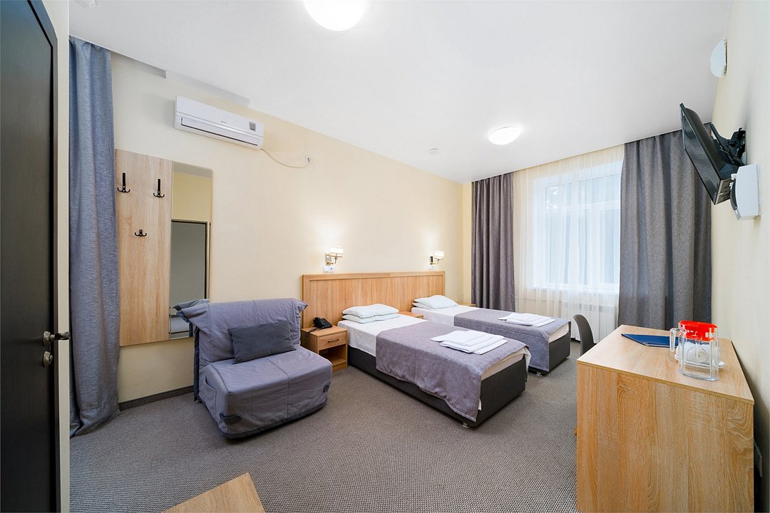 Wi-Fi, кондиционер, душевая кабина, банные полотенца, пляжные полотенца, балкон, диван, шкаф для одежды, вешалки, багажная тумба, унитаз, раковина, кулер на этаже, три односпальные кровати, стул, диван-кровать, внутренний телефон, телевизор с плоским экраном, мини-холодильник, затемняющая штора, можно с питомцамиВ номере