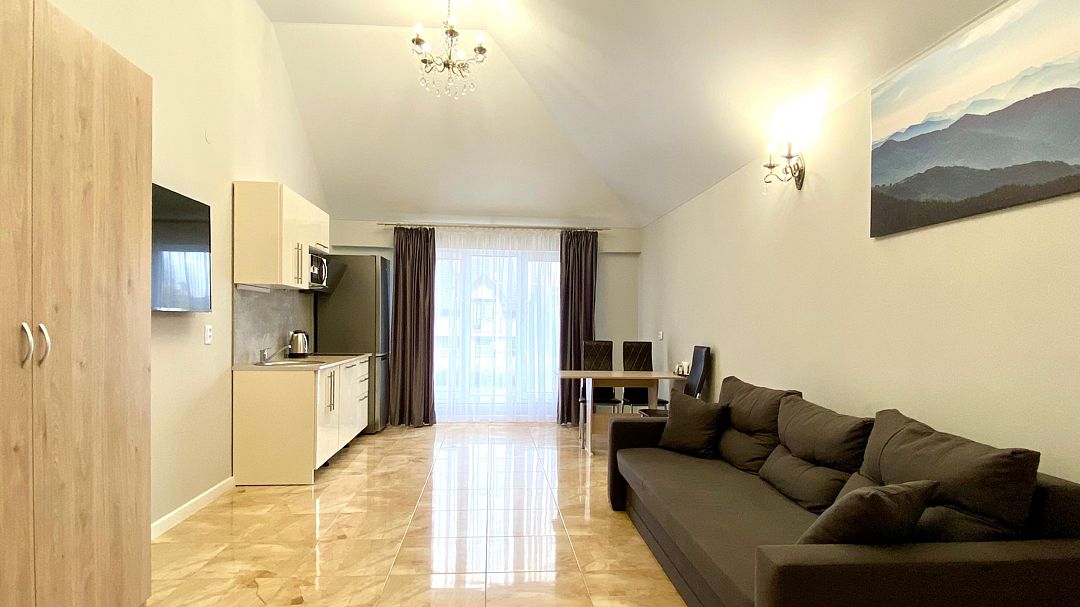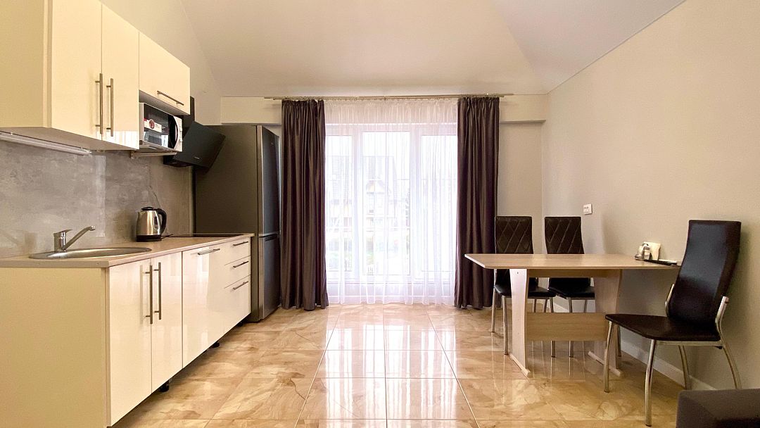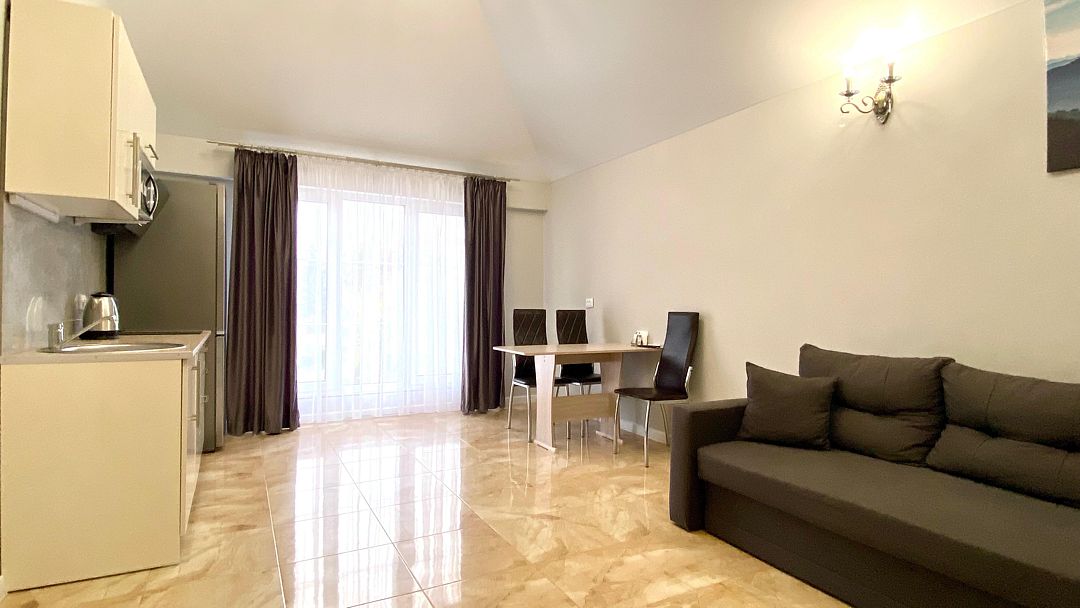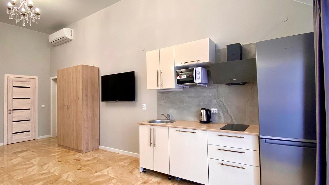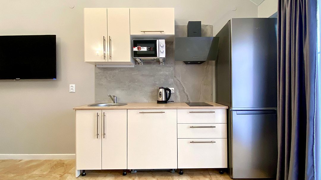 Номер обставлен новой мебелью и оборудован современной техникой. В вашем распоряжении телевизор, чайник, холодильник, микроволновая печь, посуда и фен.