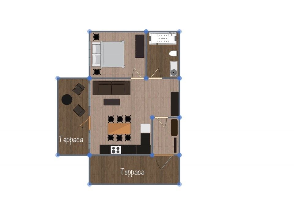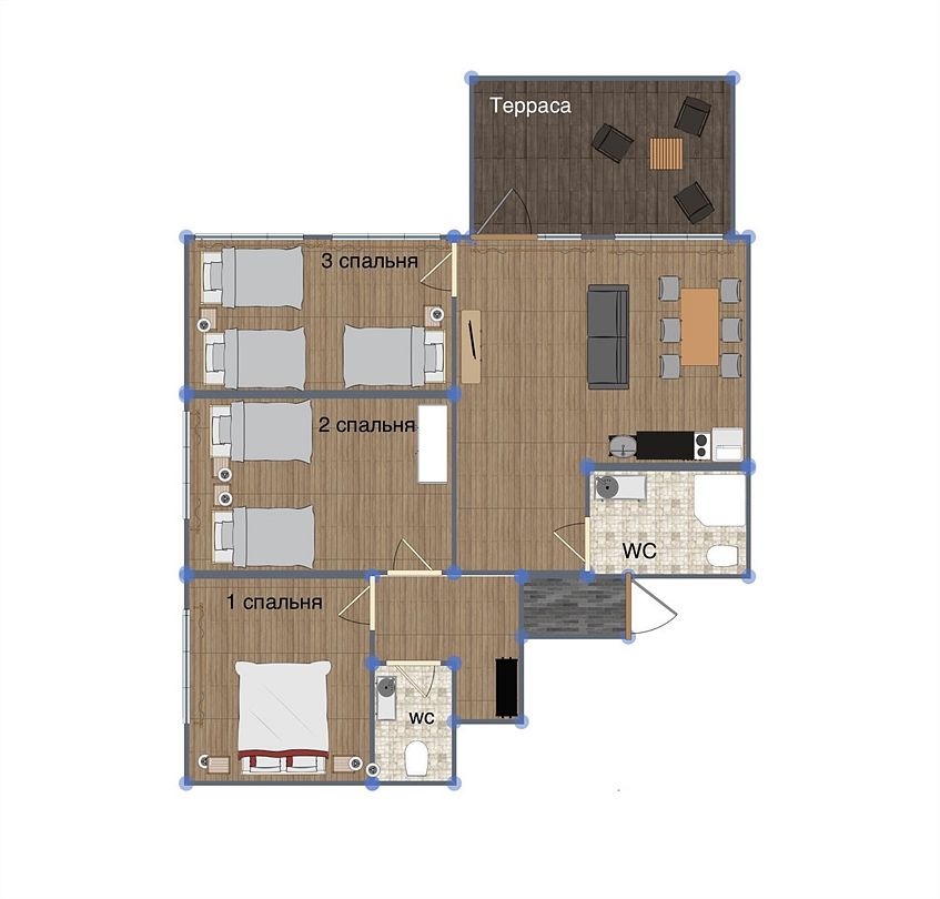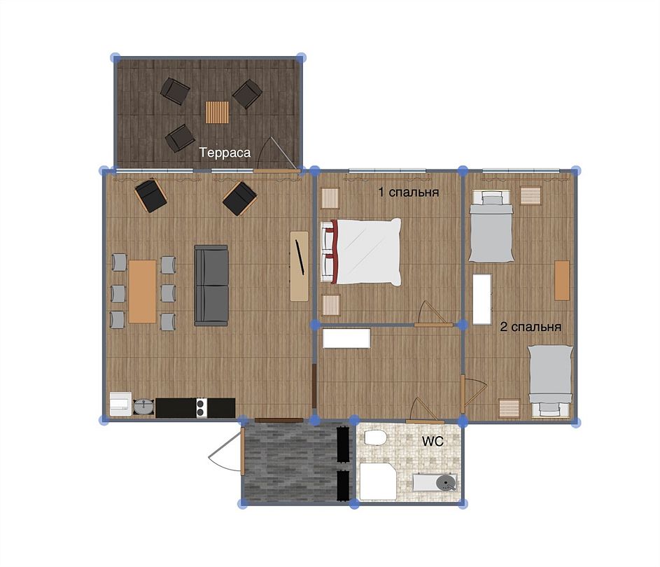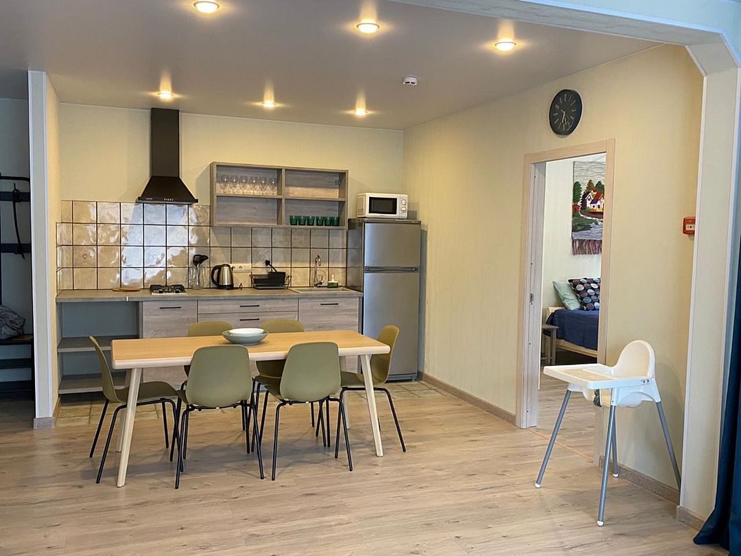 - 2 спальни с большой и раздельными кроватями, кухня-гостиная;