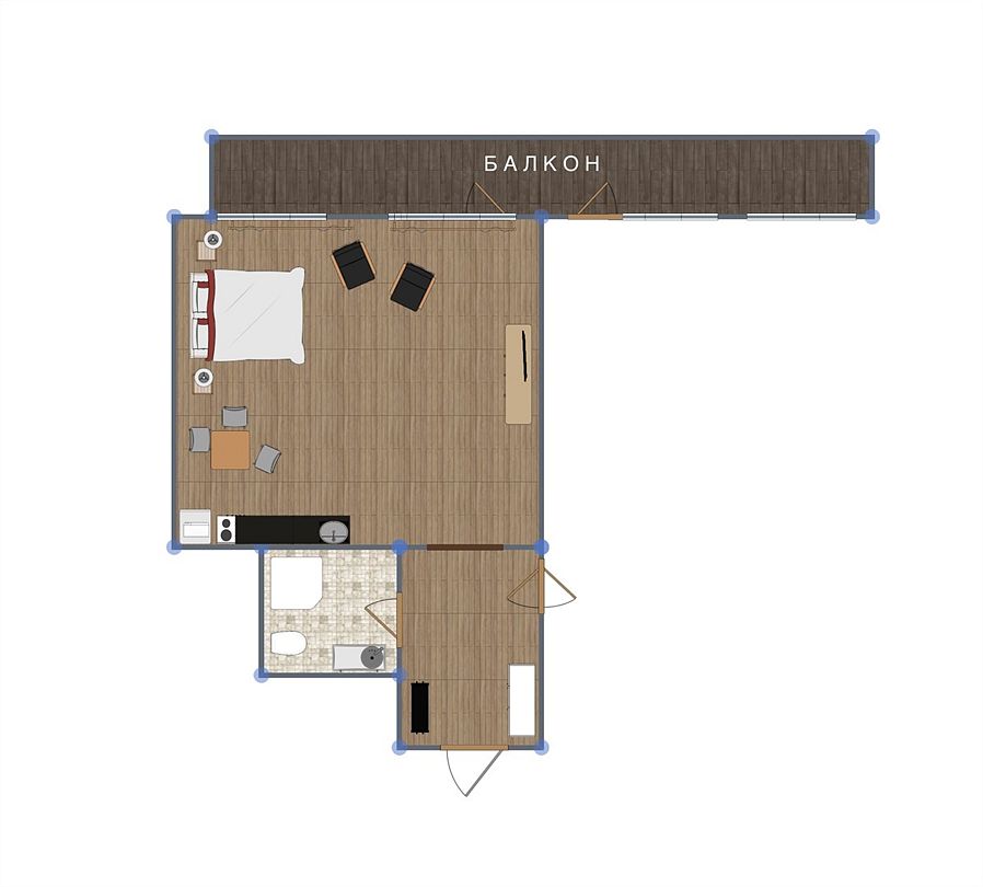 Студия с полностью оборудованной кухонной зоной и большим балконом. Возможно объединение 2 студий в один номер. Новый семейный корпус. Открыт в июне 2022. Всего 8 апартаментов корпусе.