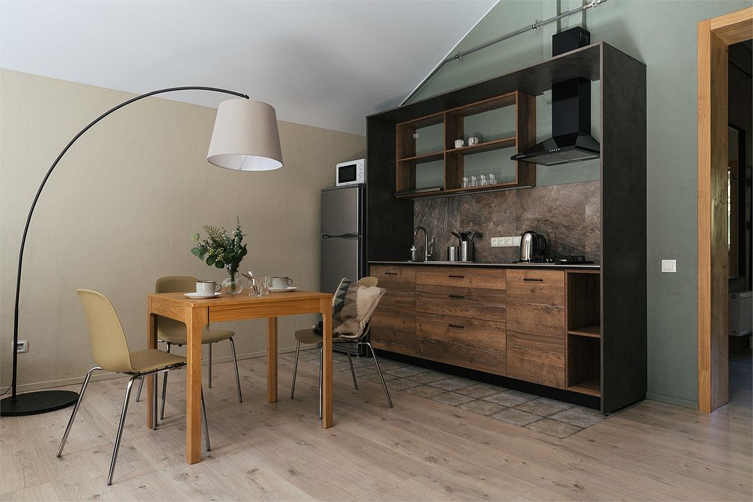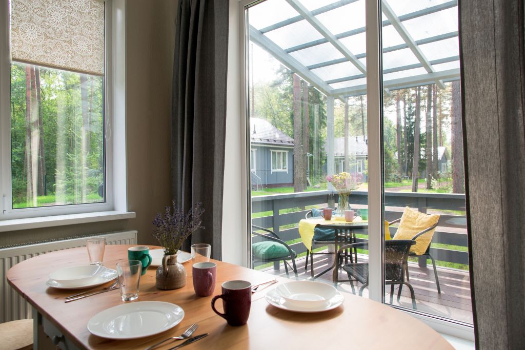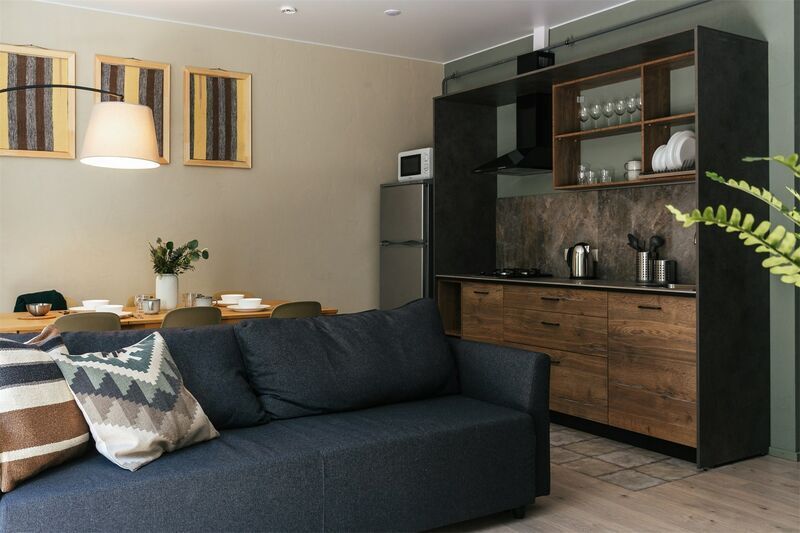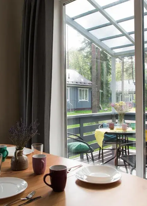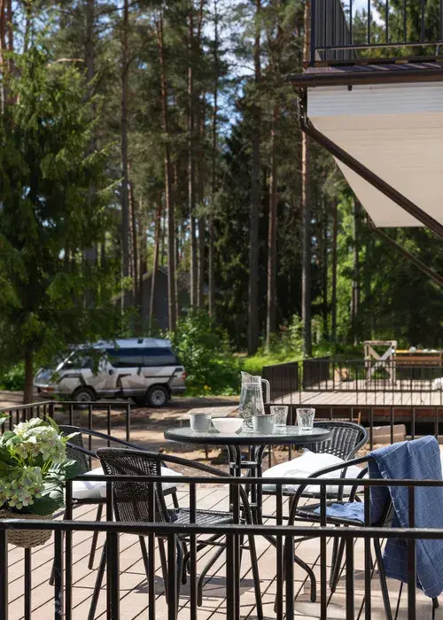 Всё очень стильно и экологично - интерьер в скандинавском стиле, у каждого домика/номера своя терраса или выход на балкон с выходом на улицу - при желании с соседями можно не пересекаться. В каждом домике/ квартире есть своя кухня и всё необходимое для готовки.