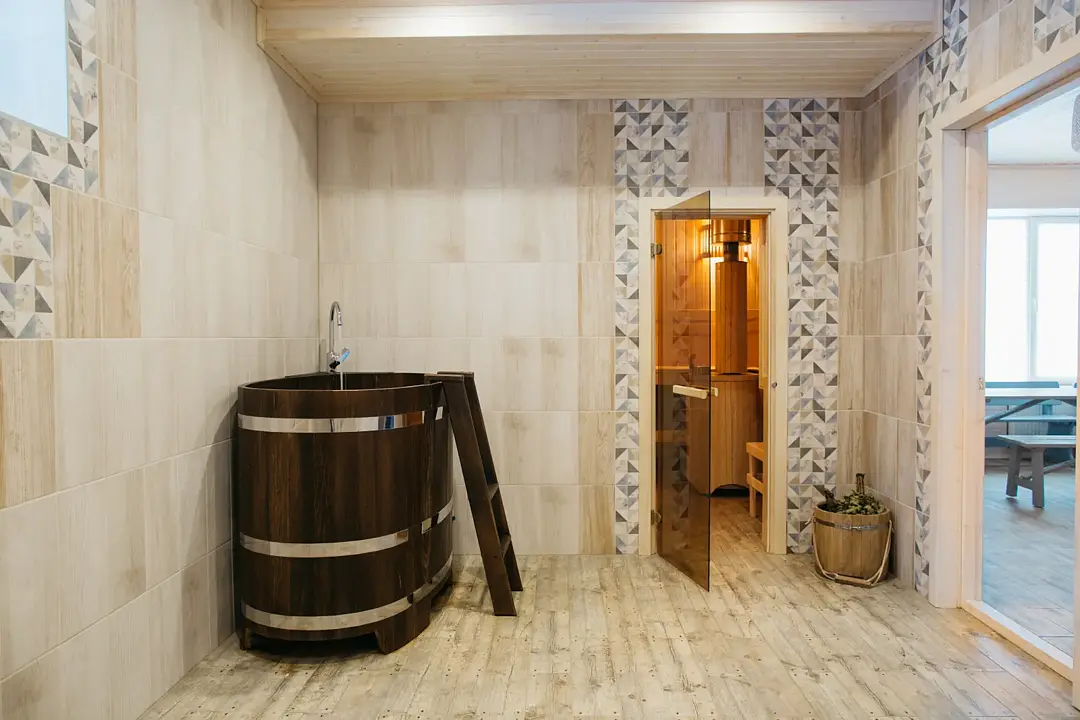 В бане: отдельный вход, комната отдыха, купель.