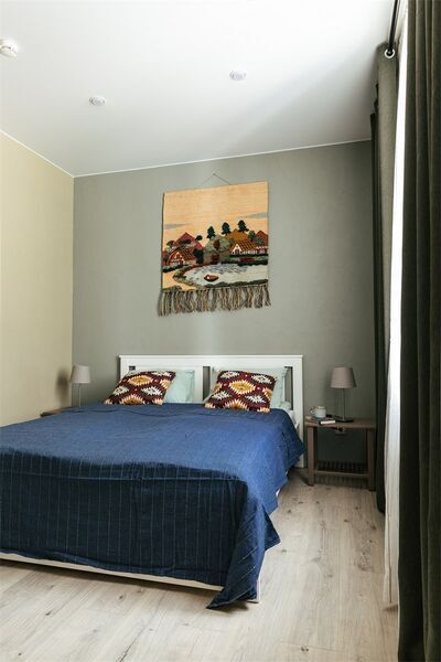 - 1 спальня с большой кроватью и гостиная с зоной кухни;