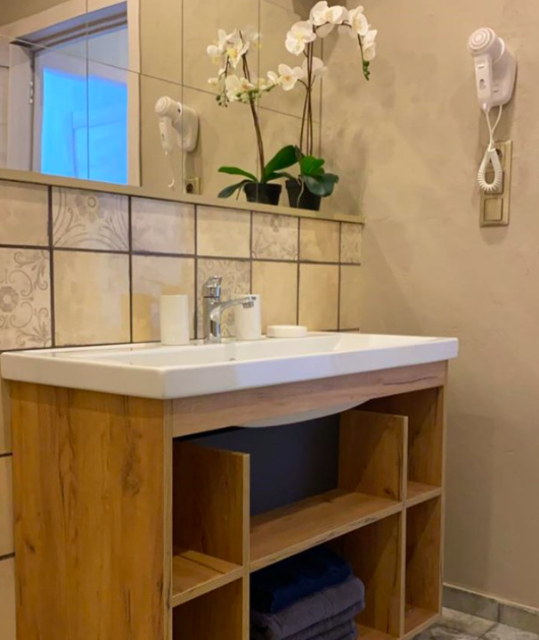 - [ ] Фен в ванной есть, мощный. Полотенца есть на каждого как большие, так и маленькие. Тапочки.