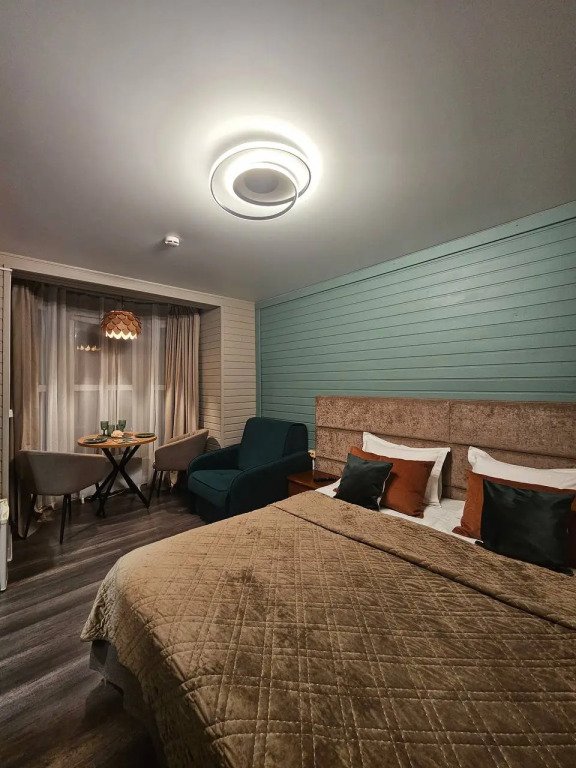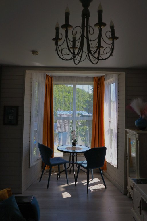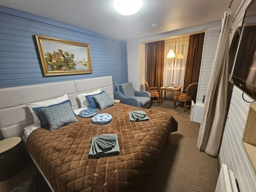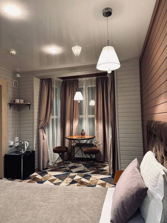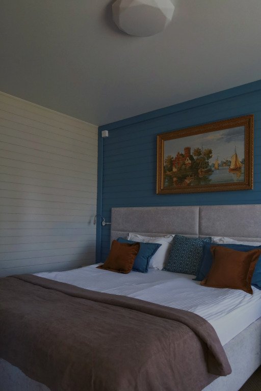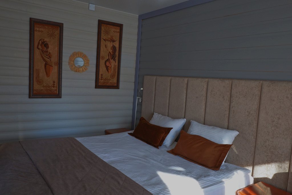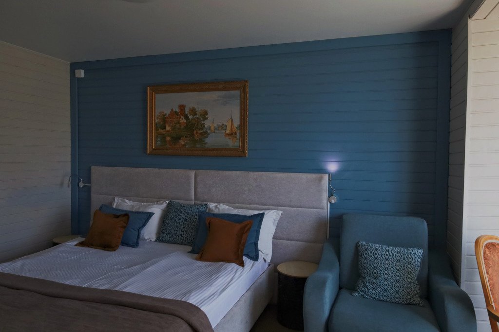 В оформлении номеров использованы натуральные материалы. Каждый номер оснащён панорамными окнами с видом на реку или сад.