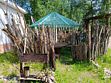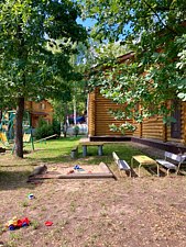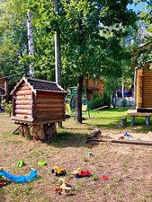 Двухэтажный сруб с отгороженной территорией, где имеется мангальная зона и столы. За дополнительную плату можно арендовать баню или банный комплекс (минимум 2 часа).